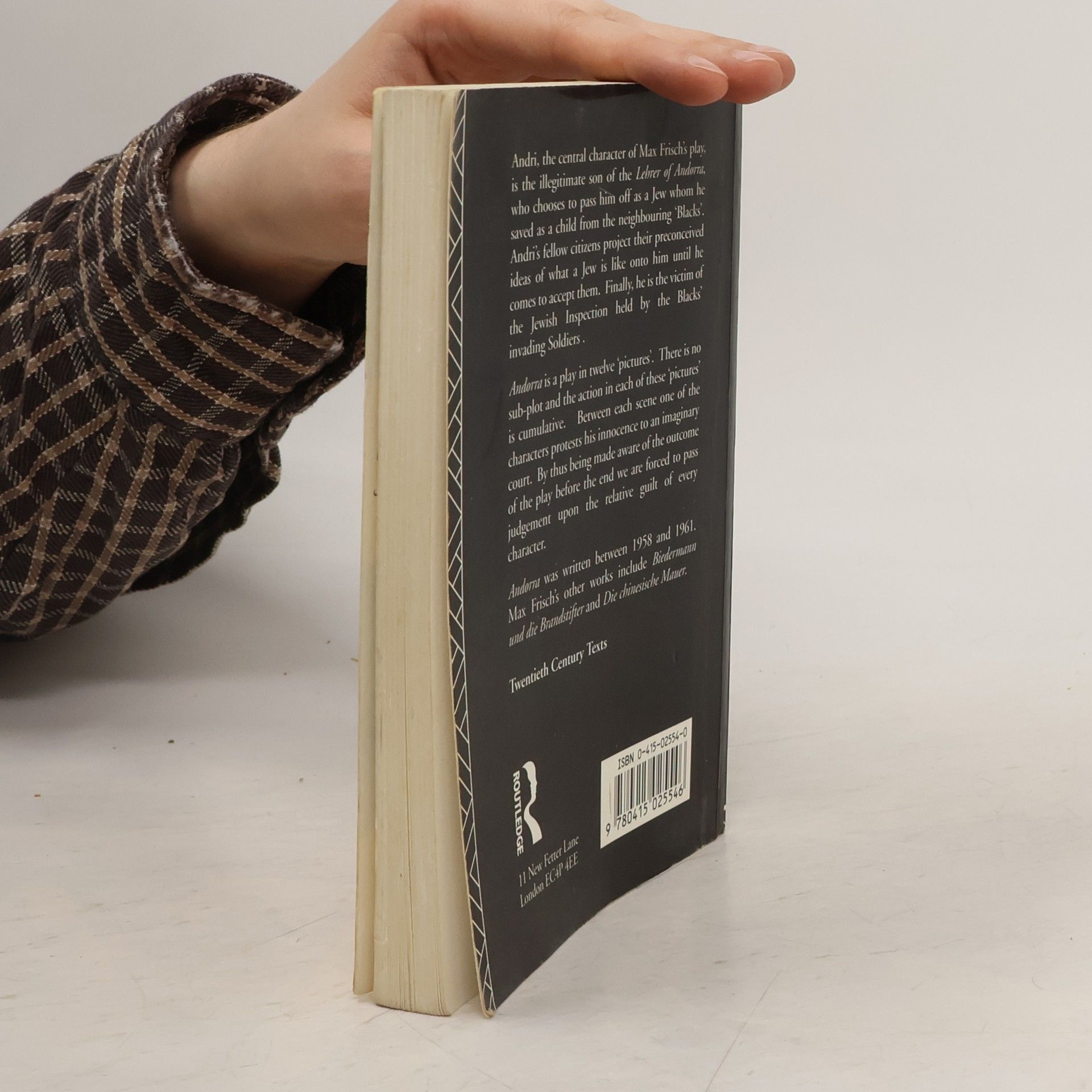 Andri, the central character of Max Frisch's play, is the illegitimate son of the Lehrer of Andorra , who chooses to pass him off as a Jew whom he saved as a child from the neighbouring 'Blacks'. Andri's fellow citizens project their preconceived ideas of what a Jew is like onto him until he comes to accept the. Finally, he is the victim of the Jewish Inspection held by the Blacks' invading Soldiers. Andorra is a play in twelve 'pictures'. There is no sub-plot and the action in each of these 'pictures' is cumulative. Between each scene one of the characters protests his innocence to an imaginary court. By thus being made aware of the outcome of the play before the end we are forced to pass judgement upon the relative guilt of every character. Andora was written between 1958 and 1961. Max Frisch's other works include Biedermann und die Brandstifter and Die chinesische Mauer .