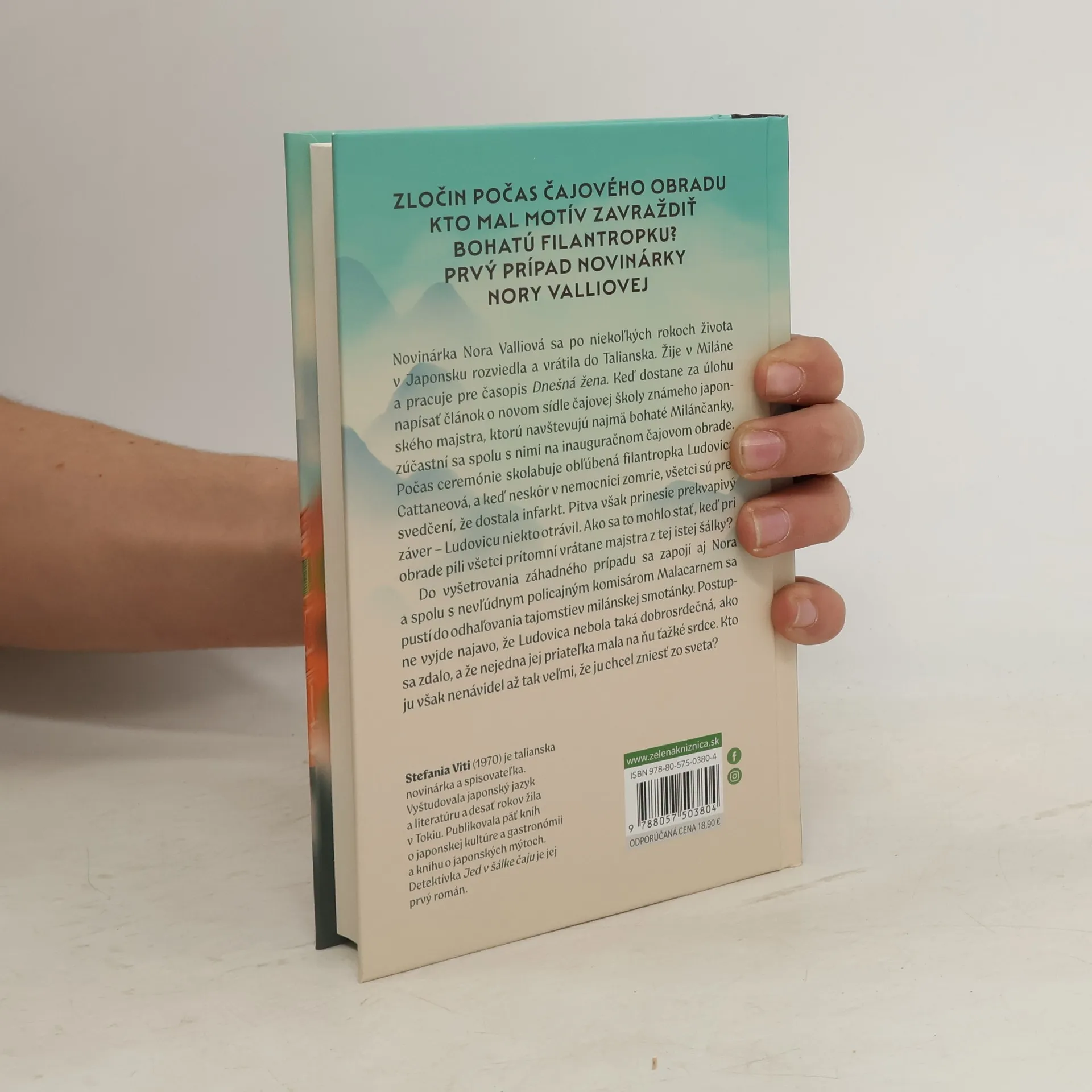 Zločin počas čajového obradu Kto mal motív zavraždiť bohatú filantropku? Prvý prípad novinárky Nory Valliovej Novinárka Nora Valliová sa po niekoľkých rokoch života v Japonsku rozviedla a vrátila do Talianska. Žije v Miláne a pracuje pre časopis Dnešná žena. Keď dostane za úlohu napísať článok o novom sídle čajovej školy známeho japonského majstra, ktorú navštevujú najmä bohaté Milánčanky, zúčastní sa spolu s nimi na inauguračnom čajovom obrade. Počas ceremónie skolabuje obľúbená filantropka Ludovica Cattaneová, a keď neskôr v nemocnici zomrie, všetci sú presvedčení, že dostala infarkt. Pitva však prinesie prekvapivý záver – Ludovicu niekto otrávil. Ako sa to mohlo stať, keď pri obrade pili všetci prítomní vrátane majstra z tej istej šálky? Do vyšetrovania záhadného prípadu sa zapojí aj Nora a spolu s nevľúdnym policajným komisárom Malacarnem sa pustí do odhaľovania tajomstiev milánskej smotánky. Postupne vyjde najavo, že Ludovica nebola taká dobrosrdečná, ako sa zdalo, a že nejedna jej priateľka mala na ňu ťažké srdce. Kto ju však nenávidel až tak veľmi, že ju chcel zniesť zo sveta?