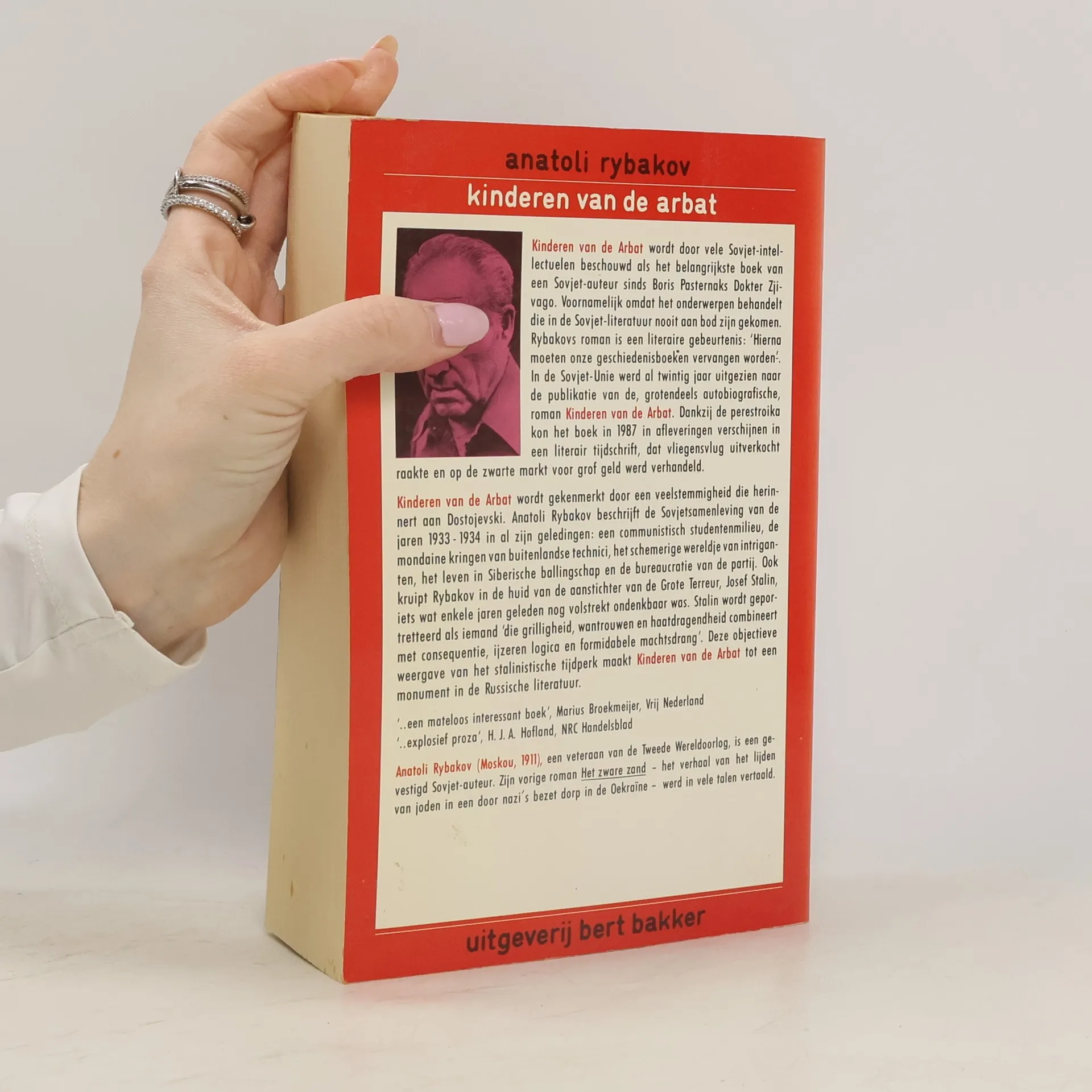 <i>Kinderen van de Arbat</i> wordt door vele Sovjet-intellectuelen beschouwd als het belangrijkste boek van een Sovjet-auteur sinds Boris Pasternaks <i>Dokter Zjivago</i>. Voornamelijk omdat het onderwerpen behandelt die in de Sovjet-literatuur nooit aan bod zijn gekomen. Rybakovs roman is een literaire gebeurtenis: ‘Hierna moeten onze geschiedenisboeken vervangen worden’. In de Sovjet-Unie werd al twintig jaar uitgezien naar de publicatie van de, grotendeels autobiografische, roman <i>Kinderen van de Arbat</i>. Dankzij de perestrojka kon het boek in 1987 in afleveringen verschijnen in een literair tijdschrift, dat vliegensvlug uitverkocht raakte en op de zwarte markt voor grof geld werd verhandeld. <i>Kinderen van de Arbat</i> wordt gekenmerkt door een veelstemmigheid die herinnert aan Dostojevski. Anatoli Rybakov beschrijft de Sovjetsamenleving van de jaren 1933-1934 in al zijn geledingen: een communistisch studentenmilieu, de mondaine kringen van buitenlandse technici, het schemerige wereldje van intriganten, het leven in Siberische ballingschap en de bureaucratie van de partij. Ook kruipt Rybakov in de huid van de aanstichter van de Grote Terreur, Josef Stalin, iets wat enkele jaren geleden nog volstrekt ondenkbaar was. Stalin wordt geportretteerd als iemand die ‘grilligheid, wantrouwen en haatdragendheid combineert met consequentie, ijzeren logica en formidabele machtsdrang’. Deze objectieve weergave van het stalinistische tijdperk maakt <i>Kinderen van de Arbat</i> tot een monument in de Russische literatuur.