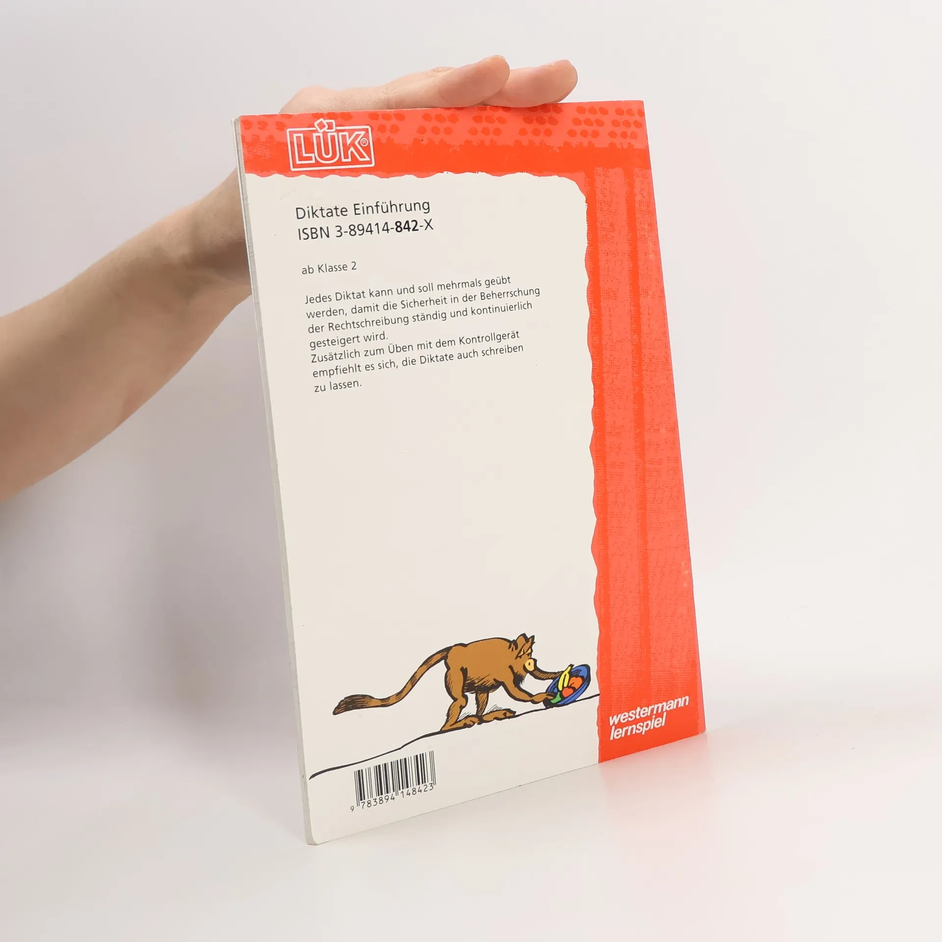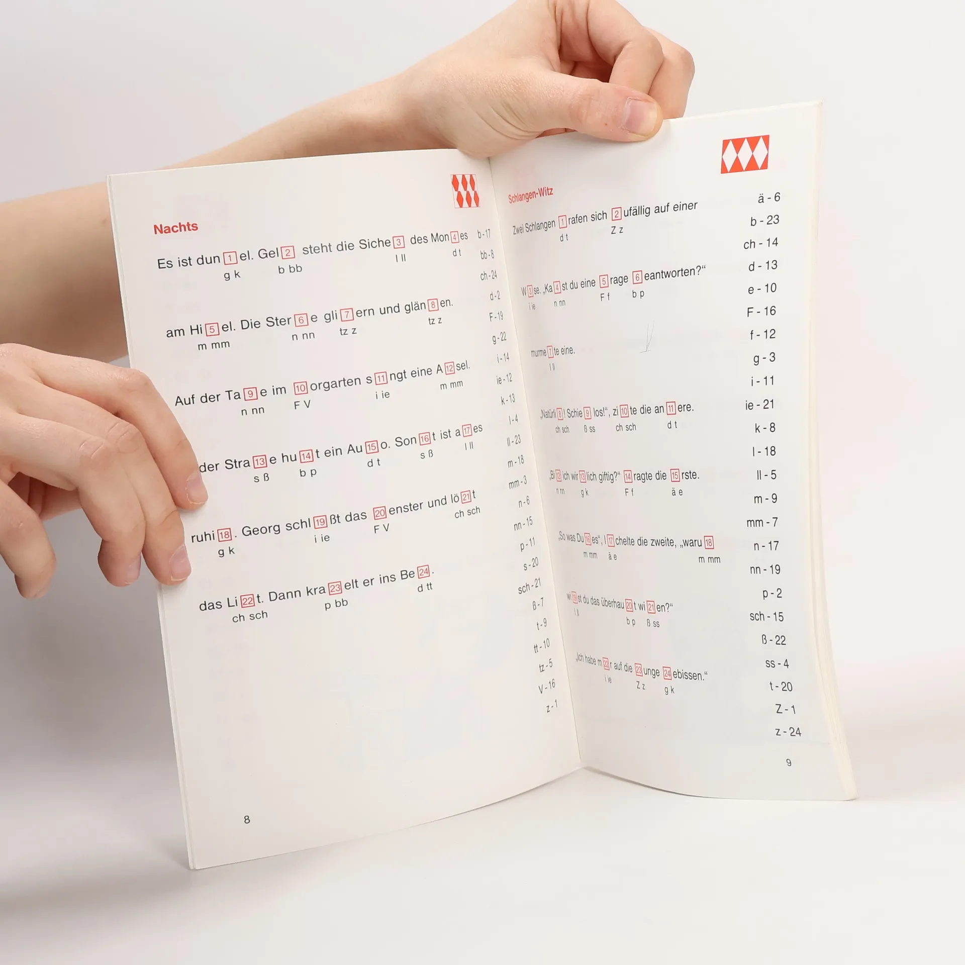 Self-correcting German language workbook for grades 2 and up. Exercises include choosing proper letters to complete spelling of words found in sentences and paragraphs.