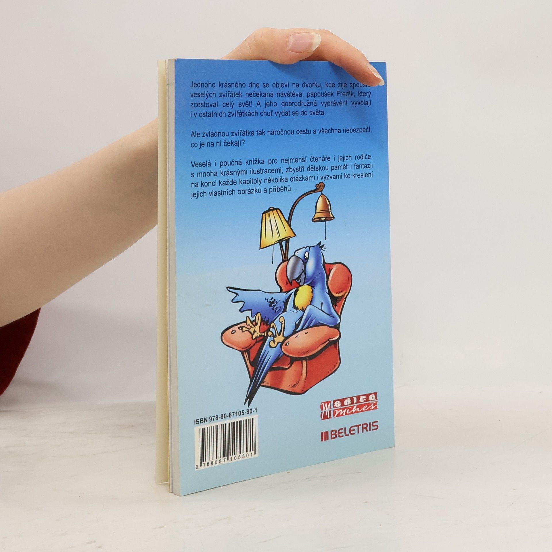Jednoho krásného dne se objeví na dvorku, kde žije spousta veselých zvířátek nečekaná návštěva: papoušek Fredík, který zcestoval celý svět! A jeho dobrodružná vyprávění vyvolají i v ostatních zvířátkách chuť vydat se do světa… Ale zvládnou zvířátka tak náročnou cestu a všechna nebezpečí, co je na ní čekají? Veselá i poučná knížka pro nejmenší čtenáře i jejich rodiče, s mnoha krásnými ilustracemi, zbystří dětskou paměť i fantazii na konci každé kapitoly několika otázkami i výzvami ke kreslení jejich vlastních obrázků a příběhů… Doporučeno dětem od 4 let.
