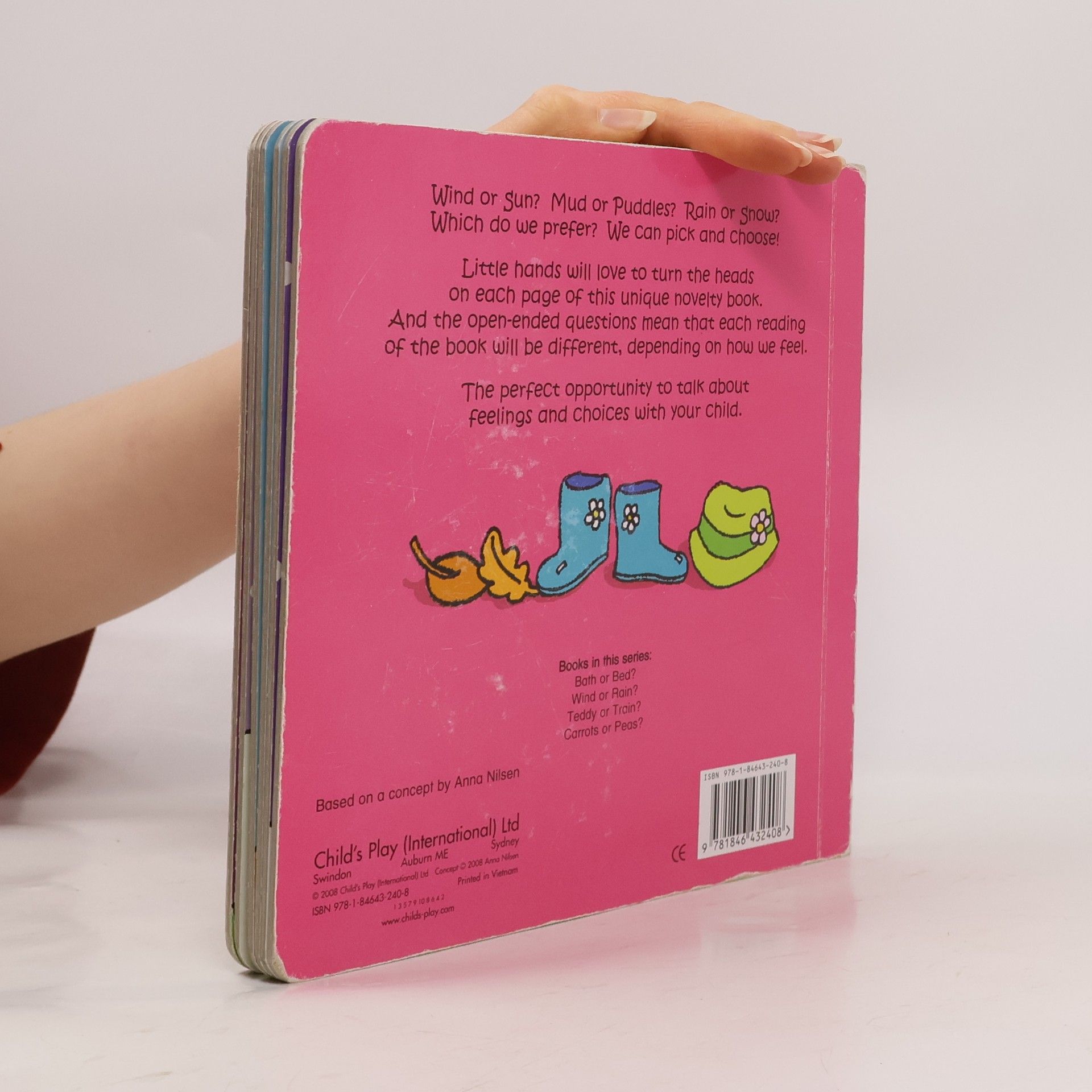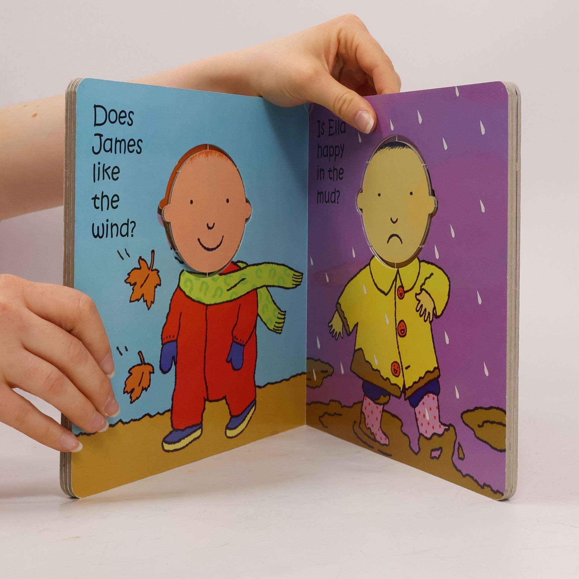 Wind or Rain? Which do you prefer? You can pick and choose! Rotate the child's head on each page to show if they are happy or sad. What about you? Open-ended questions mean that each reading of the book will be different. A fantastic tool for encouraging discussion between parent and child about feelings and choices.