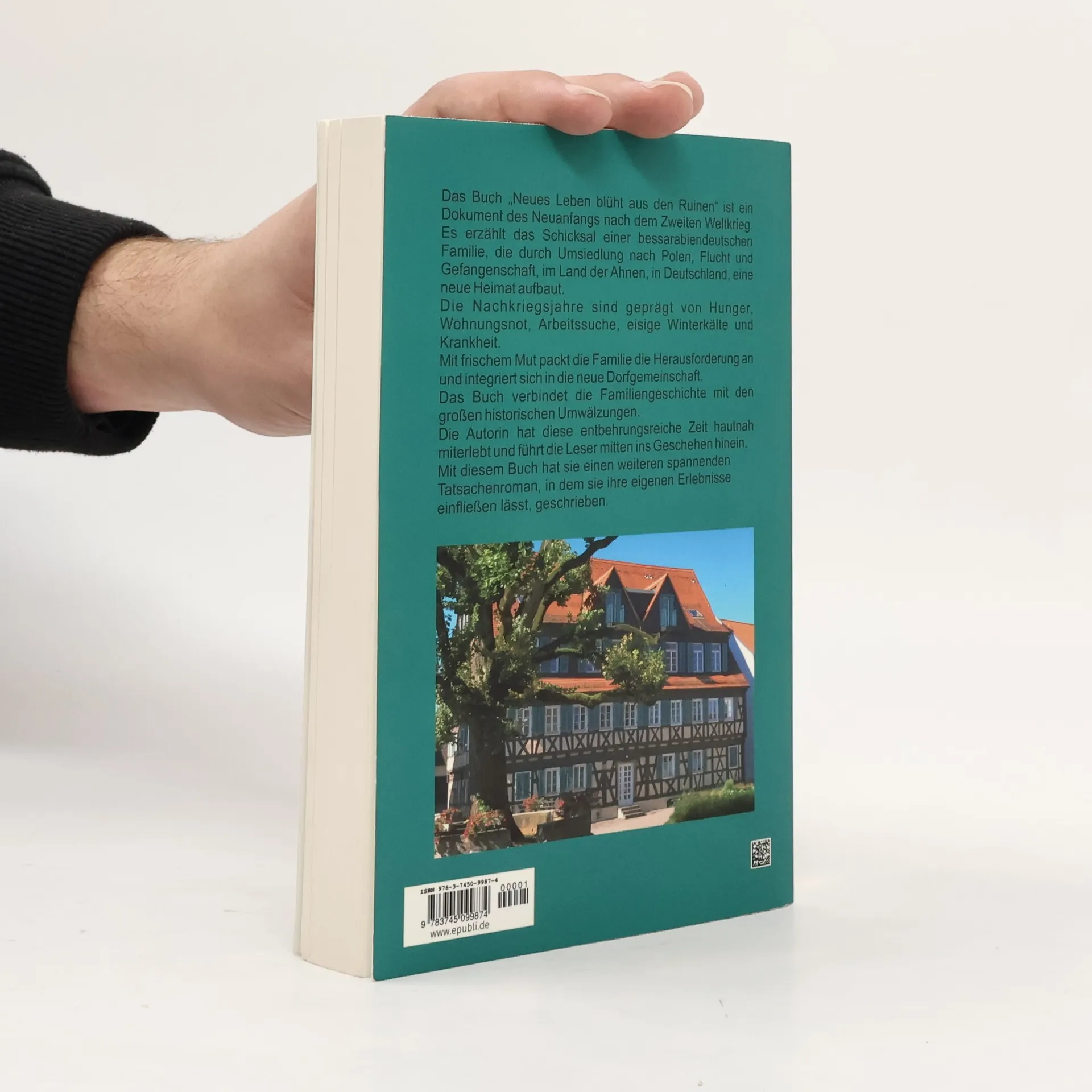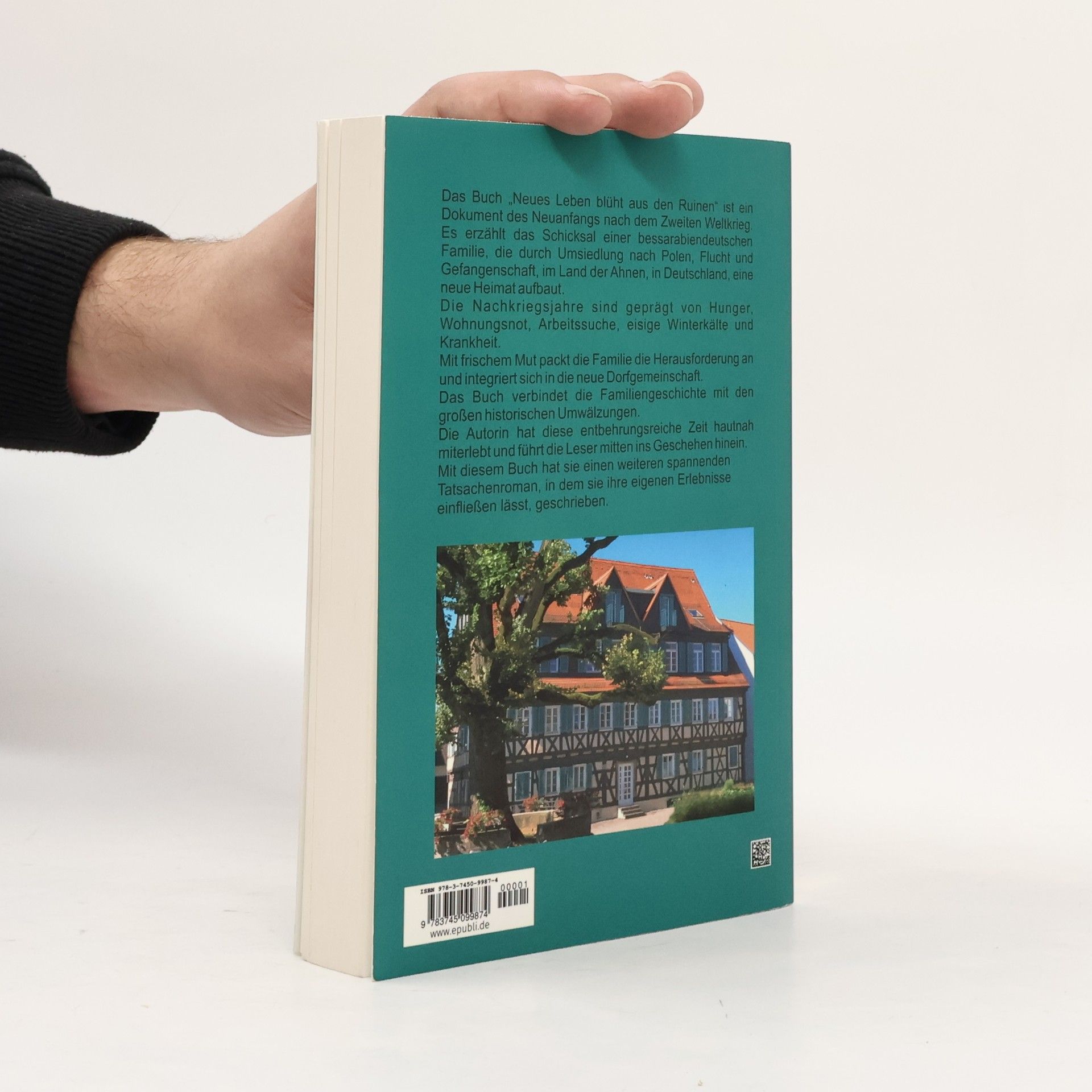 Das Buch „Neues Leben blüht aus den Ruinen“ ist ein Dokument des Neuanfangs nach dem Zweiten Weltkrieg. Es erzählt das Schicksal einer bessarabiendeutschen Familie, die durch Umsiedlung nach Polen, Flucht und Gefangenschaft, im Land der Ahnen, in Deutschland, eine neue Heimat aufbaut. Die Nachkriegsjahre sind geprägt von Hunger, Wohnungsnot, Arbeitssuche, eisige Winterkälte und Krankheit. Mit frischem Mut packt die Familie die Herausforderung an und integriert sich in die neue Dorfgemeinschaft. Das Buch verbindet die Familiengeschichte mit den großen historischen Umwälzungen. Die Autorin hat diese entbehrungsreiche Zeit hautnah miterlebt und führt die Leser mitten ins Geschehen hinein. Mit diesem Buch hat sie einen weiteren spannenden Tatsachenroman, in dem sie ihre eigenen Erlebnisse einfließen lässt, geschrieben.