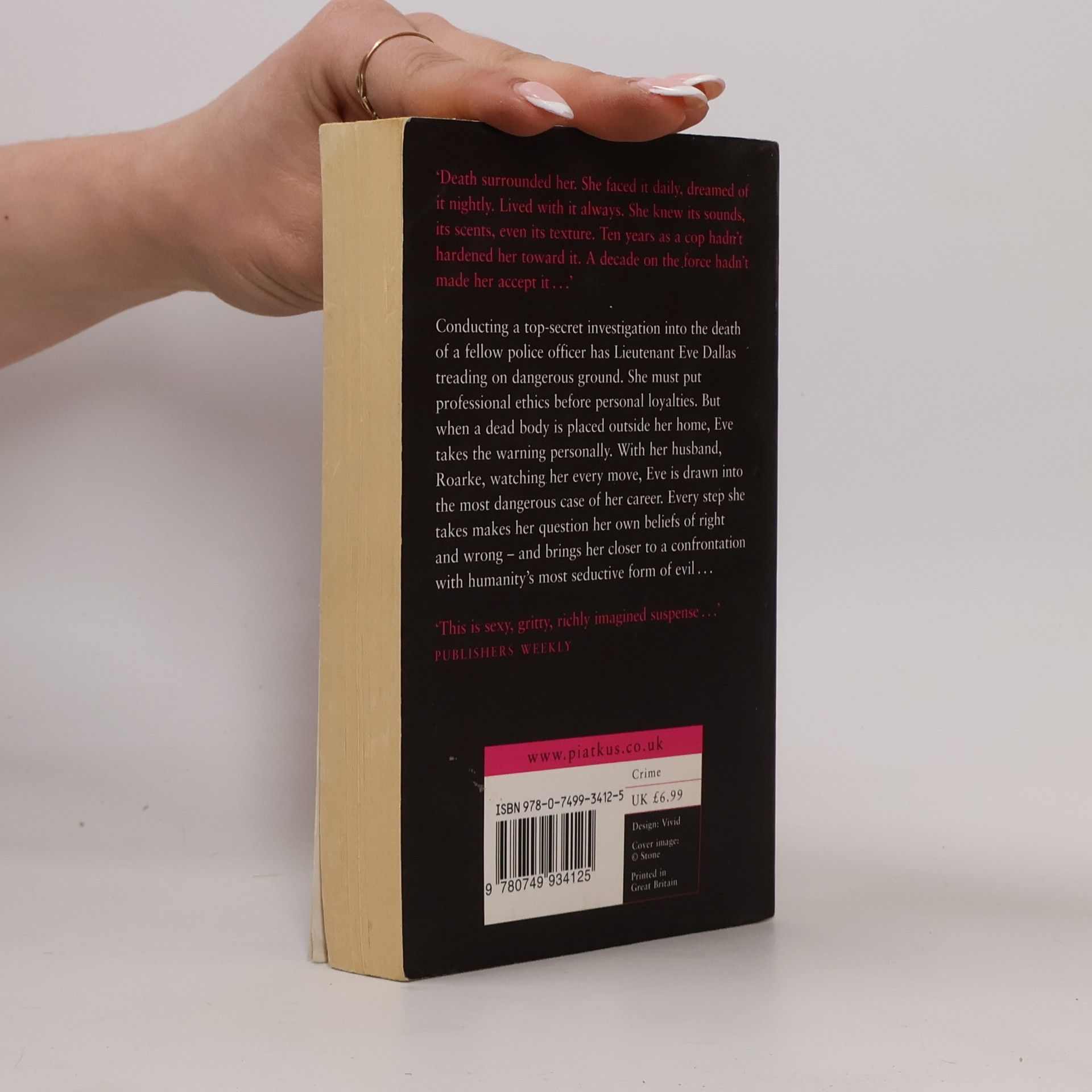 Even in an age of cutting-edge technology, old beliefs die hard...Conducting a top secret investigation into the death of a fellow police officer has Lieutenant Eve Dallas treading on dangerous ground. She must put professional ethics before personal loyalties. But when a dead body is placed outside her home, Eve takes the warning personally. With her husband, Roarke, watching her every move, Eve is drawn into the most dangerous case of her career. Every step she takes makes her question her own beliefs of right and wrong - and brings her closer to a confrontation with humanity's most seductive form of evil...