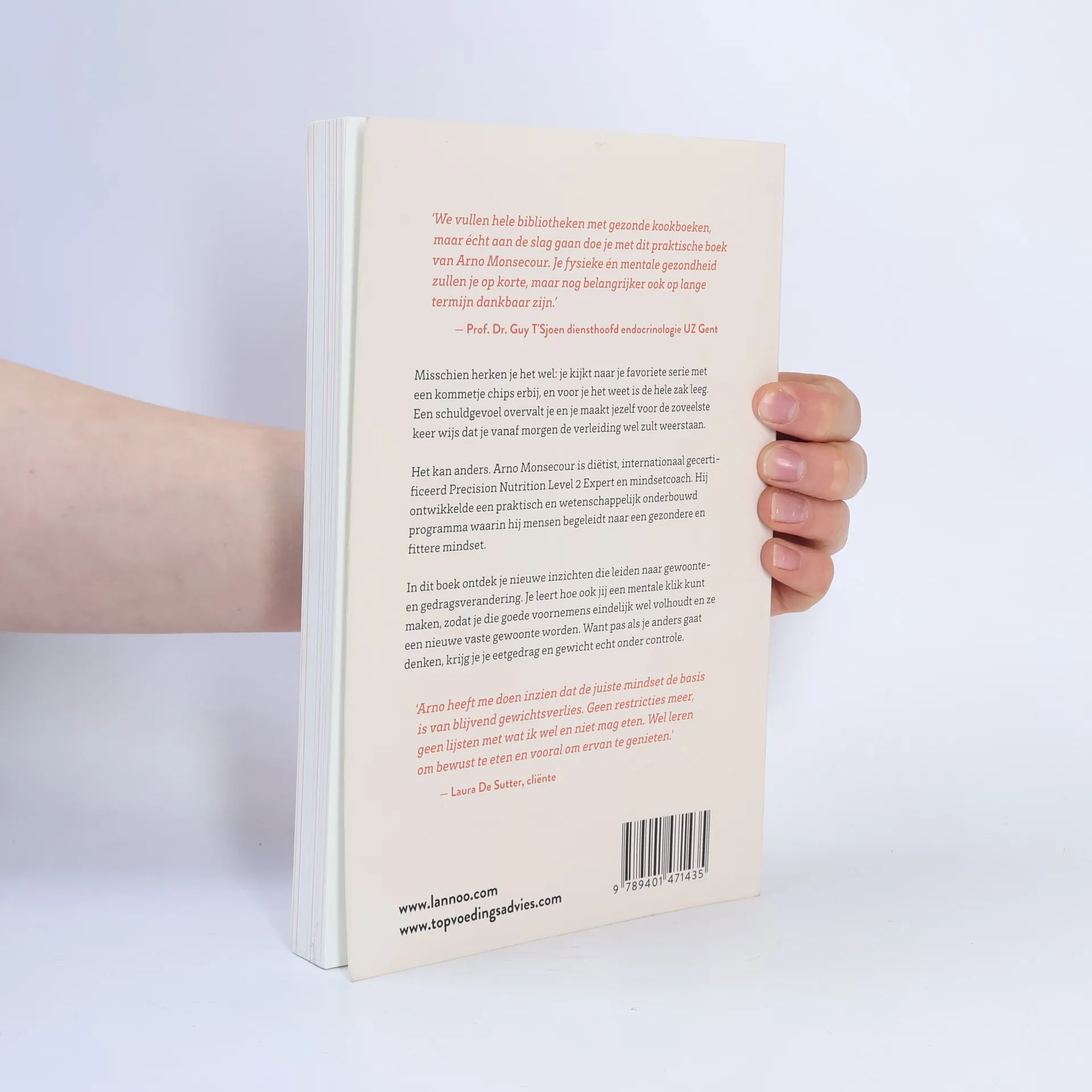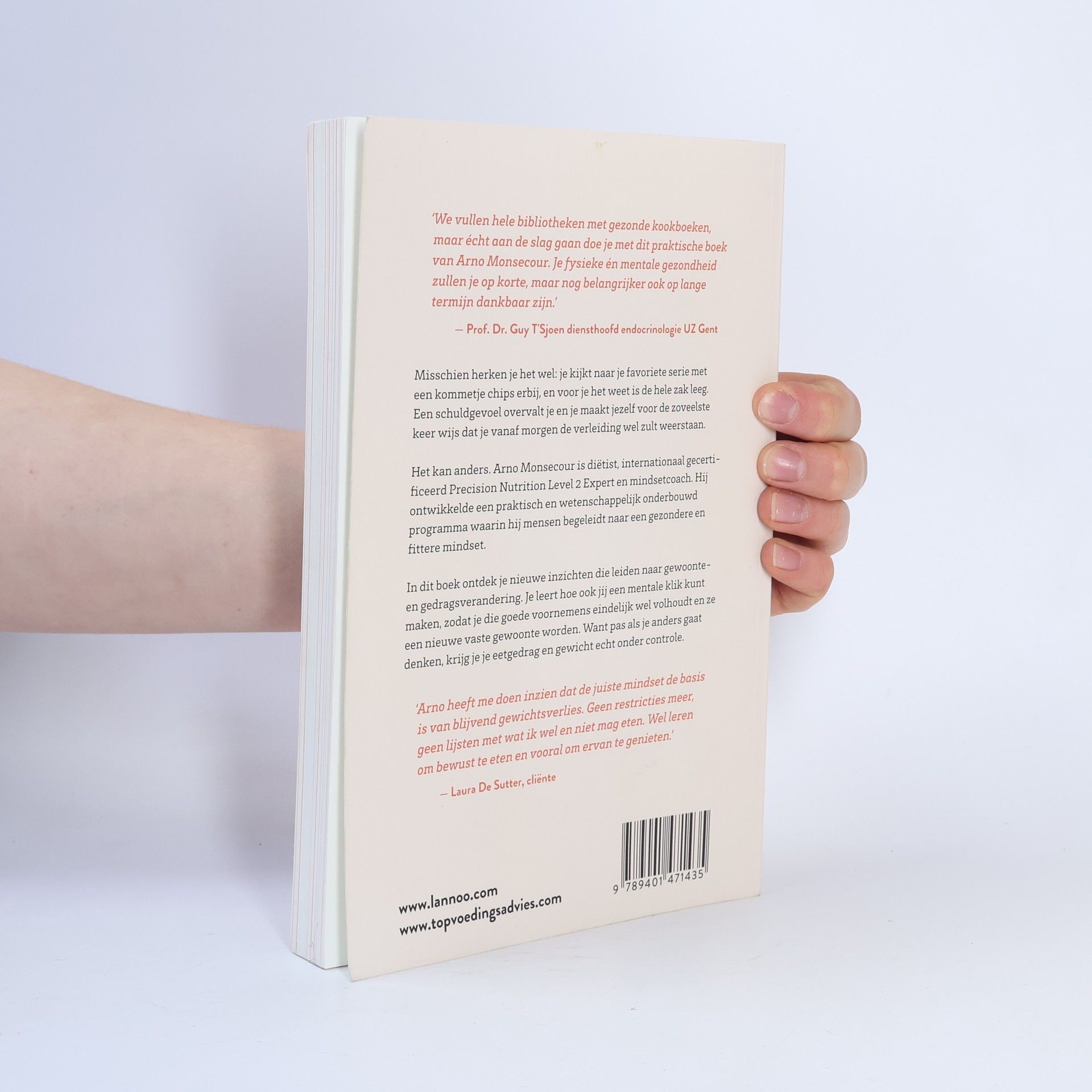Misschien herken je het wel: je kijkt naar je favoriete serie met een kommetje chips erbij, en voor je het weet is de hele zak leeg. Een schuldgevoel overvalt je en je maakt jezelf voor de zoveelste keer wijs dat je vanaf morgen de verleiding wel zult weerstaan.Het kan anders. Arno Monsecour is diëtist, internationaal gecertificeerd Precision Nutrition Level 2 Expert en mindsetcoach. Hij ontwikkelde een praktisch en wetenschappelijk onderbouwd programma waarin hij mensen begeleidt naar een gezondere en fittere mindset.In dit boek ontdek je nieuwe inzichten die leiden naar gewoonte en gedragsverandering. Je leert hoe ook jij een mentale klik kunt maken, zodat je die goede voornemens eindelijk wel volhoudt en ze een nieuwe vaste gewoonte worden. Want pas als je anders gaat denken, krijg je je eetgedrag en gewicht echt onder controle.