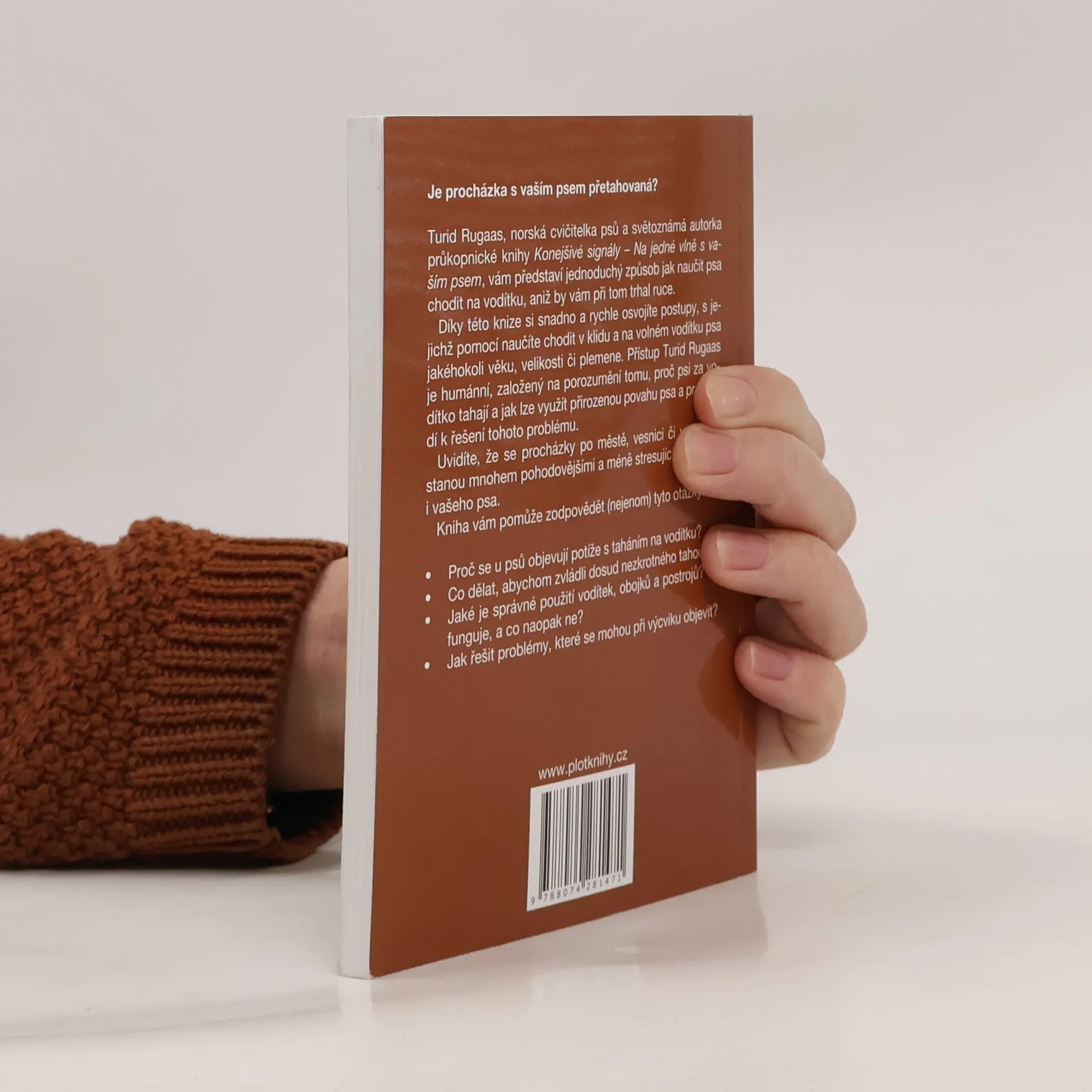 Turid Rugaas, norská cvičitelka psů a světoznámá autorka průkopnické knihy Konejšivé signály – Na jedné vlně s vaším psem, vám představí jednoduchý způsob jak naučit psa chodit na vodítku, aniž by vám při tom trhal ruce. Díky této knize si snadno a rychle osvojíte postupy, s jejichž pomocí naučíte chodit v klidu a na volném vodítku psa jakéhokoli věku, velikosti či plemene. Přístup Turid Rugaas je humánní, založený na porozumění tomu, proč psi za vodítko tahají a jak lze využít přirozenou povahu psa a prostředí k řešení tohoto problému. Uvidíte, že se procházky po městě, vesnici či v přírodě stanou mnohem pohodovějšími a méně stresujícími pro vás i vašeho psa.