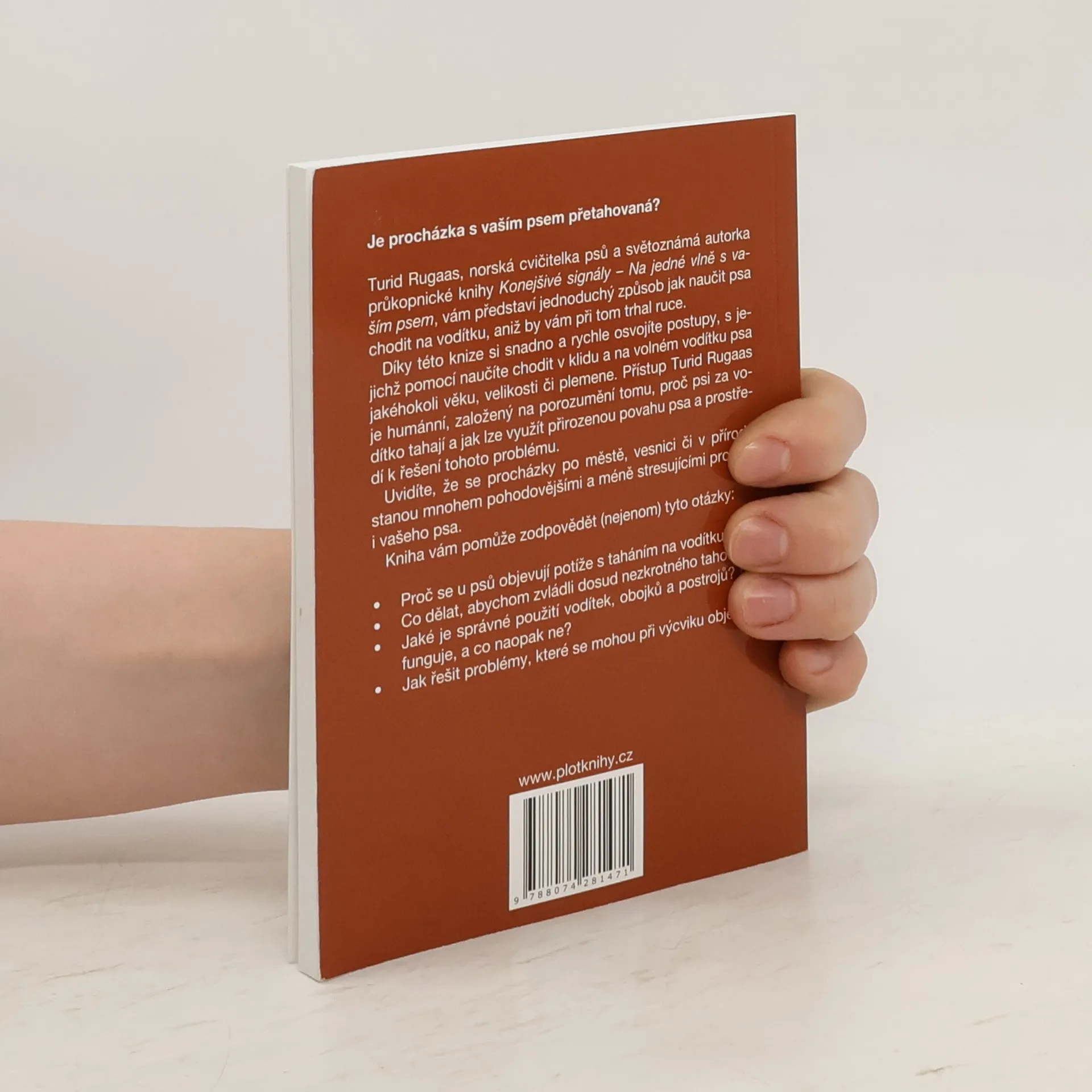 Turid Rugaas, norská cvičitelka psů a světoznámá autorka průkopnické knihy Konejšivé signály – Na jedné vlně s vaším psem, vám představí jednoduchý způsob jak naučit psa chodit na vodítku, aniž by vám při tom trhal ruce. Díky této knize si snadno a rychle osvojíte postupy, s jejichž pomocí naučíte chodit v klidu a na volném vodítku psa jakéhokoli věku, velikosti či plemene. Přístup Turid Rugaas je humánní, založený na porozumění tomu, proč psi za vodítko tahají a jak lze využít přirozenou povahu psa a prostředí k řešení tohoto problému. Uvidíte, že se procházky po městě, vesnici či v přírodě stanou mnohem pohodovějšími a méně stresujícími pro vás i vašeho psa.