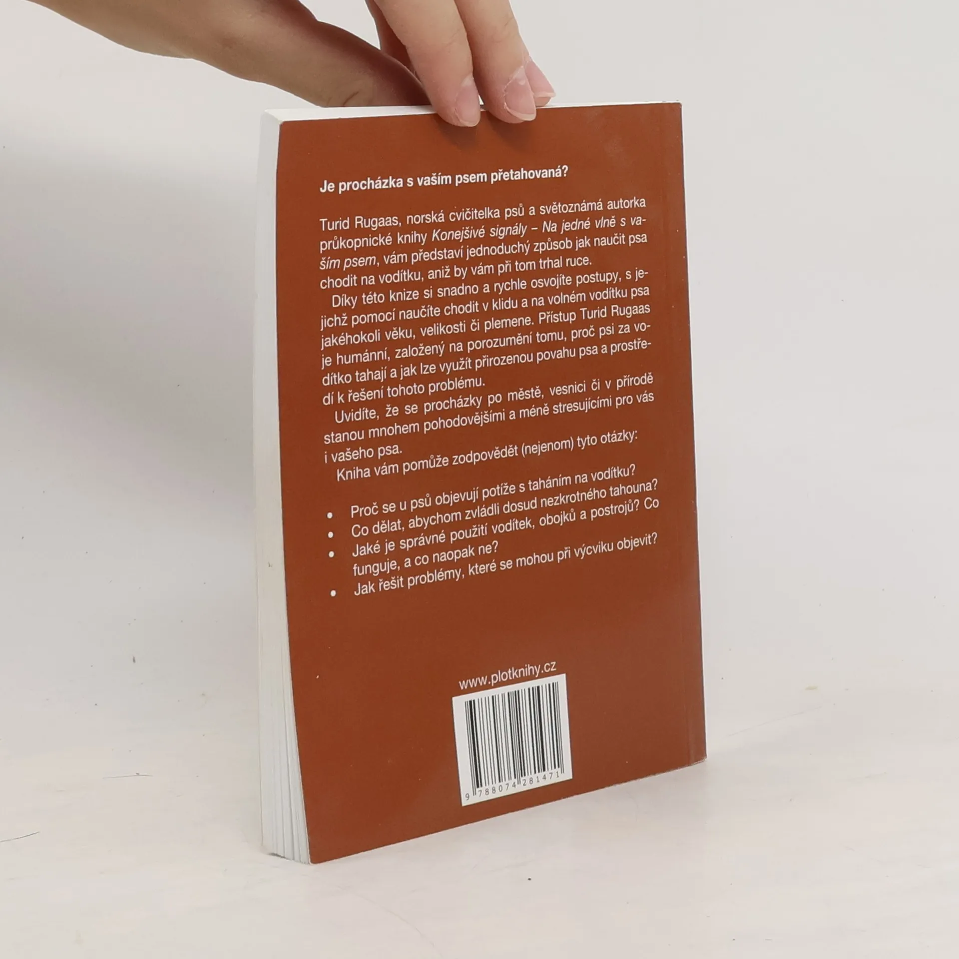 Turid Rugaas, norská cvičitelka psů a světoznámá autorka průkopnické knihy Konejšivé signály – Na jedné vlně s vaším psem, vám představí jednoduchý způsob jak naučit psa chodit na vodítku, aniž by vám při tom trhal ruce. Díky této knize si snadno a rychle osvojíte postupy, s jejichž pomocí naučíte chodit v klidu a na volném vodítku psa jakéhokoli věku, velikosti či plemene. Přístup Turid Rugaas je humánní, založený na porozumění tomu, proč psi za vodítko tahají a jak lze využít přirozenou povahu psa a prostředí k řešení tohoto problému. Uvidíte, že se procházky po městě, vesnici či v přírodě stanou mnohem pohodovějšími a méně stresujícími pro vás i vašeho psa.