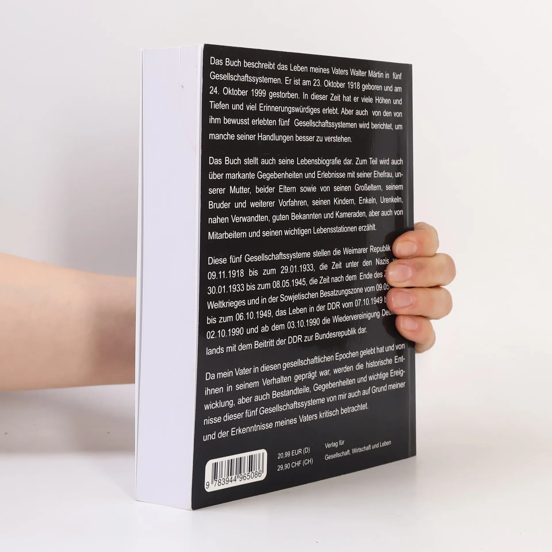 Das Buch beschreibt das Leben meines Vaters, Walter Märtin, in fünf Gesellschaftssystemen. Er ist am 23. Oktober 1918 geboren und am 24. Oktober 1999 gestorben. In dieser Zeit hat er viele Höhen und Tiefen und viel Erinnerungswürdiges erlebt. Aber auch von dem von ihm bewusst erlebten fünf Gesellschaftssystemn wird berichtet, um manche seiner Handlungen besser zu verstehen.