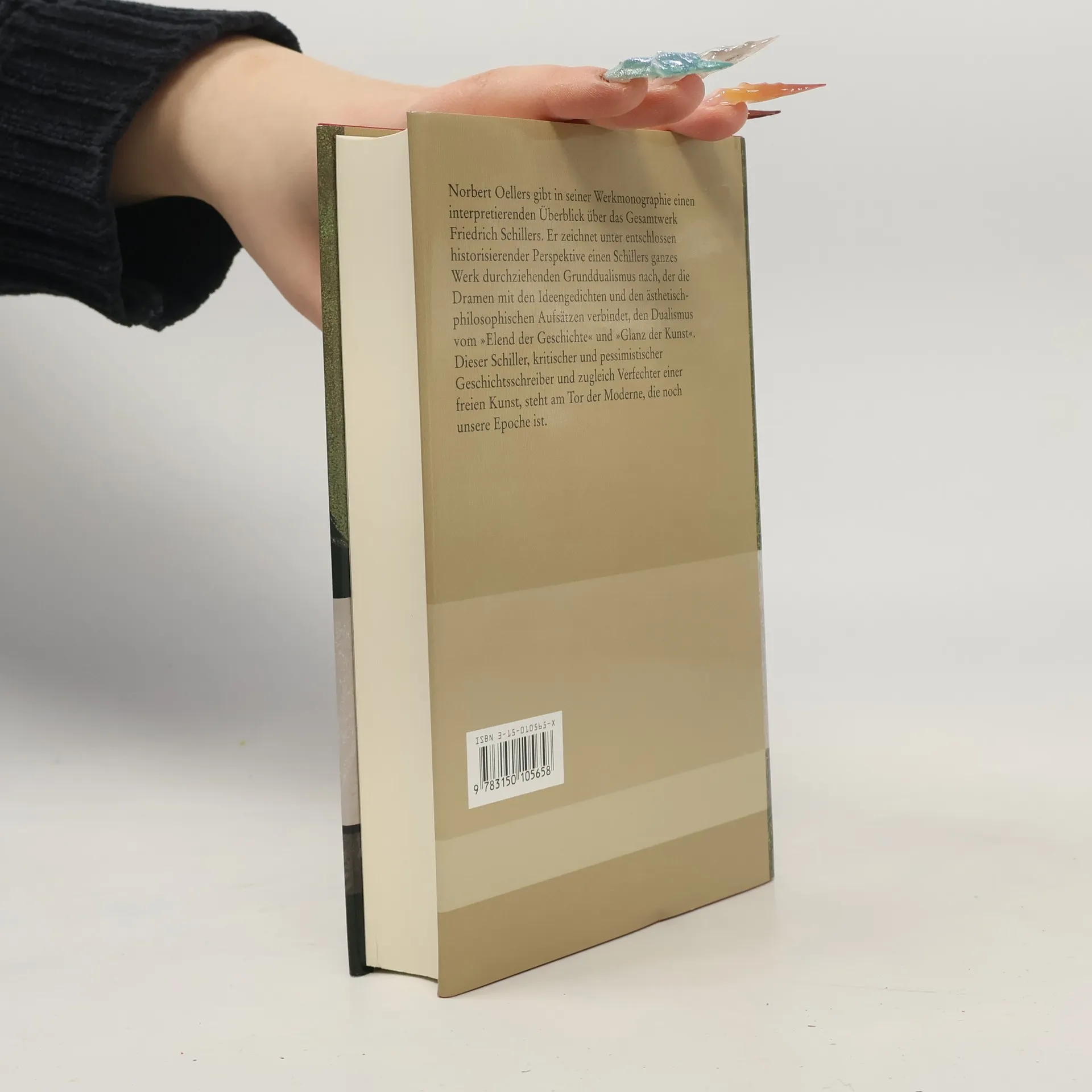 Oellers gibt, ganz reclamgemäß und über den Jubiläumsanlass hinaus gültig, einen interpretierenden Überblick über das gesamte Werk des großen Weimarer Klassikers (vormaligen Stürmers und Drängers), des modernsten Dichters der Zeit um 1800, griffig gegliedert nach Gattungen und leicht verständlich, gleichwohl aus der Kenntnis der ganzen Schillerforschung geschöpft. Dem Biographismus früherer und heutiger Schiller-Apotheosen setzt Oellers eine fundierte Werkinterpretation entgegen. Deren Zentrum liegt in einem historisch informierten Verständnis, das nicht wieder den Autor und seine Werke (oder nur Zitate aus ihnen) unter dem Motto „Er ist unser!“ für jede Aktualität umstandslos vereinnahmt. Unter einer entschlossen historisierenden Perspektive erkennt Oellers im ganzen Werk Schillers einen Grundgedanken, einen Grunddualismus, der etwa Maria Stuart, Don Karlos oder Wallenstein mit den Ideengedichten und den großen ästhetisch-philosophischen Aufsätzen verbindet. Es ist der Dualismus von einer aus größter Kenntnis tief kritischen und pessimistischen Sicht auf die Geschichte und dem Entwurf einer von allem Historischen, Irdischen, Politischen befreiten und befreienden utopischen und autonomen, einer „heiteren“ Kunst. Dieser Schiller, pessimistischer Geschichtsschreiber und Verfechter einer freien Kunst, steht am Tor der Moderne, die noch unsere Epoche ist.