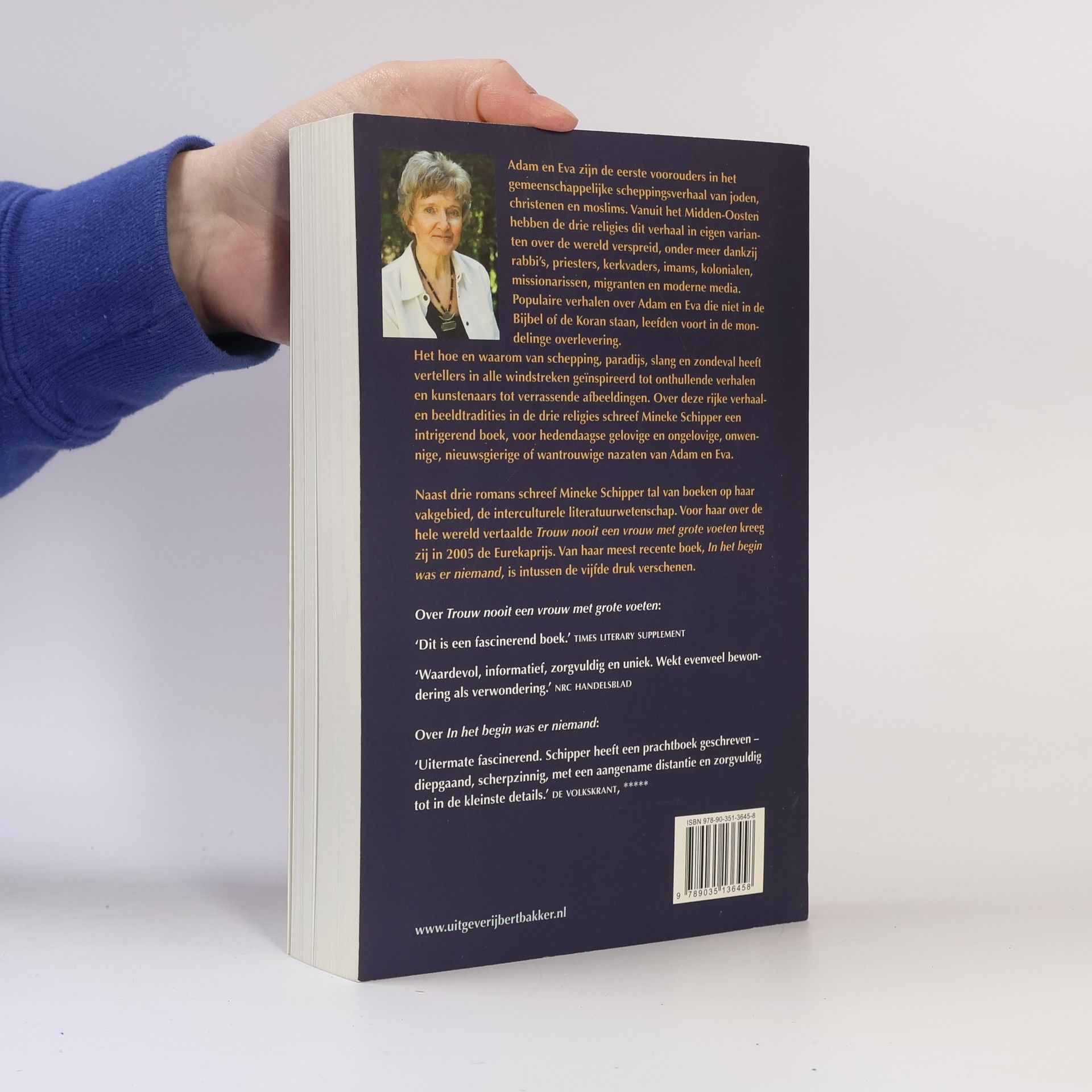 Adam en Eva zijn de eerste voorouders in het gemeenschappelijke scheppingsverhaal van joden, christenen en moslims. Vanuit het Midden-Oosten hebben de drie religies dit verhaal in eigen varianten over de wereld verspreid, onder meer dankzij rabbi's, priesters, kerkvaders, imams, kolonialen, missionarissen, migranten en moderne media. Populaire verhalen over Adam en Eva die niet in de Bijbel of de Koran staan, leefden voort in de mondelinge overlevering. Het hoe en waarom van schepping, paradijs, slang en zondeval heeft vertellers in alle windstreken geïnspireerd tot onthullende verhalen en kunstenaars tot verrassende afbeeldingen. Over deze rijke verhaal- en beeldtradities in de drie religies schreef Mineke Schipper een intrigerend boek, voor hedendaagse gelovige en ongelovige, onwennige, nieuwsgierige of wantrouwige nazaten van Adam en Eva. Naast drie romans schreef Mineke Schipper tal van boeken op haar vakgebied, de interculturele literatuurwetenschap. Voor haar over de hele wereld vertaalde Trouw nooit een vrouw met grote voeten kreeg zij in 2005 de Eurekaprijs. Van haar meest recente boek, In het begin was er niemand, is intussen de vijfde druk verschenen. Over Trouw nooit een vrouw met grote voeten: 'Dit is een fascinerend boek.' times literary supplement 'Waardevol, informatief, zorgvuldig en uniek. Wekt evenveel bewondering als verwondering.' nrc handelsblad Over In het begin was er niemand: 'Uitermate fascinerend. Schipper heeft een prachtboek geschreven - diepgaand, scherpzinnig, met een aangename distantie en zorgvuldig tot in de kleinste details.' de volkskrant,