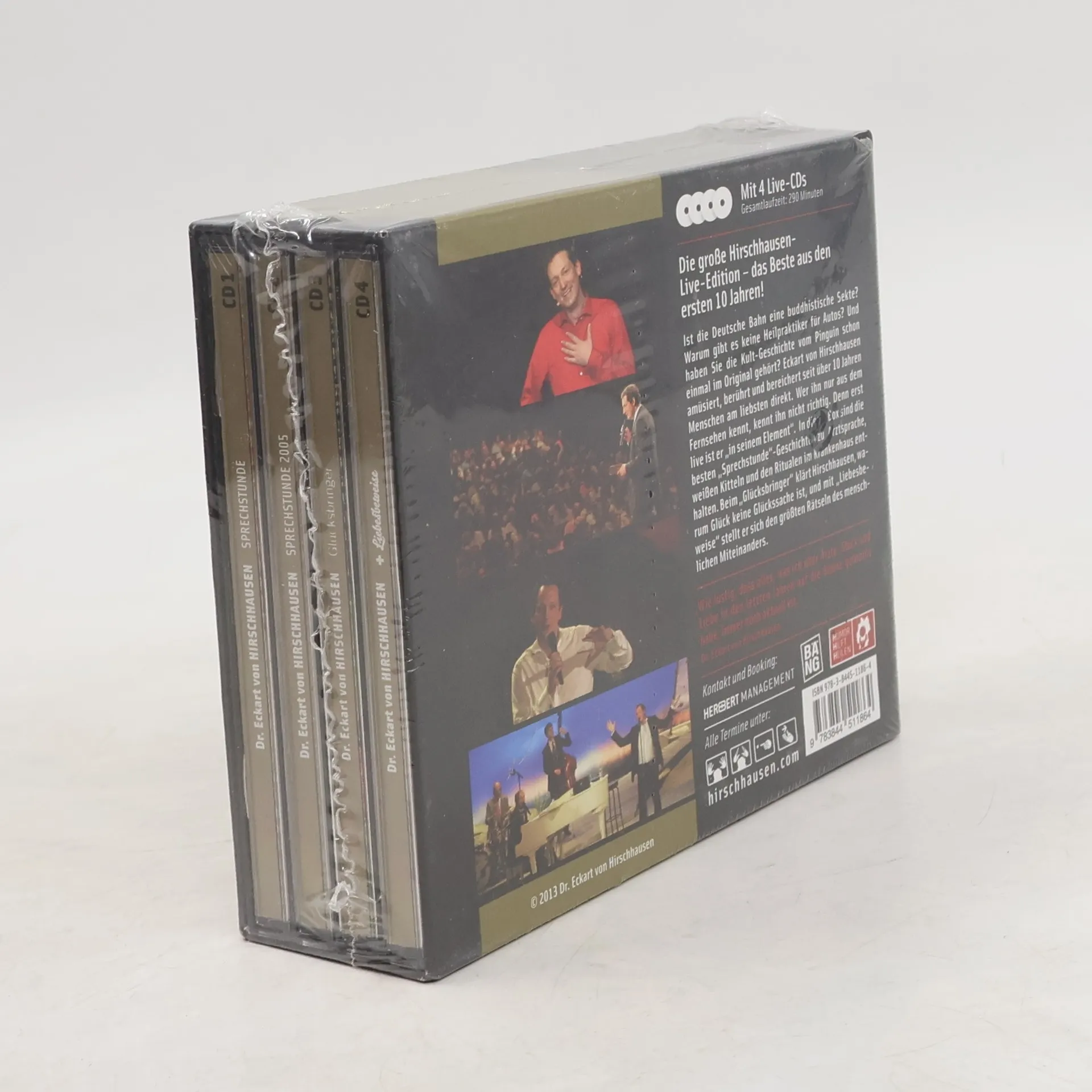 „Wie lustig, dass alles, was ich über Ärzte, Glück und Liebe in den letzten Jahren auf die Bühne gebracht habe, immer noch aktuell ist … 40 Quartale auf 4 CDs – wo gibt es denn so was?“ Ist die Deutsche Bahn eine buddhistische Sekte? Warum gibt es keine Heilpraktiker für Autos? Und haben Sie die Kult-Geschichte vom Pinguin schon einmal im Original gehört? Eckart von Hirschhausen amüsiert, berührt und bereichert seit über 10 Jahren Menschen – am liebsten direkt. Wer Eckart von Hirschhausen nur aus dem Fernsehen kennt, kennt ihn nicht richtig. Denn erst live ist er "in seinem Element" – in "Sprechstunde" und "Sprechstunde forte" geht es um Arztsprache, weiße Kittel und die Rituale im Krankenhaus. In "Glücksbringer" kommt er dann zur seelischen Gesundheit und klärt, warum Glück keine Glückssache ist und mit "Liebesbeweise" stellt er sich den größten Rätseln des menschlichen Miteinanders. Die Geschichten und Pointen von Eckart von Hirschhausen haben wie bei einem guten Wein nicht an Wahrheit und Kraft verloren. Hirschhausen live – zum Entdecken, Wiederhören und Mitlachen … Die Box enthält die vier Hörbücher: "Sprechstunde""Sprechstunde forte""Glücksbringer" und"Liebesbeweise" (4 CDs, Laufzeit: 4h 50)