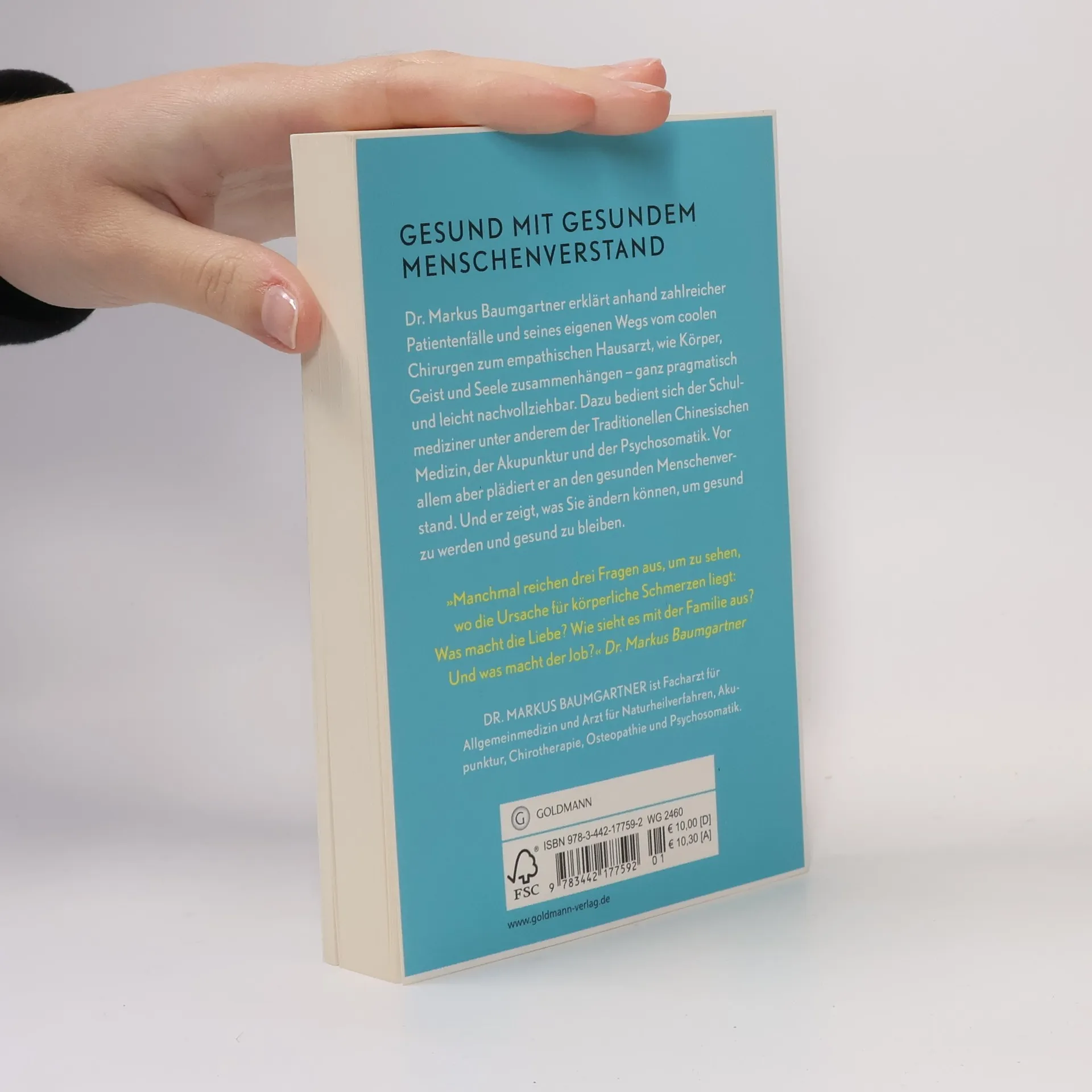 Dr. Markus Baumgartner erklärt anhand zahlreicher Patientenfälle und seines eigenen Wegs vom coolen Chirurgen zum empathischen Hausarzt, wie Körper, Geist und Seele zusammenhängen – ganz pragmatisch und leicht nachvollziehbar. Dazu bedient sich der Schulmediziner unter anderem der Traditionellen Chinesischen Medizin, der Akupunktur und der Psychosomatik. Vor allem aber plädiert er an den gesunden Menschenverstand. Und er zeigt, was Sie ändern können, um gesund zu werden und gesund zu bleiben. Dieses Buch ist bereits unter dem Titel »Dein Körper ist ein Spießer« bei teNeues als Hardcover erschienen.