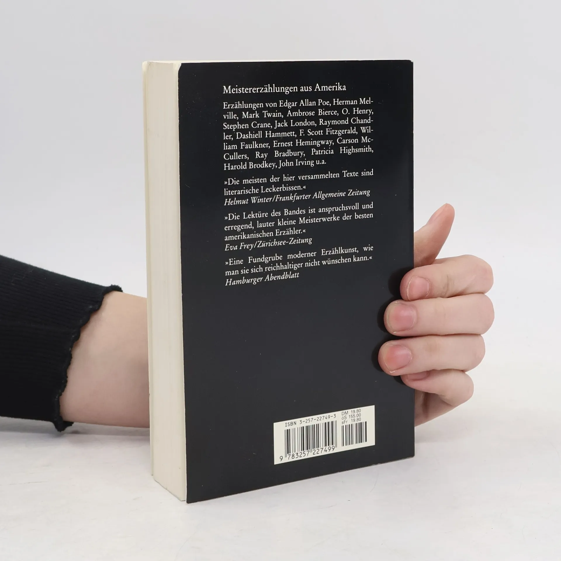 Erzählungen von Edgar Allen Poe, Herman Melville, Mark Twain, Ambrose Bierce, O. Henry, Stephen Crane, Jack London, Raymond Chandler, Dashiell Hammett, F. Scott Fitzgerald, William Faulkner, Ernest Hemingway, Carson Mc-Cullers, Ray Bradbury, Patricia Highsmith, Harold Brodkey, John Irving.
