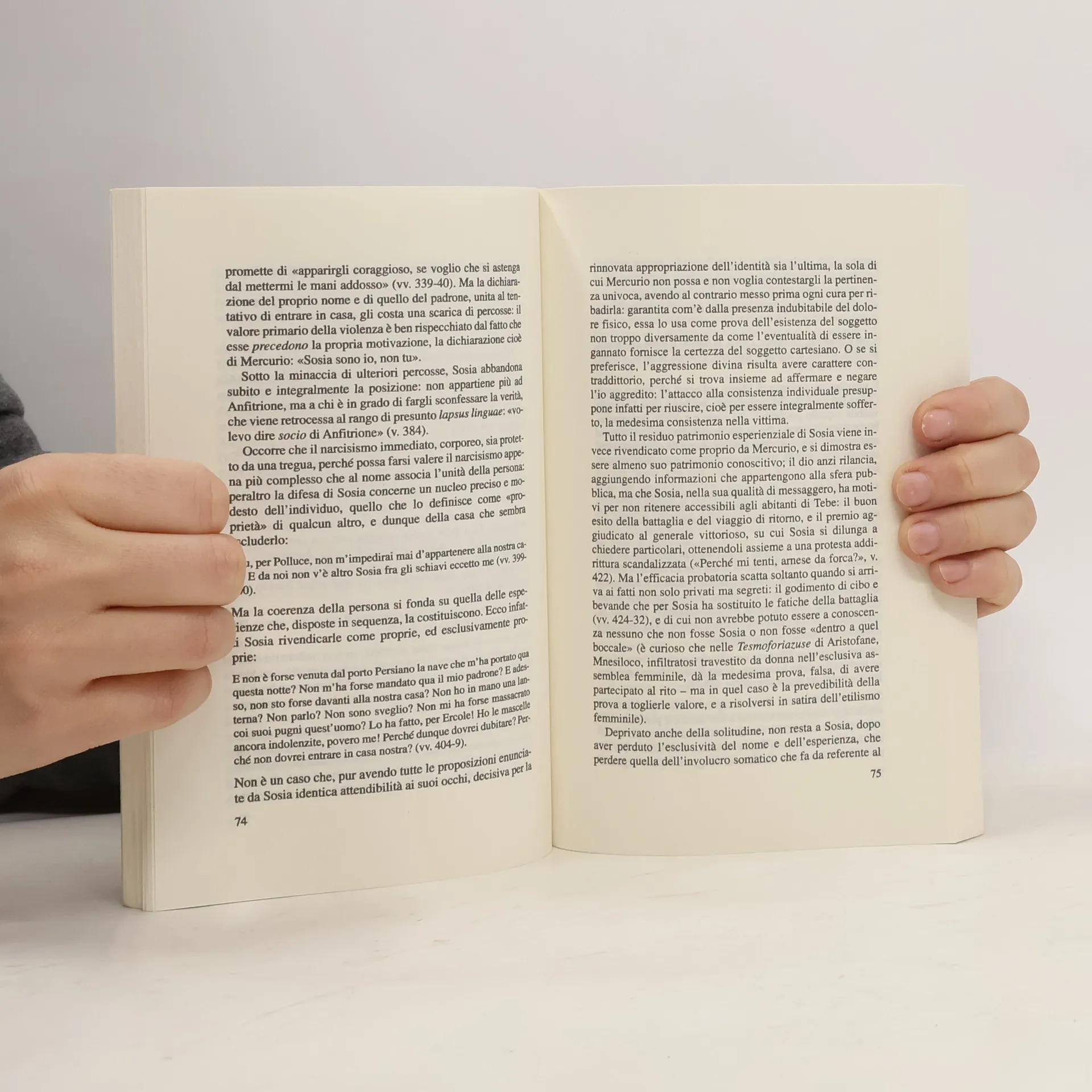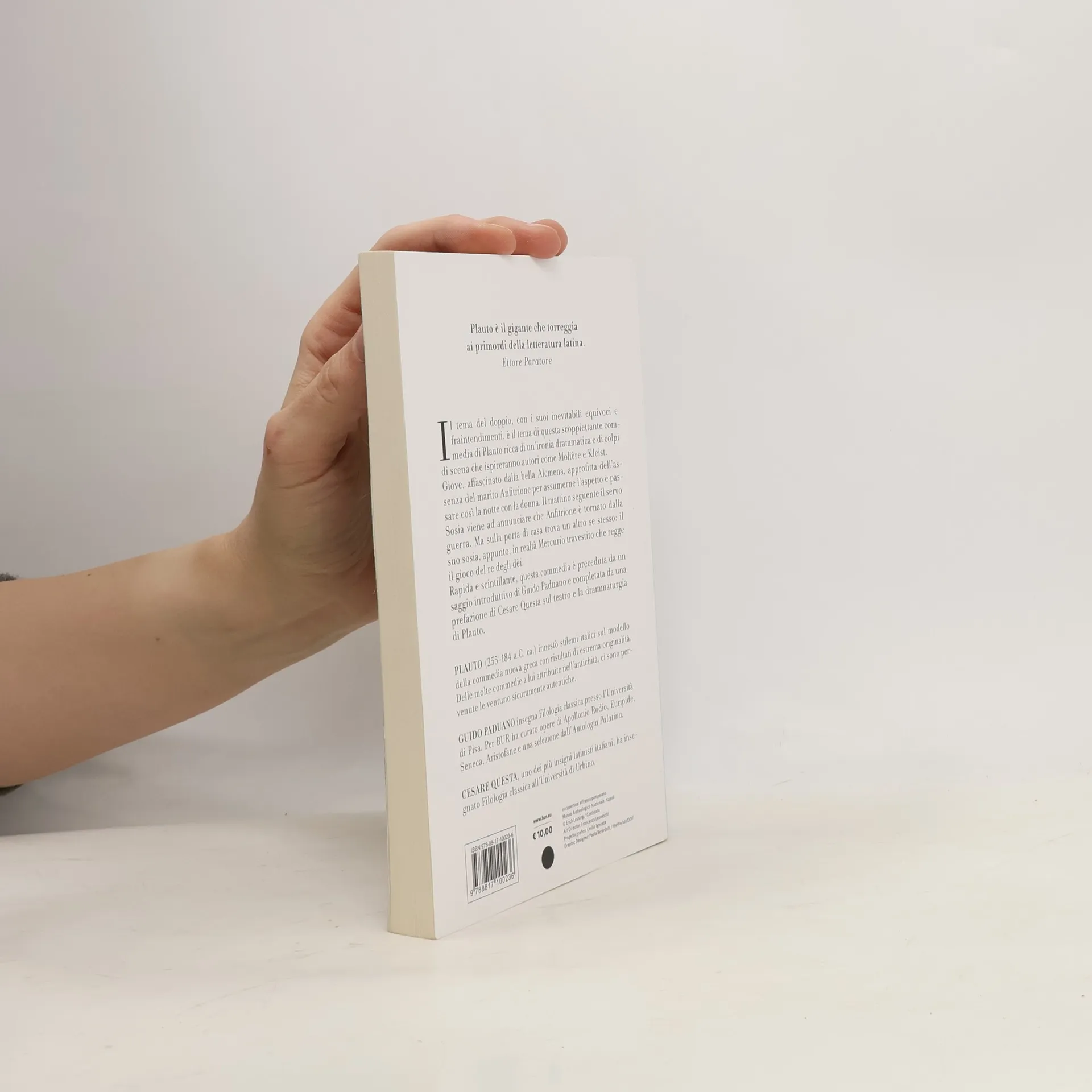 Cosa succederebbe se, tornando a casa, si venisse accolti da un altro se stesso? Il tema del doppio e la difesa della propria identità nel contrasto tra realtà e apparenza sono al centro di questa 'tragicommedia', ricca di ironia e colpi di scena che hanno ispirato autori come Molière e Kleist. Giove, innamorato della bella Alcmena, sfrutta l'assenza del marito Anfitrione per assumere le sue sembianze e passare la notte con lei. Il mattino seguente, il vero Anfitrione invia il servo Sosia per annunciare il suo ritorno dalla guerra, ma questi si imbatte nel suo 'sosia', ovvero Mercurio travestito, che sostiene il gioco di Giove. Anfitrione non crede alle parole del servo, e dopo un'esilarante interazione con il suo doppio, corre a raccontare l'accaduto al padrone. Anche Alcmena non viene creduta quando afferma di aver appena visto il marito. La situazione si complica, e solo l'intervento di Giove potrà riportare la serenità e risolvere i dubbi, conducendo a un inevitabile lieto fine. Guido Paduano esplora i temi centrali della commedia in un acuto saggio introduttivo, accompagnato da una ricca prefazione di Cesare Questa sul teatro di Plauto.