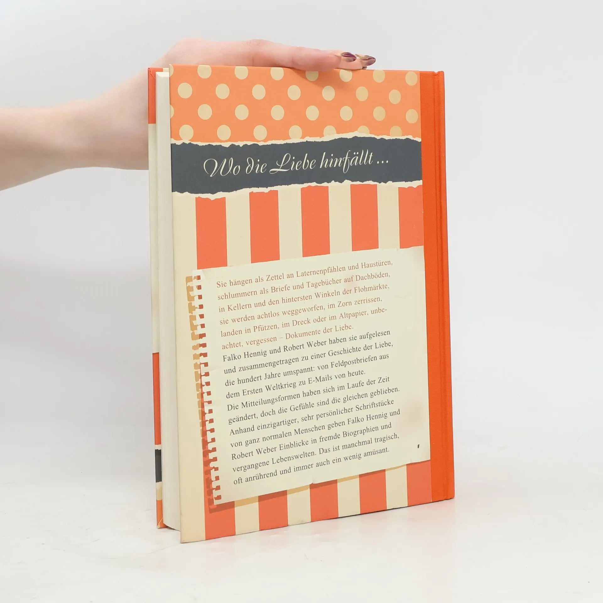 Wo die Liebe hinfällt ... Sie hängen als Zettel an Laternenpfählen und Haustüren, schlummern als Briefe und Tagebücher auf Dachböden, in Kellern und den hintersten Winkeln der Flohmärkte, sie werden achtlos weggeworfen, im Zorn zerrissen, landen in Pfützen, im Dreck oder im Altpapier, unbeachtet, vergessen – Dokumente der Liebe. Falko Hennig und Robert Weber haben sie aufgelesen und zusammengetragen zu einer Geschichte der Liebe, die hundert Jahre umspannt: von Feldpostbriefen aus dem Ersten Weltkrieg zu E-Mails von heute. Die Mitteilungsformen haben sich im Laufe der Zeit geändert, doch die Gefühle sind die gleichen geblieben. Anhand einzigartiger, sehr persönlicher Schriftstücke von ganz normalen Menschen geben Falko Hennig und Robert Weber Einblicke in fremde Biographien und vergangene Lebenswelten. Das ist manchmal tragisch, oft anrührend und immer auch ein wenig amüsant.