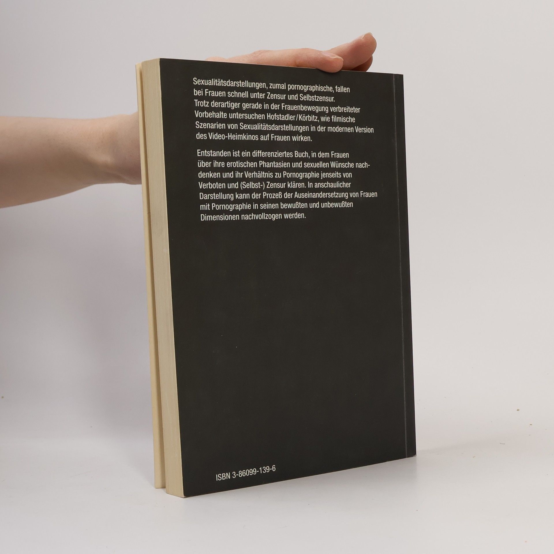 Klappentext: Sexualitätsdarstellungen, zumal pornographische, fallen bei Frauen schnell unter Zensur und Selbstzensur. Trotz derartiger gerade in der Frauenbewegung verbreiteter Vorbehalte untersuchen Hofstadter/Körbitz, wie filmische Szenarien von Sexualitätsdarstellungen in der modernen Version des Video-Heimkinos auf Frauen wirken. Entstanden ist ein differenziertes Buch, in dem Frauen über ihre erotischen Phantasien und sexuellen Wünsche nachdenken und ihr Verhältnis zu Pornographie jenseits von Verboten und (Selbst-) Zensur klären. In anschaulicher Darstellung kann der Prozess der Auseinandersetzung von Frauen mit Pornographie in seinem bewussten und unbewussten Dimensionen nachvollzogen werden.