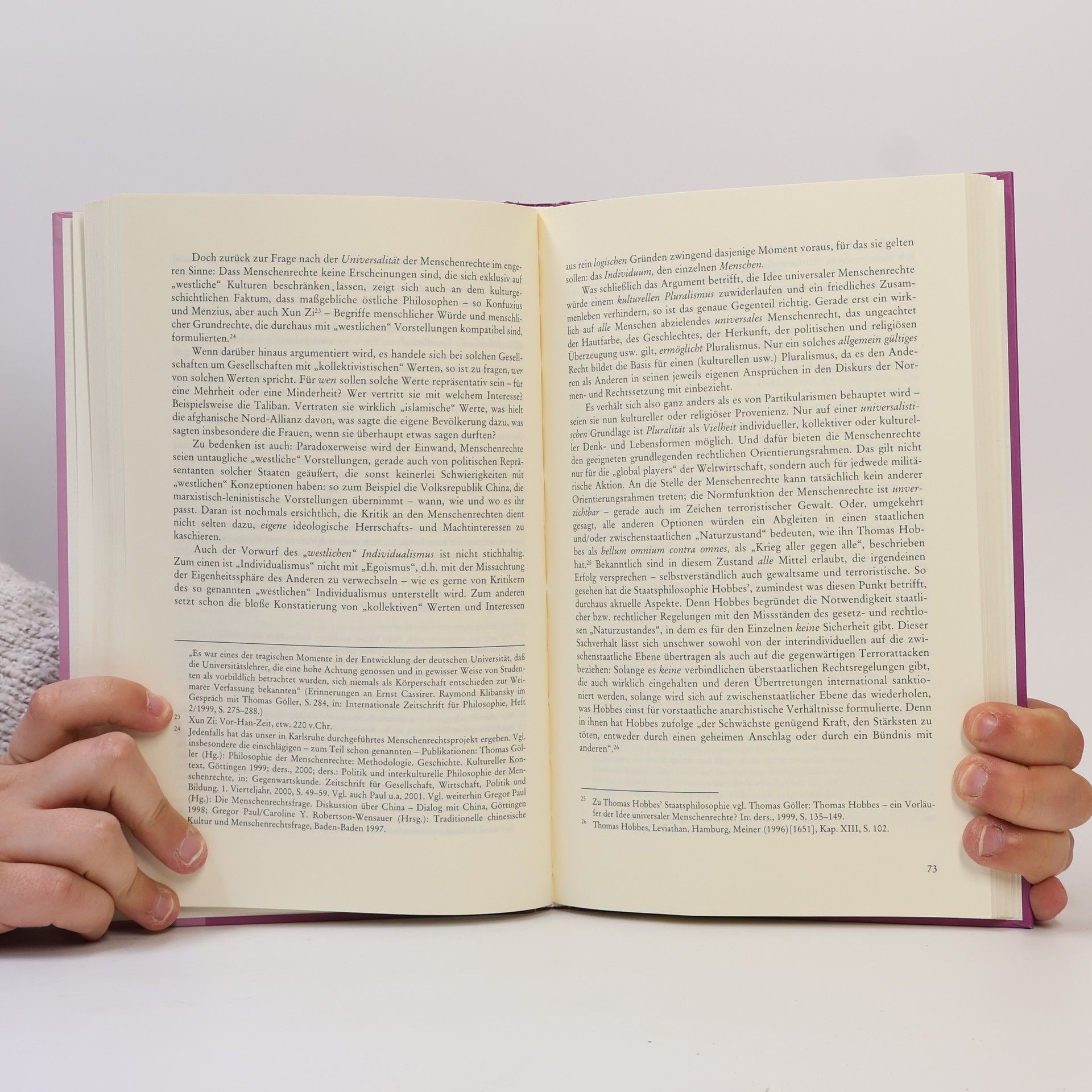 Reinold Schmücker: Vorrang des Rechts oder Vorrang der Moral – Dieter Birnbacher: Internationale Solidarität und ihre Grenzen – Wolfgang Marx: „Universalität der Menschenrechte“ – Kretschmer: Globale Verbrechensverfolgung – Ein Beitrag zur Entwicklung des Völkerstrafrechts – Wilhelm Lütterfelds: Die Anerkennung fremder Kulturen und ihre Paradoxien – Steffen Gross: Kulturelle Mannigfaltigkeit und Globalisierung – Thomas Göller: Normativität der Menschenrechte im Zeichen terroristischer Gewalt?