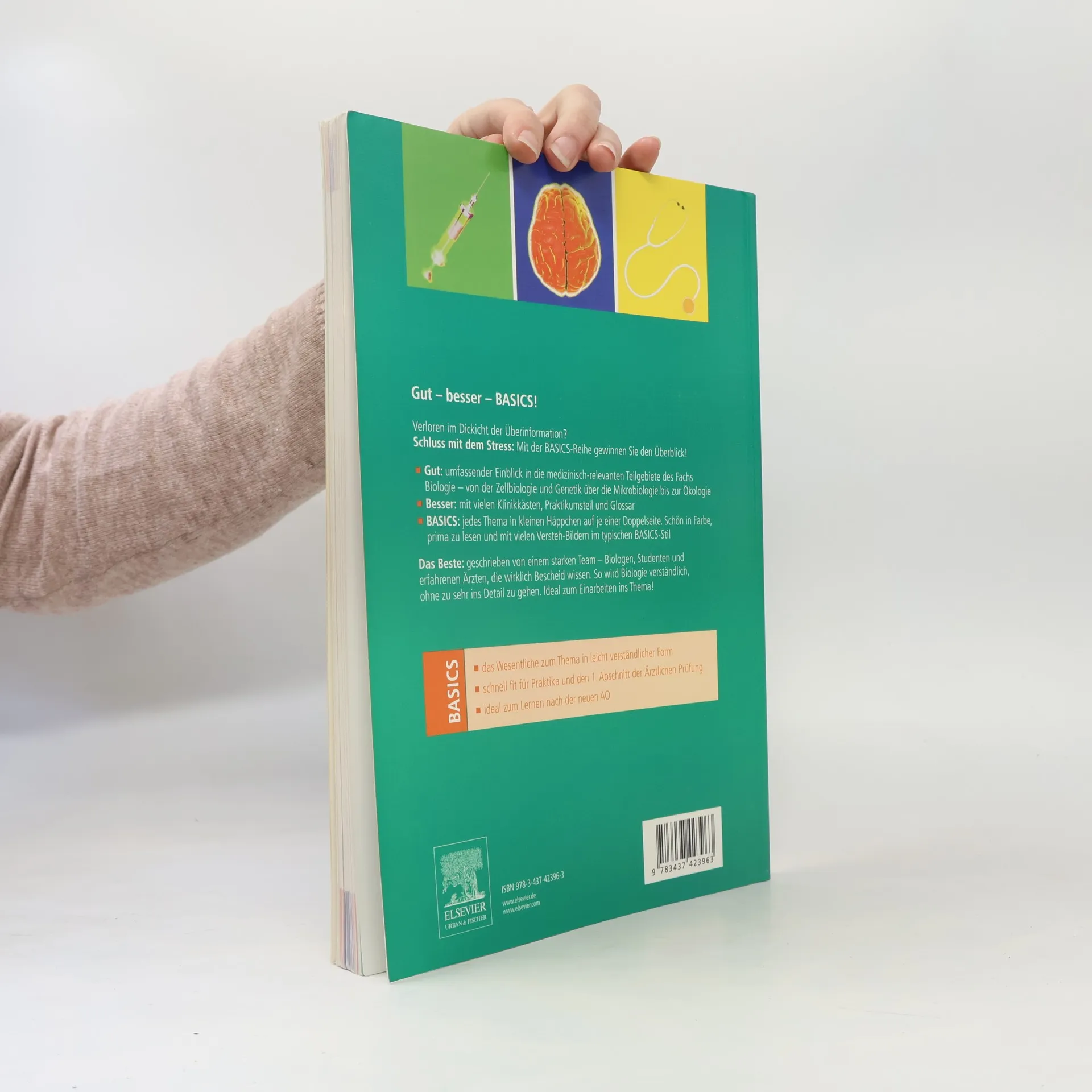 Verloren im Dickicht der Überinformation? Schluss mit dem Stress: Mit der BASICS-Reihe gewinnen Sie den Überblick! Gut: umfassender Einblick in die medizinisch-relevanten Teilgebiete des Fachs Biologie - von der Zellbiologie und Genetik über die Mikrobiologie bis zur Ökologie. Besser: mit vielen Klinikkästen, Praktikumsteil und Glossar BASICS: jedes Thema in kleinen Häppchen auf je einer Doppelseite. Schön in Farbe, prima zu lesen und mit vielen Versteh-Bildern im typischen „BASICS“-Stil BASICS: Das Wesentliche zum Thema in leicht verständlicher Form Schnell fit für Praktika und den 1. Abschnitt der Ärztlichen Prüfung Ideal zum Lernen nach der aktuellen AO