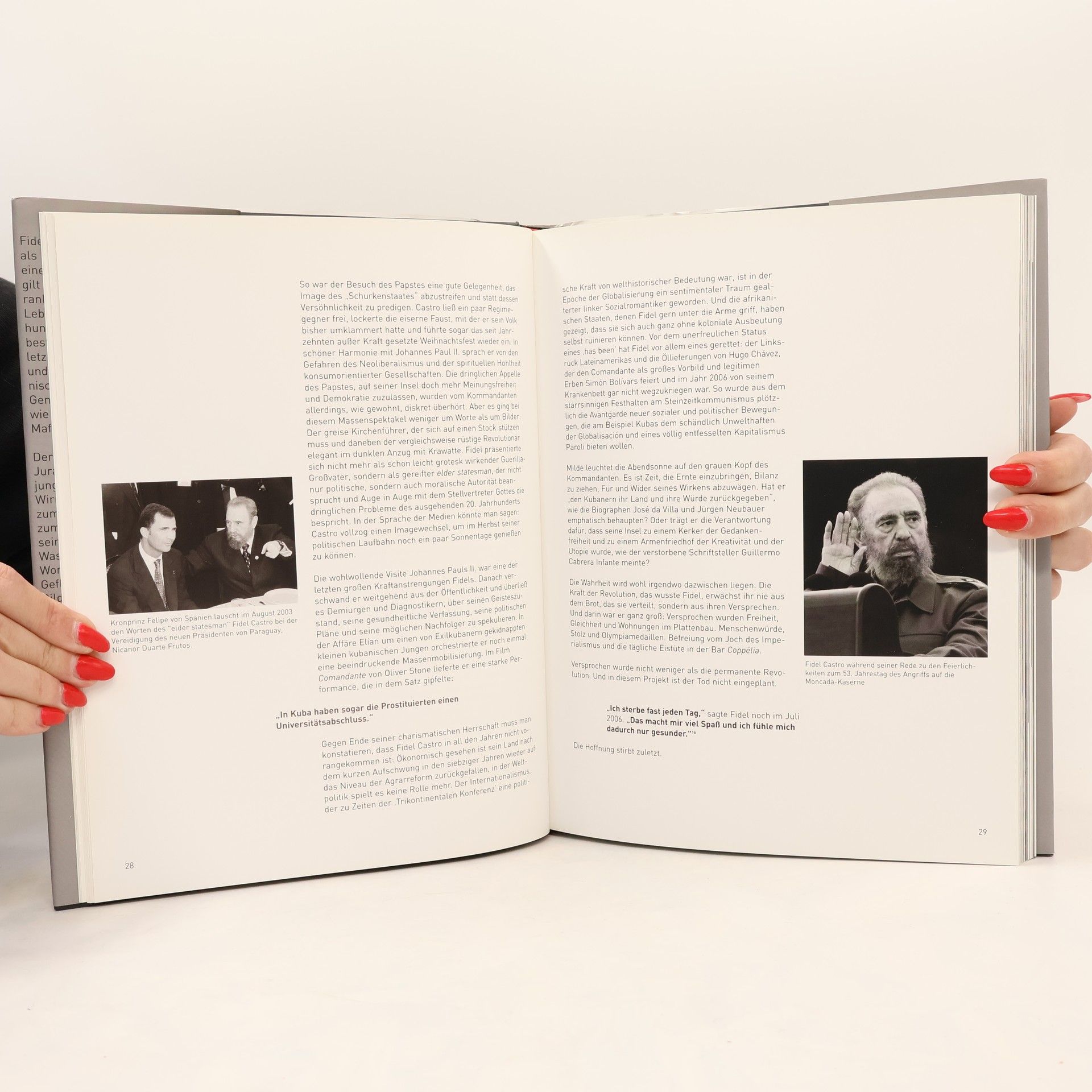 Fidel Castro, der am längsten amtierende Staatschef der Welt, ist bereits zu Lebzeiten eine Legende geworden. Er hat unzählige Attentatsversuche überlebt, viele seiner politischen Gegner ausgeschaltet und scheint auch im hohen Alter nichts an Charisma verloren zu haben. Dieser brillant kmponierte Bildband zeigt die charakteristischen Seiten des Comandante, seine Selbstinszenierung, seine legendären Reden, seine großen Gesten. Originalzitate und Fotos gehen hier eine beredte Zwiesprache ein und decken, bisweilen auch mit einem Augenzwinkern, Zusammhänge und Widersprüche in der Legende vom Maximo Lider auf.