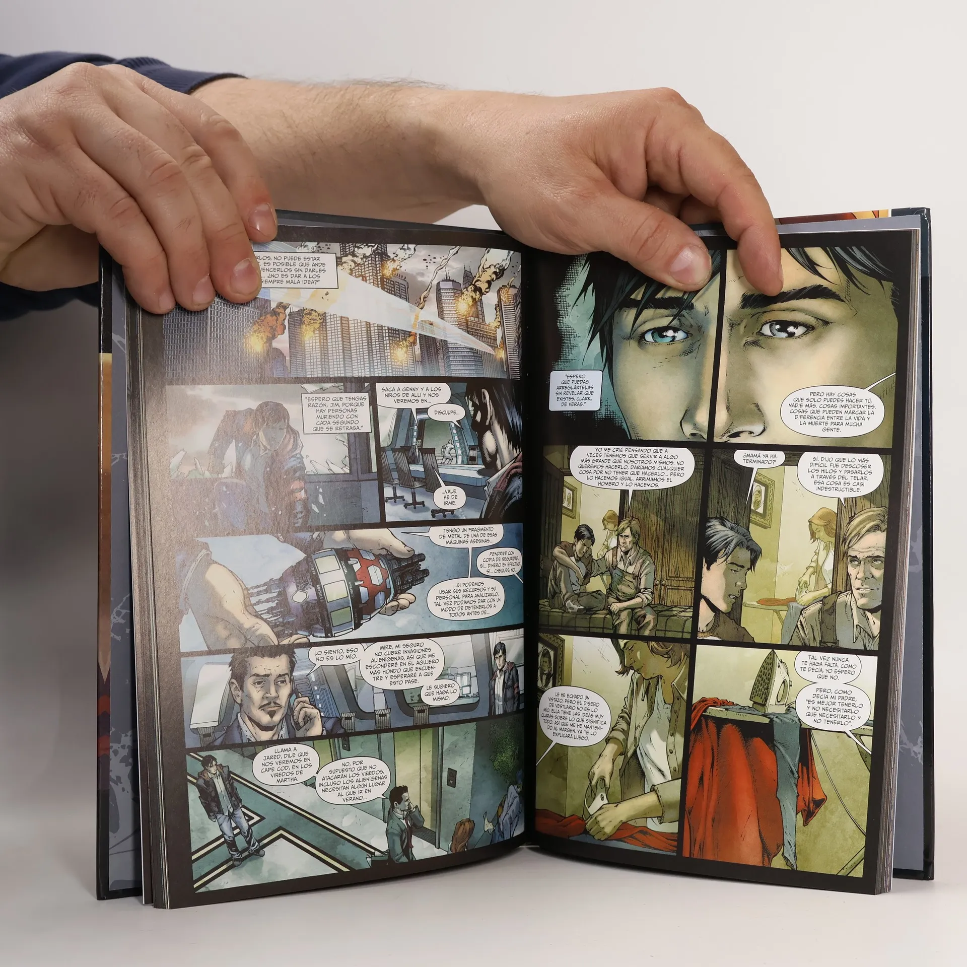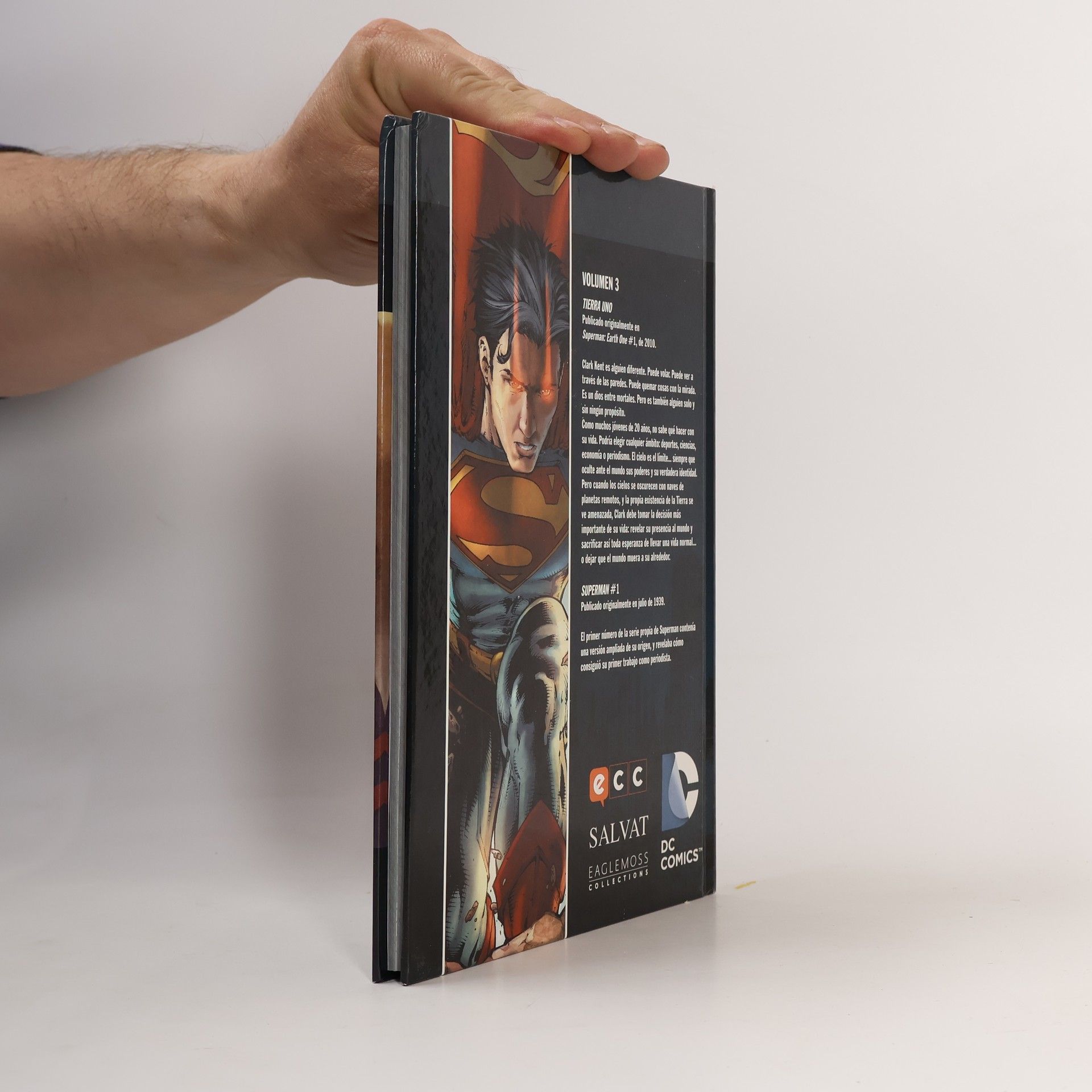 TIERRA UNO. Publicado originalmente en Superman: Earth One #1, de 2010. Clark Kent es alguien diferente. Puede volar. Puede ver a través de las paredes. Quemar cosas con su mirada. Es un dios entre mortales. Pero es también alguien solo y sin ningún propósito. Como muchos jóvenes de 20 años, no sabe qué hacer con su vida. Podría elegir cualquier ámbito: deportes, ciencias, economía o periodismo. El cielo es el límite... siempre que oculte ante el mundo sus poderes y su verdadera identidad. Pero cuando los cielos se oscurecen con naves de planetas remotos, y la propia existencia de la Tierra se ve amenazada, Clark debe tomar la decisión más importante de su vida: revelar su presencia al mundo y sacrificar así toda esperanza de llevar una vida normal... o dejar que el mundo muera a su alrededor. SUPERMAN #1 Publicado originalmente en julio de 1939. El primer número de la serie propia de Superman contenía una versión ampliada de su origen, y revelaba cómo consiguió su primer trabajo como periodista.