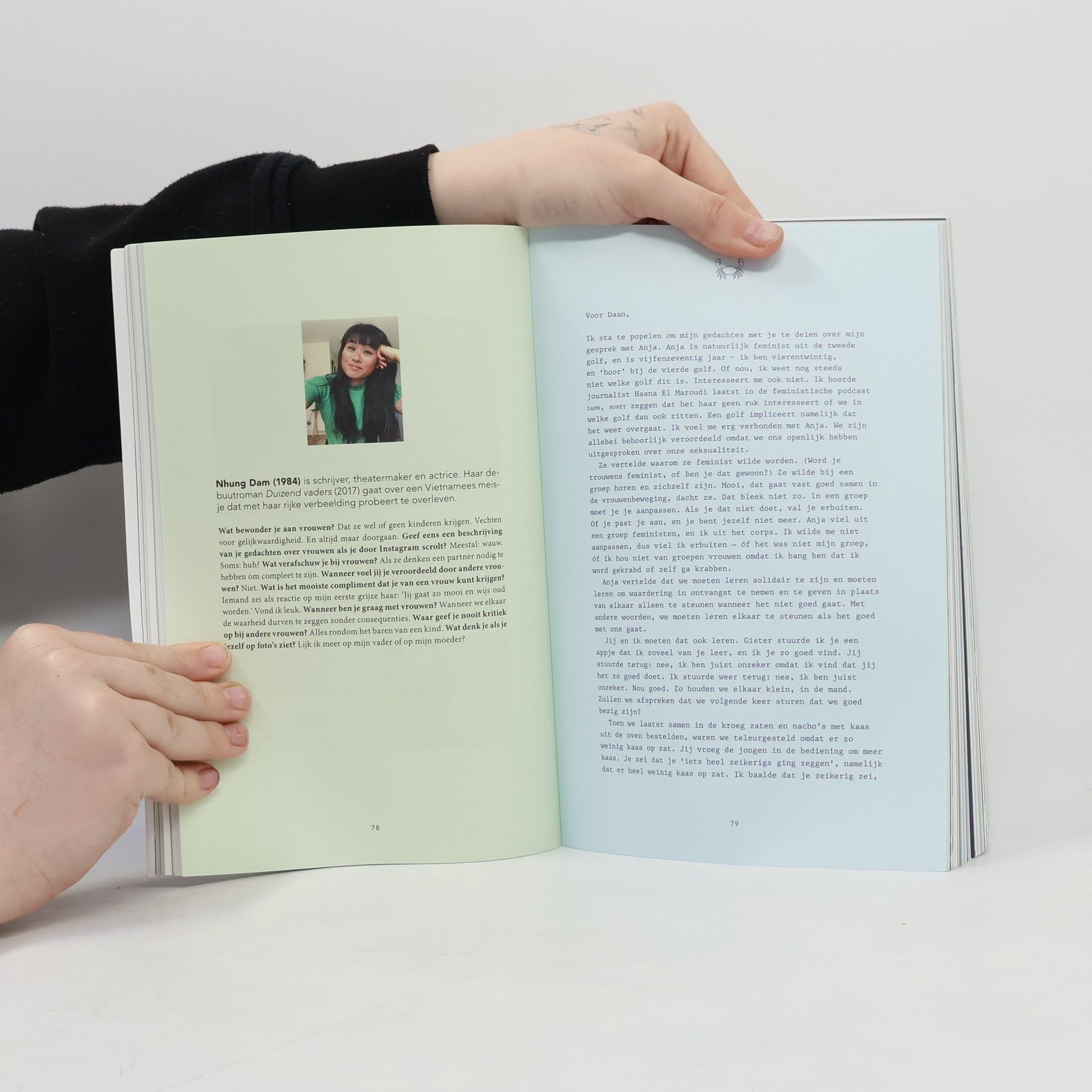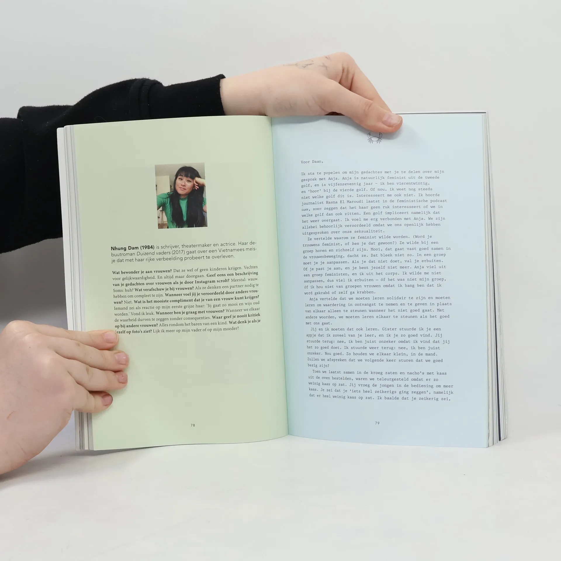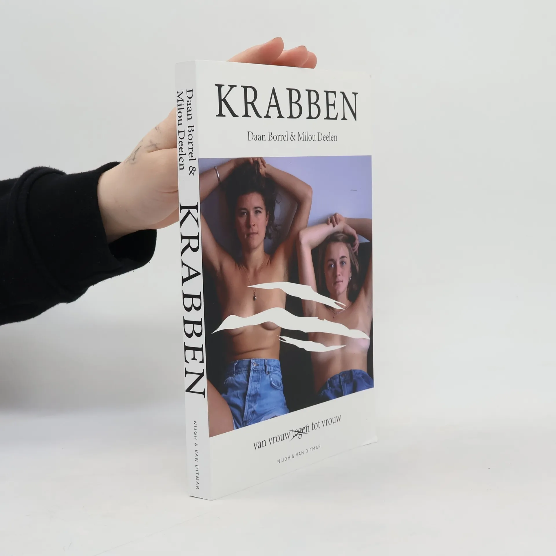In 2017 verschijnt er een filmpje op Facebook dat viral gaat: de toen 21-jarige Milou Deelen, lid van studentenvereniging Vindicat, houdt vellen papier omhoog met scheldwoorden erop die ze van haar vereniging naar haar hoofd geslingerd kreeg. Hoer. Slet. Laag wijf. De reactie op deze aanklacht tegen slutshaming is ook van andere vrouwen niet mals: ze wordt stelselmatig uitgemaakt voor aandachtshoer. Het weerhoudt Milou er niet van om haar boodschap uit te dragen: veroordeel vrouwen niet omwille van hun seksualiteit. Daan Borrel, zelf als journalist en schrijver begaan met de rol van vrouwelijkheid en seksualiteit, voelde mede door hun vriendschap de noodzaak Milou te bevragen naar haar drang zichzelf letterlijk bloot te geven.In Krabben – Van vrouw tot vrouw onderzoeken Borrel en Deelen waarom vrouwen geneigd zijn elkaar genadeloos te veroordelen. Waarom roepen Sylvana Simons en Romy Boomsma zoveel weerstand en woede op bij vrouwen en waarom wordt de uitgesproken zangeres Merol minder gehaat? Zijn vrouwen echt als krabben in een mand, elkaar naar beneden halend om zelf hogerop te komen? Door middel van gesprekken met diverse vrouwen en door onderzoek te doen naar elkaar willen Borrel en Deelen het tegenovergestelde leren: hoe kunnen vrouwen elkaar bevrijden van die neerhalende blik?