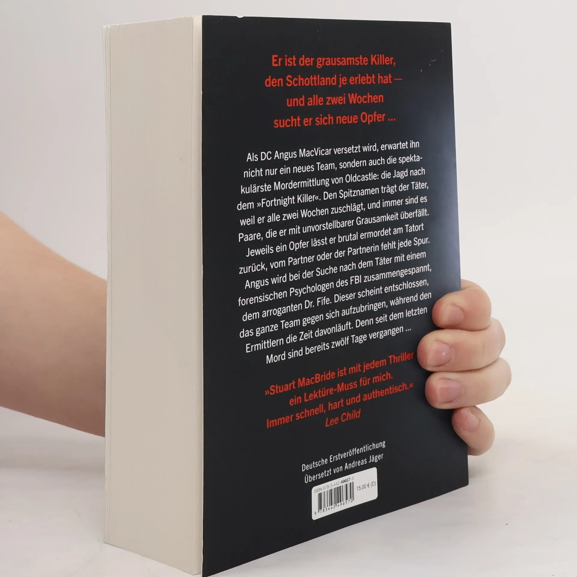 Er ist der grausamste Killer, den Schottland je erlebt hat - und alle zwei Wochen sucht er sich neue Opfer ... »Stuart MacBride ist mit jedem Thriller ein Lektüre-Muss für mich. Immer schnell, hart und authentisch.« Lee Child Als DC Angus MacVicar versetzt wird, erwartet ihn nicht nur ein neues Team, sondern auch die spektakulärste Mordermittlung von Oldcastle: die Jagd nach dem „Fortnight Killer“. Den Spitznamen trägt der Täter, weil er alle zwei Wochen zuschlägt, und immer sind es Paare, die er mit unvorstellbarer Grausamkeit überfällt. Jeweils ein Opfer lässt er brutal ermordet am Tatort zurück, vom Partner oder der Partnerin fehlt jede Spur. Angus wird bei der Suche nach dem Täter mit einem forensischen Psychologen des FBI zusammengespannt, dem arroganten Dr. Fife. Dieser scheint entschlossen, das ganze Team gegen sich aufzubringen, während den Ermittlern die Zeit davonläuft. Denn seit dem letzten Mord sind bereits zwölf Tage vergangen ...