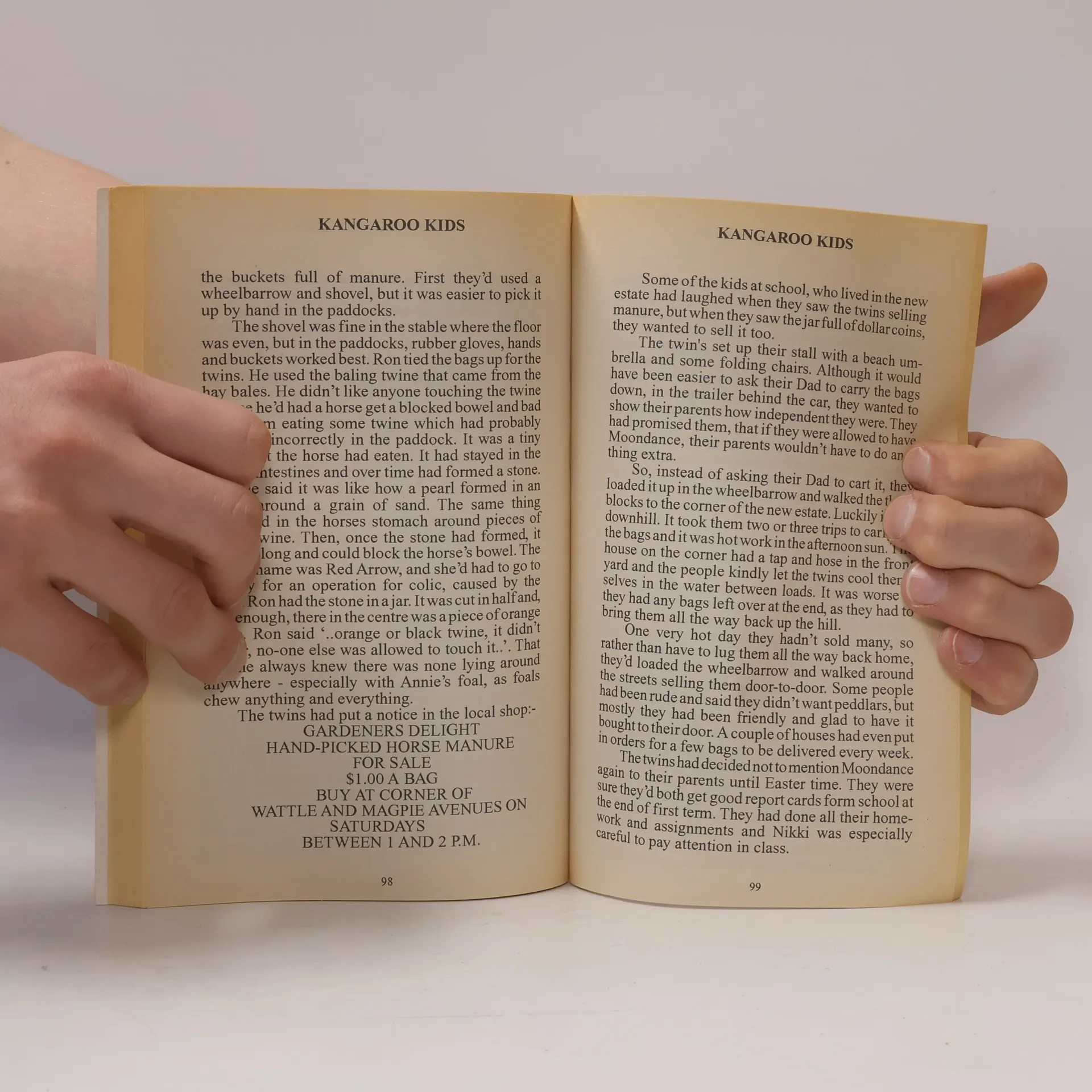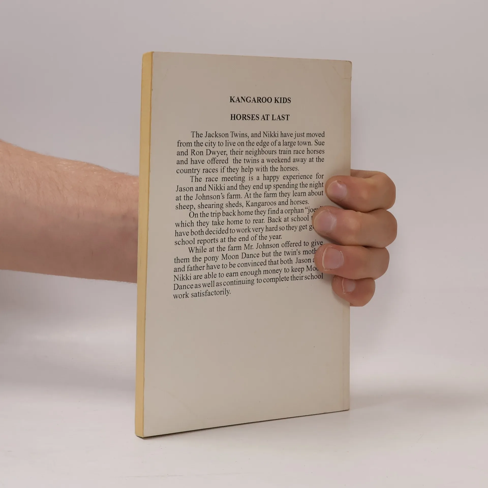 The Jackson Twins, Jason and Nikki have just moved from the city to live on the edge of a large town. Sue and Ron Dwyer, their neighbours train race horses and have offered the twins a weekend away at the country races if they help with the horses.The race meeting is a happy experience for Jason and Nikki and they end up spending the night at the Johnson's farm. At the farm they learn about sheep, shearing sheds, Kangaroos and horses.On the trip back home they find a orphan "joey" which they take home to rear. Back at school they have both decided to work very hard so they get good school reports at the end of the year.While at the farm Mr. Johnson offered to give them the pony Moon Dance but the twins's mother and father have to be convinced that both Jason and Nikki are able to earn enough money to keep Moon Dance as well as continuing to complete their school work satisfactorily.