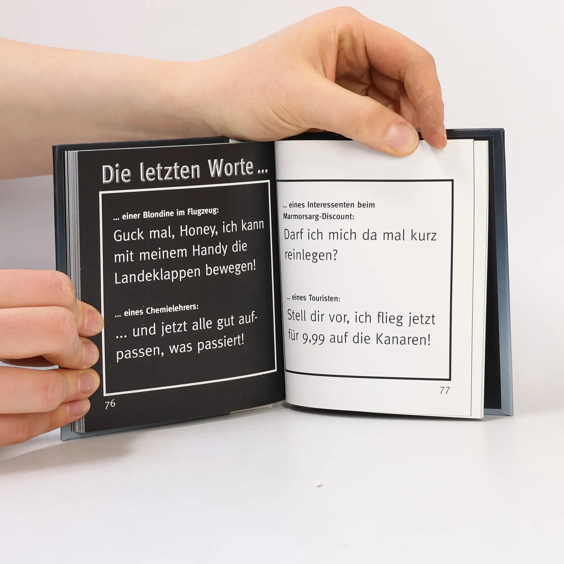 Was könnten die letzten Worte eines Baumfällers sein? „Keine Angst, der fällt zur anderen Seite!“ Was könnten die letzten Worte eines Beifahrers sein? „Rechts ist frei!“. und die einer Eintagsfliege? „Wie spät ist es?“ Ein Buch, über das wir nicht viele Worte verlieren müssen! Ein Volltreffer des schwarzen Humors, genial makaber illustriert von Tony Husband, einem Cartoonisten, der britischen Humor mit der Muttermilch aufgesogen hat.