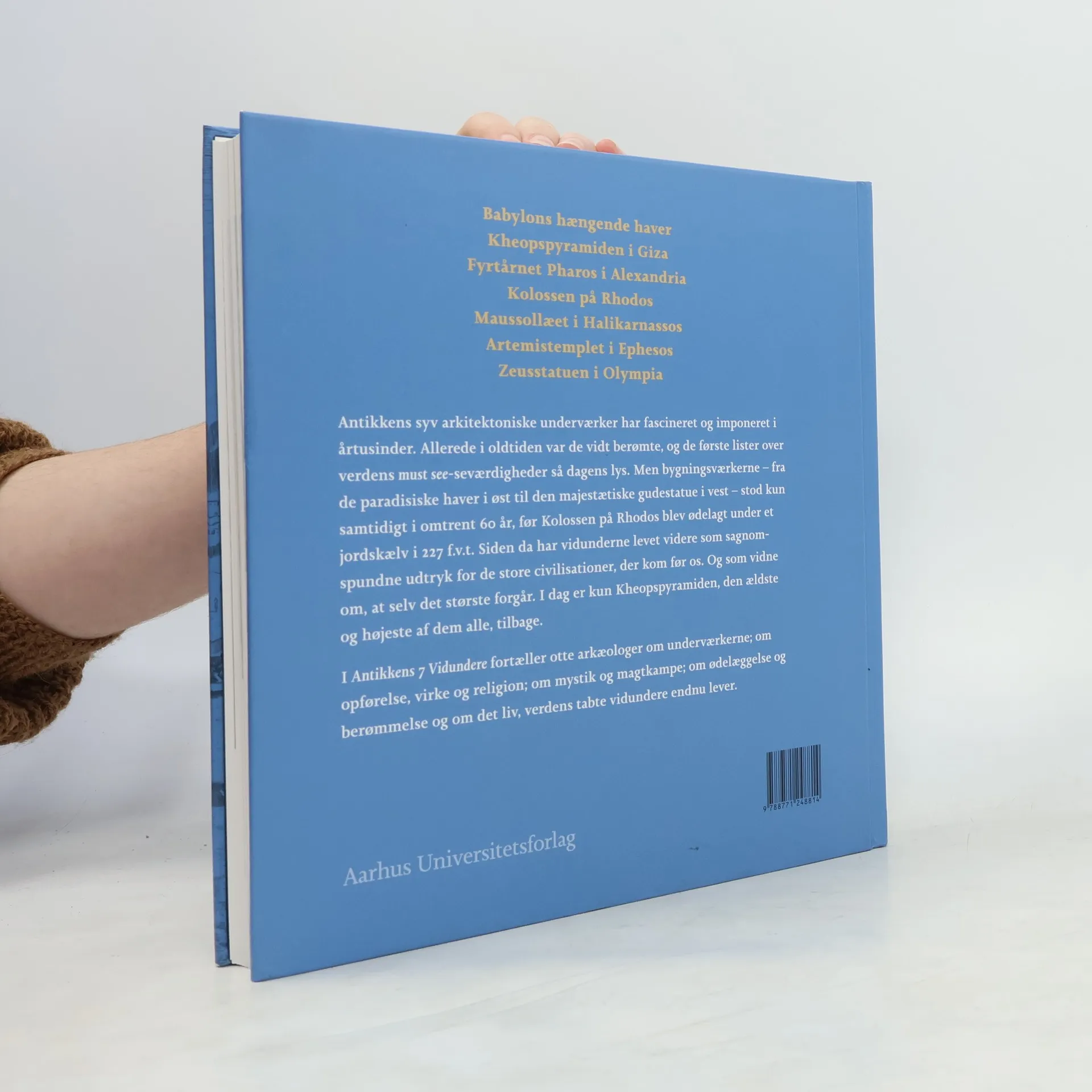 60 ar. Omtrent sa lAenge stod Verdens 7 Vidundere samtidigt for over 2000 ar siden. Alligevel er Verdens 7 Vidundere sa overvAeldende pragtvAerker, at de lige siden har ligget i toppen af alverdens must see-lister. Allerede i oldtiden forte lAerde lister over de ypperste, menneskeskabte sevAerdigheder. Men som en antik forfatter skrev: De syv undere kender alle af omtale, men det er de fAerreste, der har set dem ved selvsyn. Nu kan vi komme tAettere pa bygningsvAerkerne. I Antikkens 7 Vidundere tager 8 Danishske arkAeologer lAeseren med pa en rejse til de 7 undervAerker og deres historie. Selvom kun Kheopspyramiden star tilbage i dag, er der stof til fascinerende fortAellinger i de andre vidunderes righoldige arkAeologiske rester.