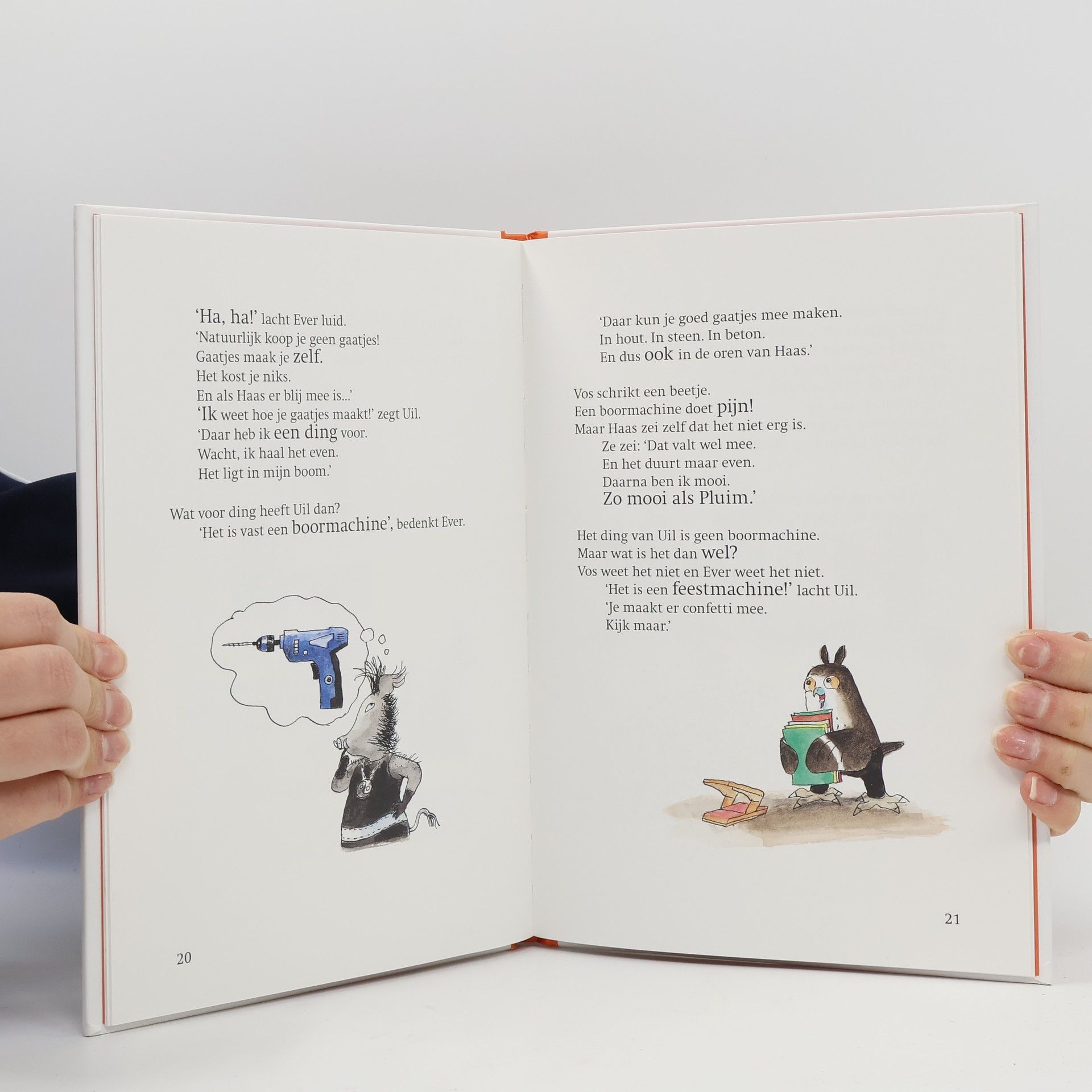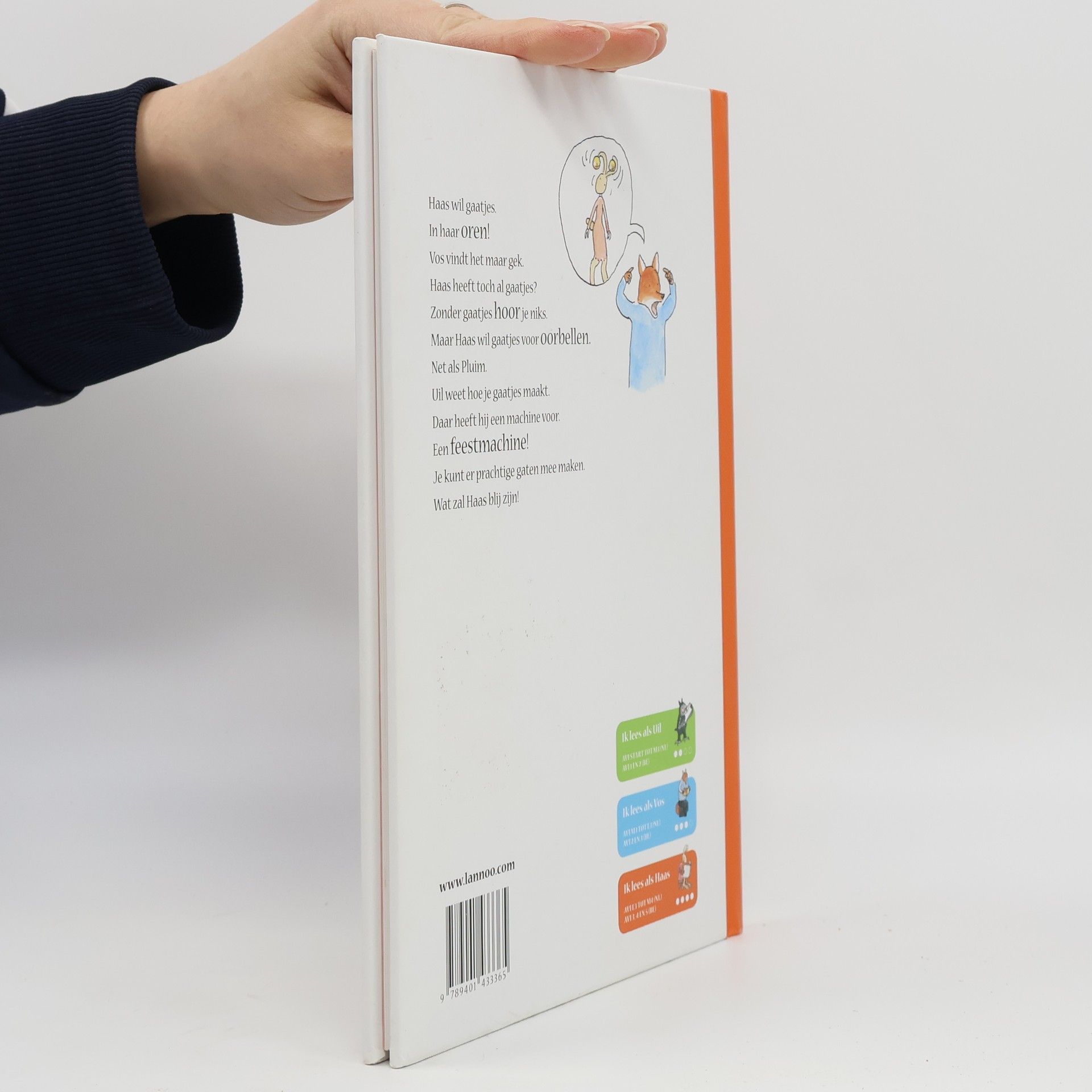 Haas wil gaatjes. In haar oren! Vos vindt het maar gek. Haas heeft toch al gaatjes? Zonder gaatjes hoor je niks. Maar Haas wil gaatjes voor oorbellen. Net als Pluim. Uil weet hoe je gaatjes maakt. Daar heeft hij een machine voor. Een feestmachine! Je kunt er prachtige gaten mee maken. Wat zal Haas blij zijn!