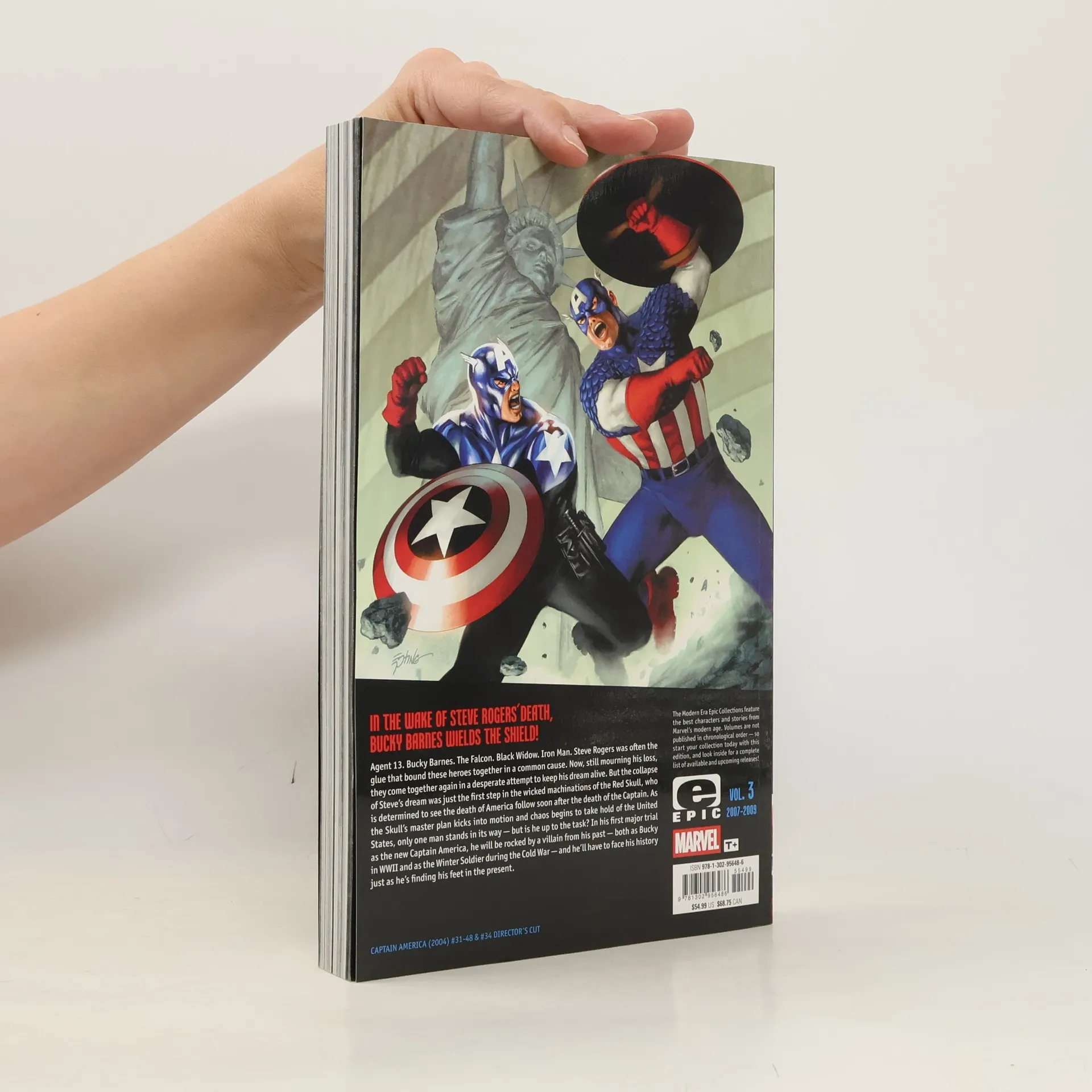 In the wake of Steve Rogers' tragic death, Bucky Barnes wields the shield and succeeds his fallen friend as Captain America! Agent 13. Bucky Barnes. The Falcon. Black Widow. Iron Man. Steve Rogers was often the glue that bound these heroes together in a common cause. Now, still mourning his loss, they come together again in a desperate attempt to keep his dream alive. But the collapse of Steve's dream was just the first step in the wicked machinations of the Red Skull, who is determined to see the death of America follow soon after the death of the Captain. As the Skull's master plan kicks into motion and chaos begins to take hold of the United States, only one man stands in its way -- but is he up to the task? In his first major trial as the new Captain America, he will be rocked by a villain from his past -- both as Bucky in WWII and as the Winter Soldier during the Cold War -- and he'll have to face his history just as he's finding his feet in the present. COLLECTING: Captain America (2004) 31-48, 34 Director's Cut