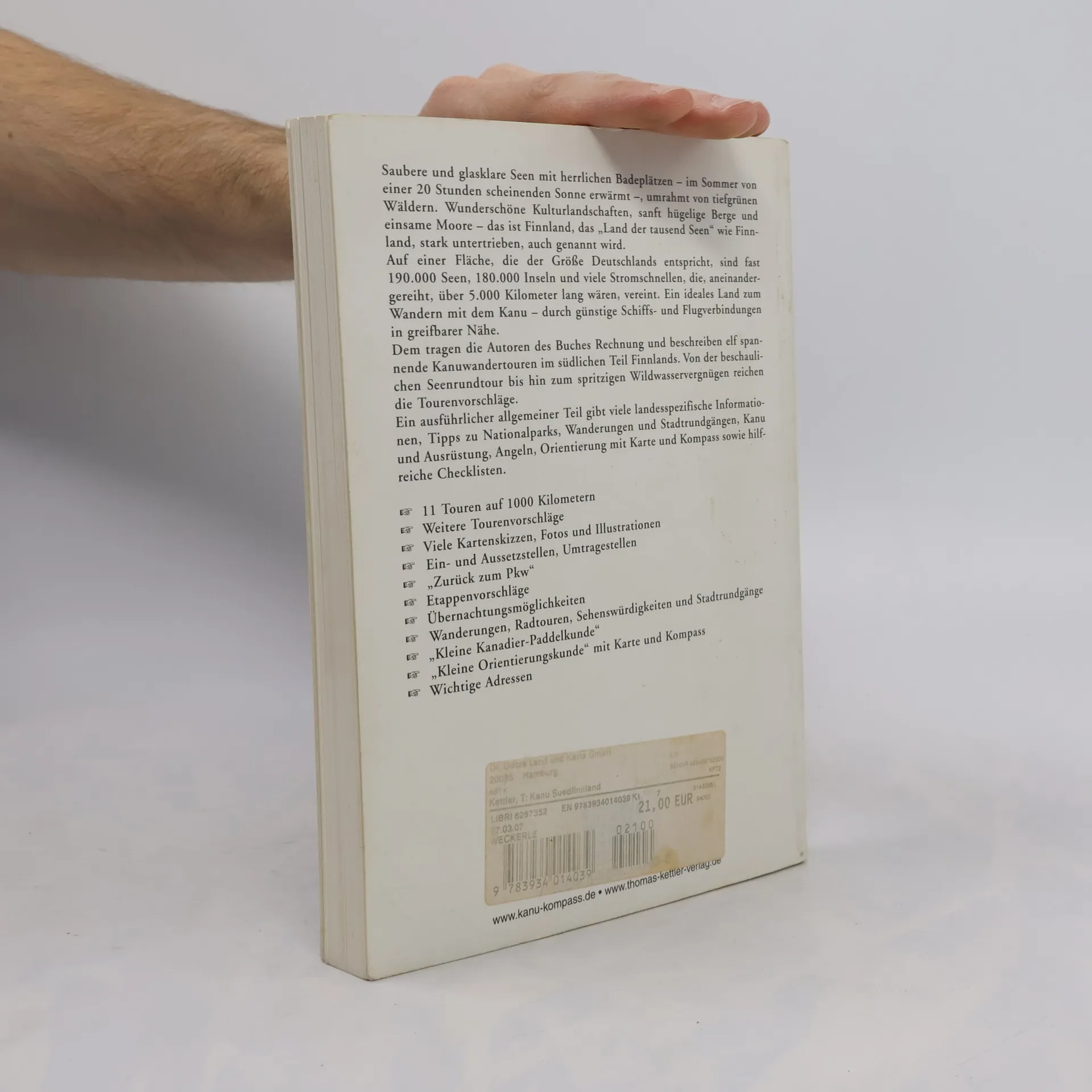 Das Reisehandbuch zum Kanuwandern „Land der tausend Seen“ wird Finnland stark untertrieben genannt, durch günstige Schiffs- und Flugverbindungen in greifbare Nähe gerückt. Saubere und glasklare Seen mit herrlichen Badeplätzen, im Sommer von einer 20 Stunden scheinenden Sonne erwärmt, umrahmt von tiefgrünen Wäldern. Wunderschöne Kulturlandschaften, sanft hügelige Berge und einsame Moore ? Das ist Finnland. Auf der Fläche Deutschlands sind fast 190.000 Seen, 180.000 Inseln und viele Stromschnellen, die aneinandergereiht über 5.000 Kilometer lang wären, vereint. Somit bietet sich das Land in idealer Weise zum Wandern mit dem Kanu an! Elf spannende Kanutouren sowie zahlreiche weitere Tourenvorschläge, von der beschaulichen Seenrundtour bis hin zum spritzigen Wildwasservergnügen, stellen die Autoren in der Reihe KANU KOMPASS vor. Über die Ålandinseln, die Westfinnische Seenplatte, das Saimaa-Seengebiet bis nach Karelien führen sie den Kanuwanderer durch einen herrlichen Paddelsommer. Ein ausführlicher allgemeiner Teil gibt viele landesspezifische Informationen, Tipps zu Nationalparks, Wanderungen und Stadtrundgängen, Kanu und Ausrüstung, Angeln, Orientierung mit Karte und Kompass sowie zahlreiche Checklisten.