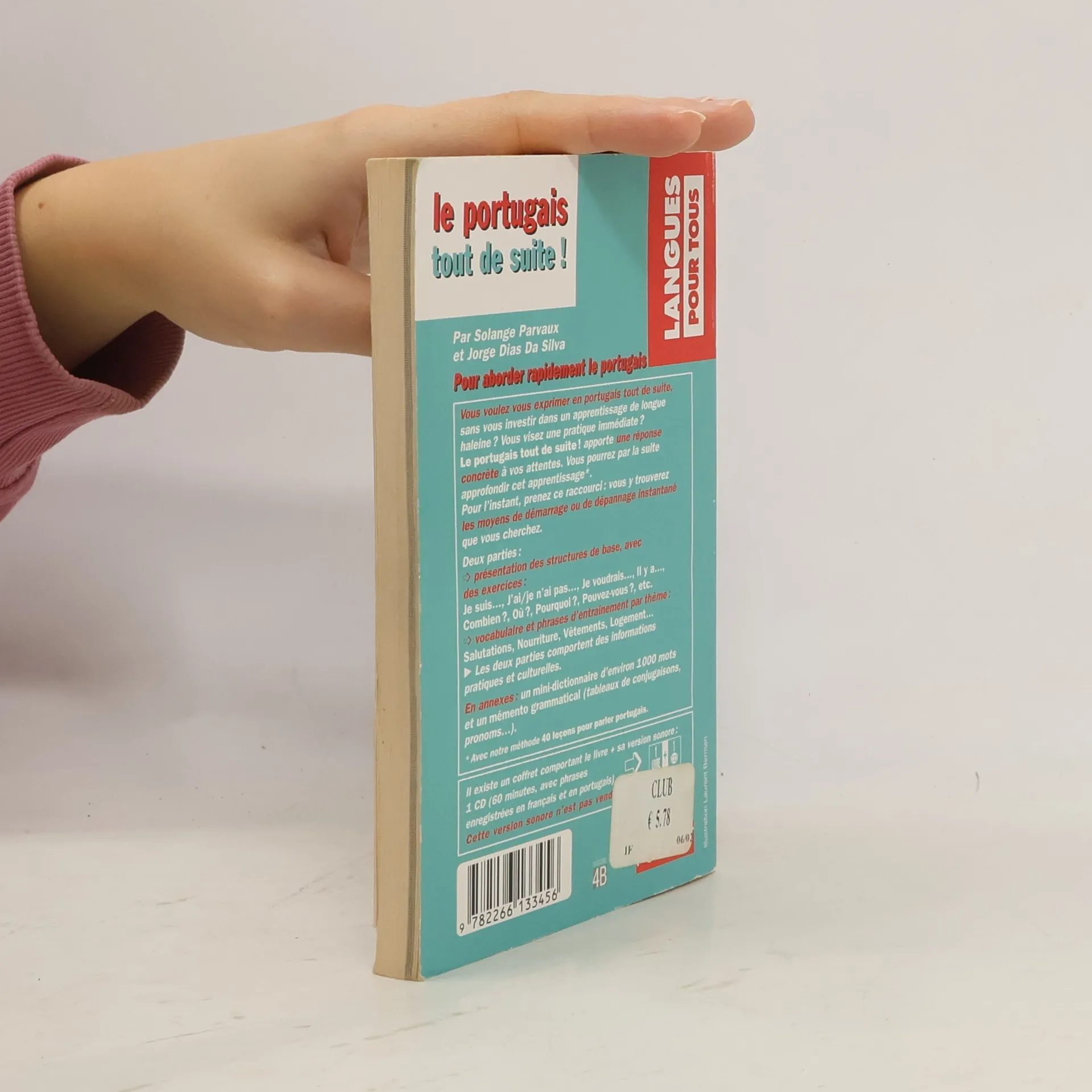Vous voulez vous exprimer en portugais tout de suite sans vous investir dans un apprentissage de longe haleine ? Vous visez une pratique immédiate ? Le portugais tout de suite ! apporte une réponse concrète à vos attentes. Vous pourrez par la suite approfondir cet apprentissage. Pour l'instant, prenez ce raccourci : vous y trouverez les moyens de démarrage ou de dépannage instantanés que vous cherchez. Deux parties : présentation des structures de base, avec des exercices, vocabulaire et phrases d'entraînement par thèmes. Les deux parties comportent des informations pratiques et culturelles. En annexes : un mini-dictionnaire d'environ 1000 mots et un mémento grammatical (tableaux de conjugaisons, pronoms...)