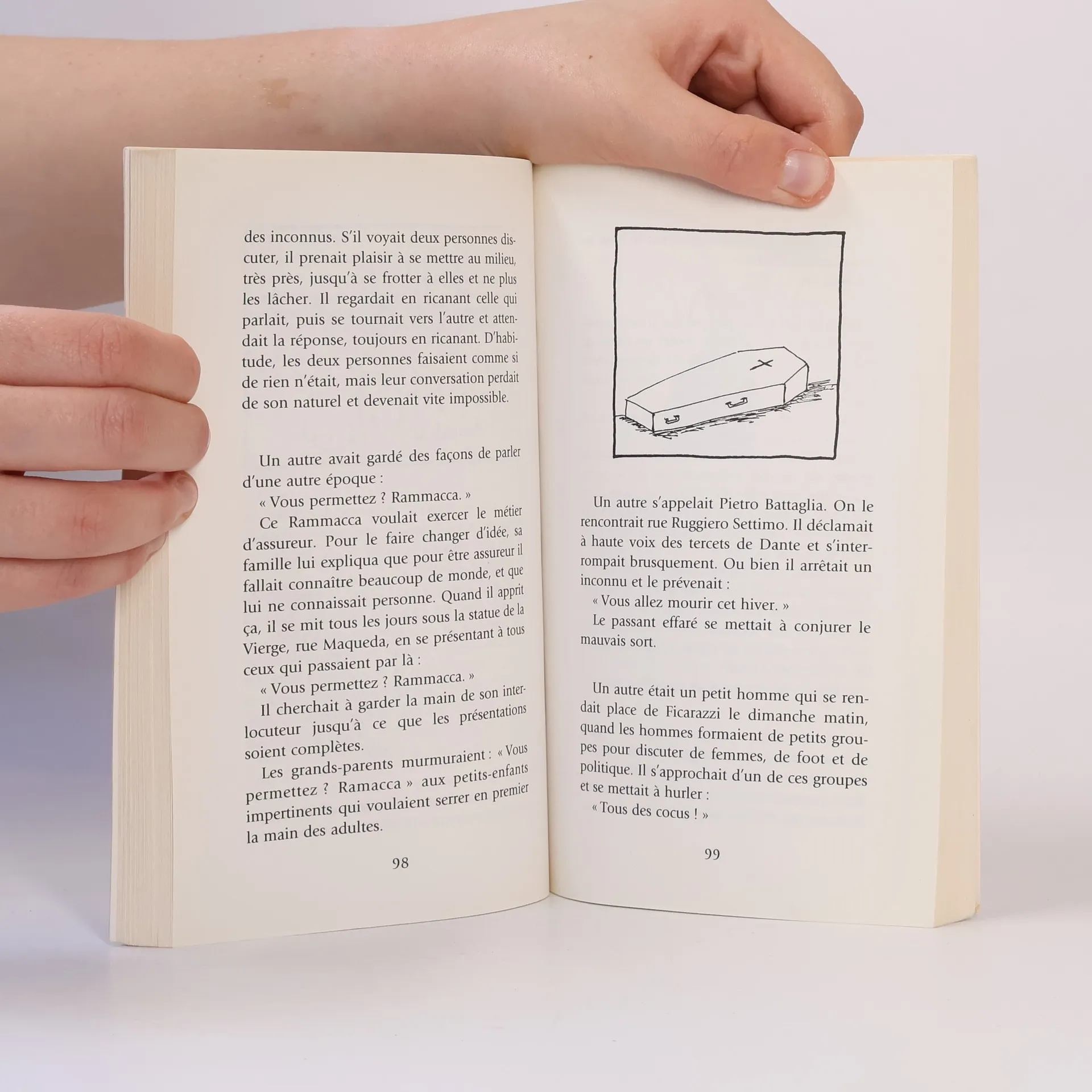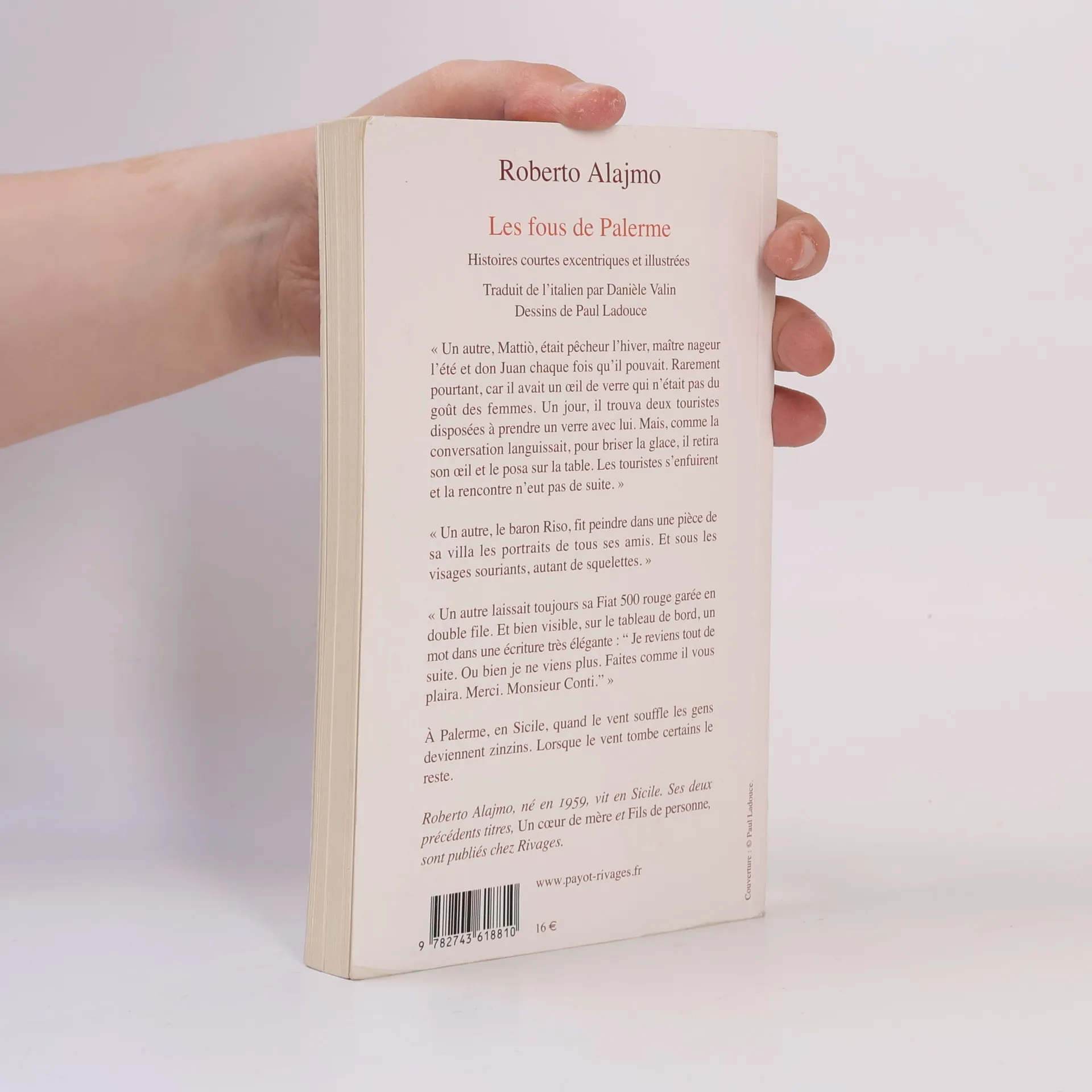 "Un autre, Mattio, était pêcheur l''hiver, maître nageur l''été et don Juan chaque fois qu''il pouvait. Rarement pourtant, car il avait un oeil de verre qui n''était pas du goût des femmes. Un jour, il trouva deux touristes disposées à prendre un verre avec lui. Mais, comme la conversation languissait, pour briser la glace, il retira son oeil et le posa sur la table. Les touristes s''enfuirent et la rencontre n''eut pas de suite.""Un autre, le baron Riso, fit peindre dans une pièce de sa villa les portraits de tous ses amis. Et sous les visages souriants, autant de squelettes.""Un autre laissait toujours sa Fiat 500 rouge garée en double file. Et bien visible, sur le tableau de bord, un mot dans une écriture très élégante : "Je reviens de tout de suite. Ou bien, je ne viens plus. Faites comme il vous plaira. Merci. Monsieur Conti."A Palerme, en Sicile, quand le vent souffle les gens deviennent zinzins. Lorsque le vent tombe, certains le restent.