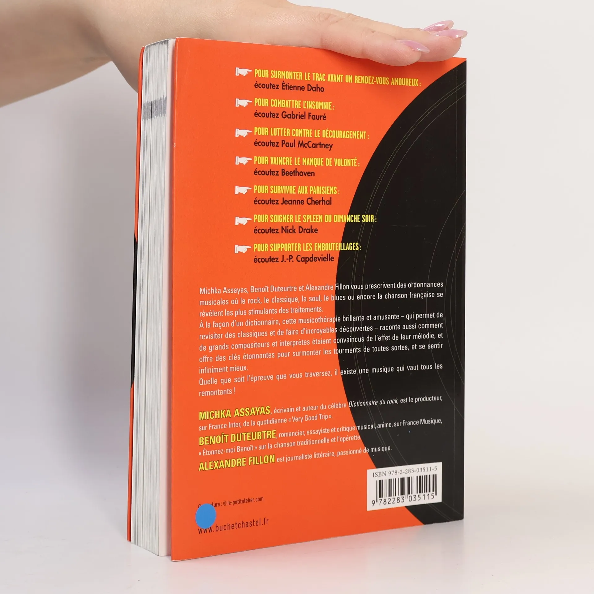 Michka Assayas, Benoît Duteurtre et Alexandre Fillon vous prescrivent des ordonnances musicales où le rock, le classique, la soul, le blues ou encore la chanson française se révèlent les plus stimulants des traitements.À la façon d'un dictionnaire, cette musicothérapie brillante et amusante - qui permet de revisiter des classiques et de faire d'incroyables découvertes - raconte aussi comment de grands compositeurs et interprètes étaient convaincus de l'effet de leur mélodie, et offre des clés étonnantes pour surmonter les tourments de toute sorte, et se sentir infiniment mieux. Quelle que soit l'épreuve que vous traversez, il existe une musique qui vaut tous les remontants !