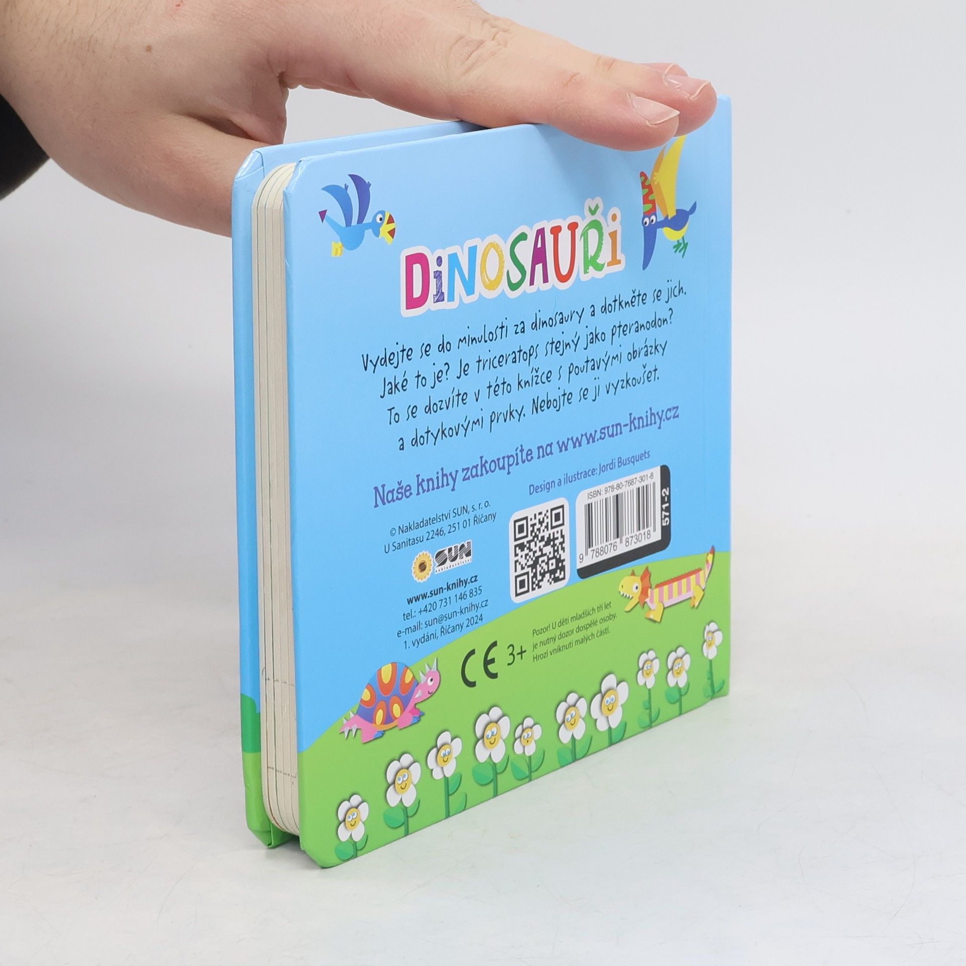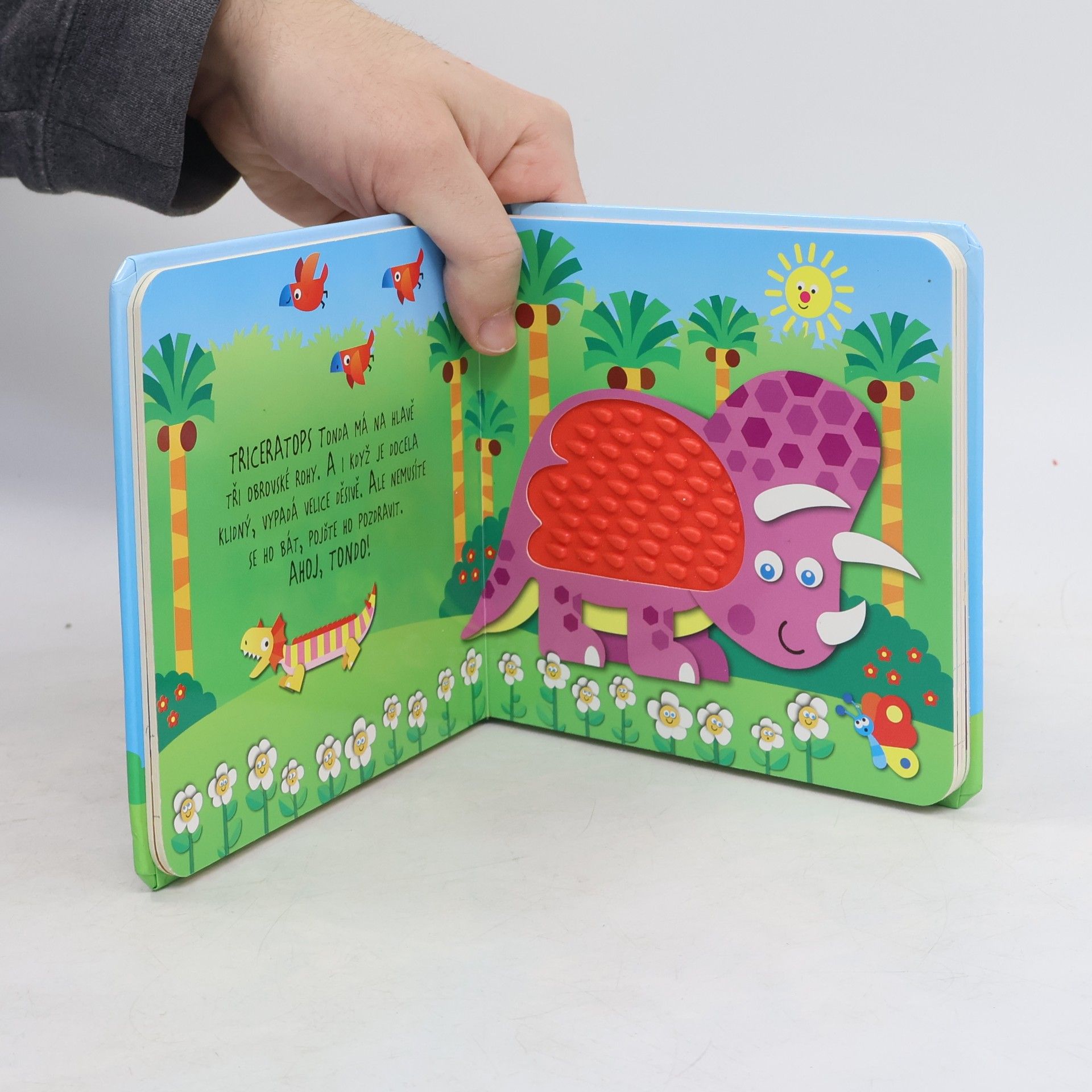 Haptická knížka s pevnými listy a pestrobarevnými obrázky dinosaurů.