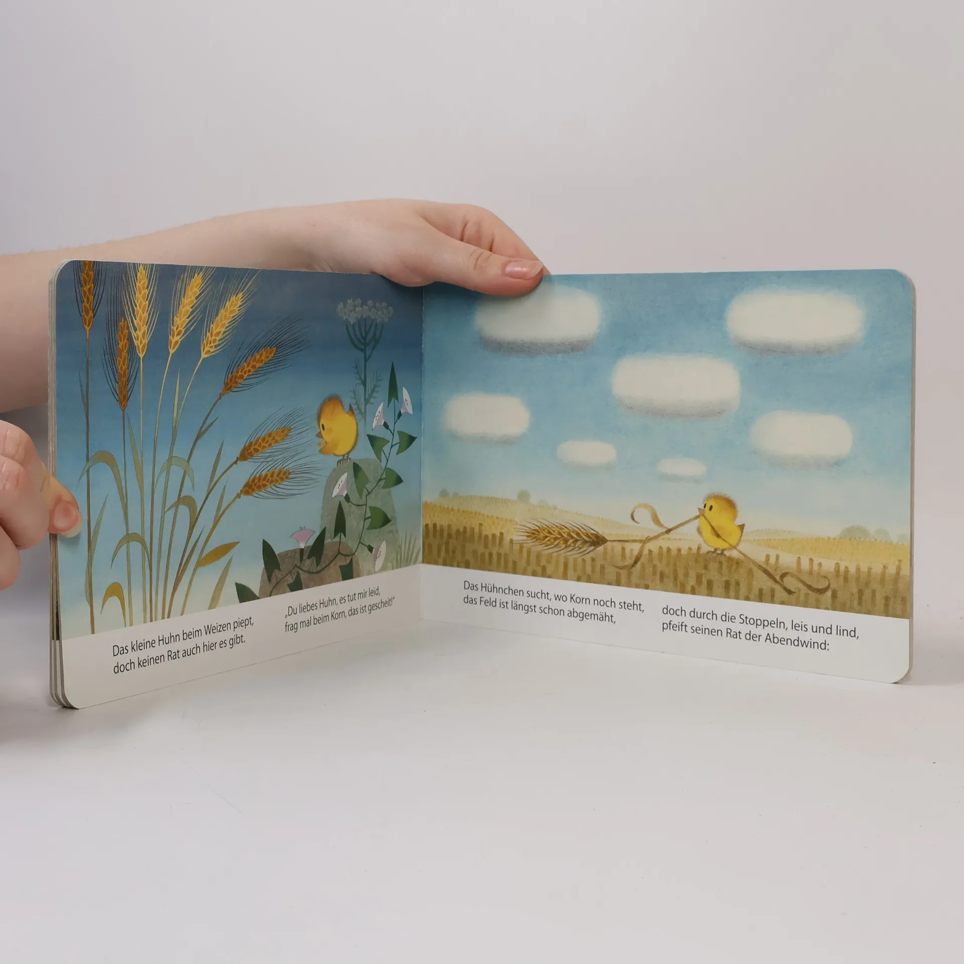 Ein kleines Küken irrt umher und sucht den Weg nach Hause. Hafer, Gerste, Weizen und der leise Abendwind helfen ihm und alles wird gut: „Das Küken hüpft hinab den Hügel und unter Mutters warme Flügel.“