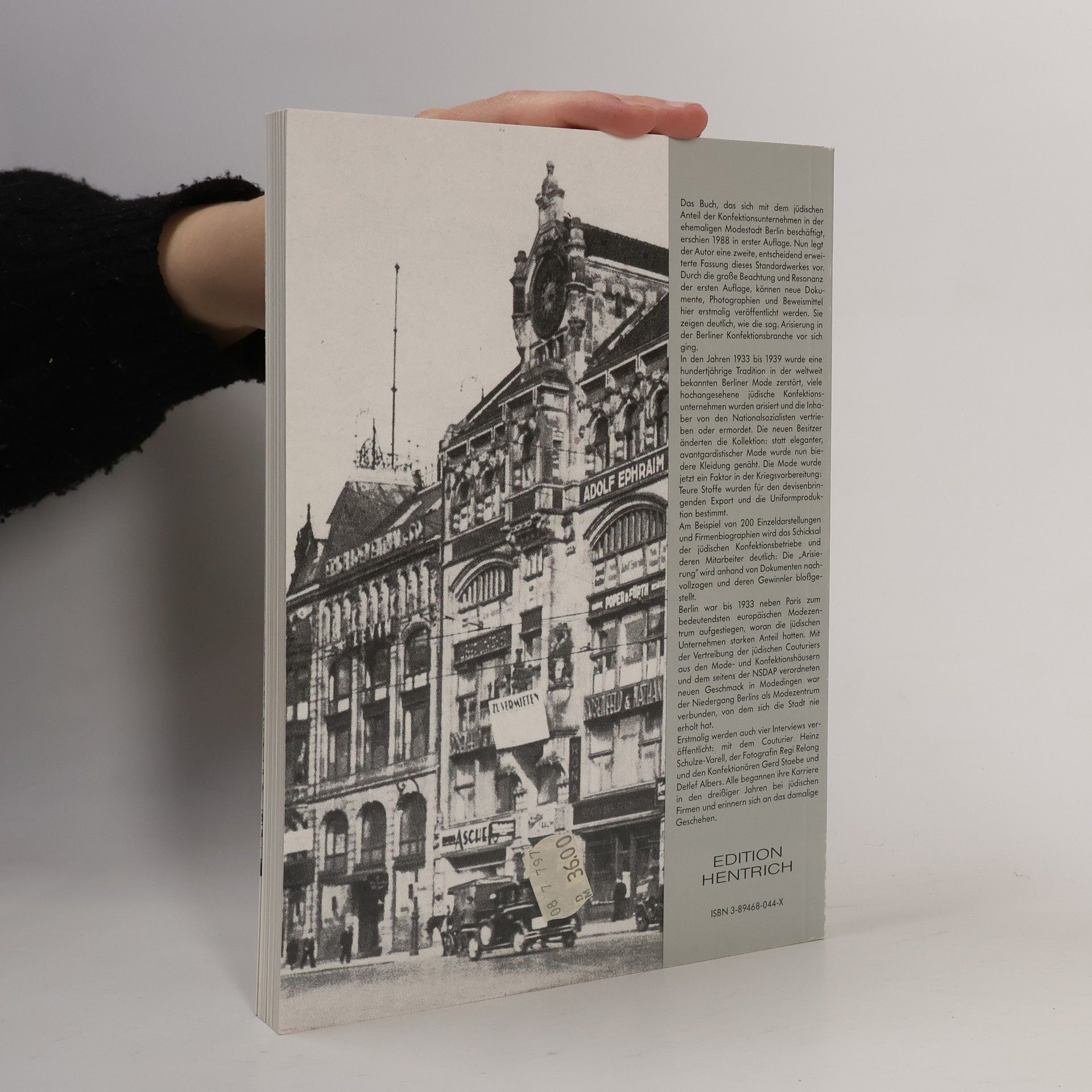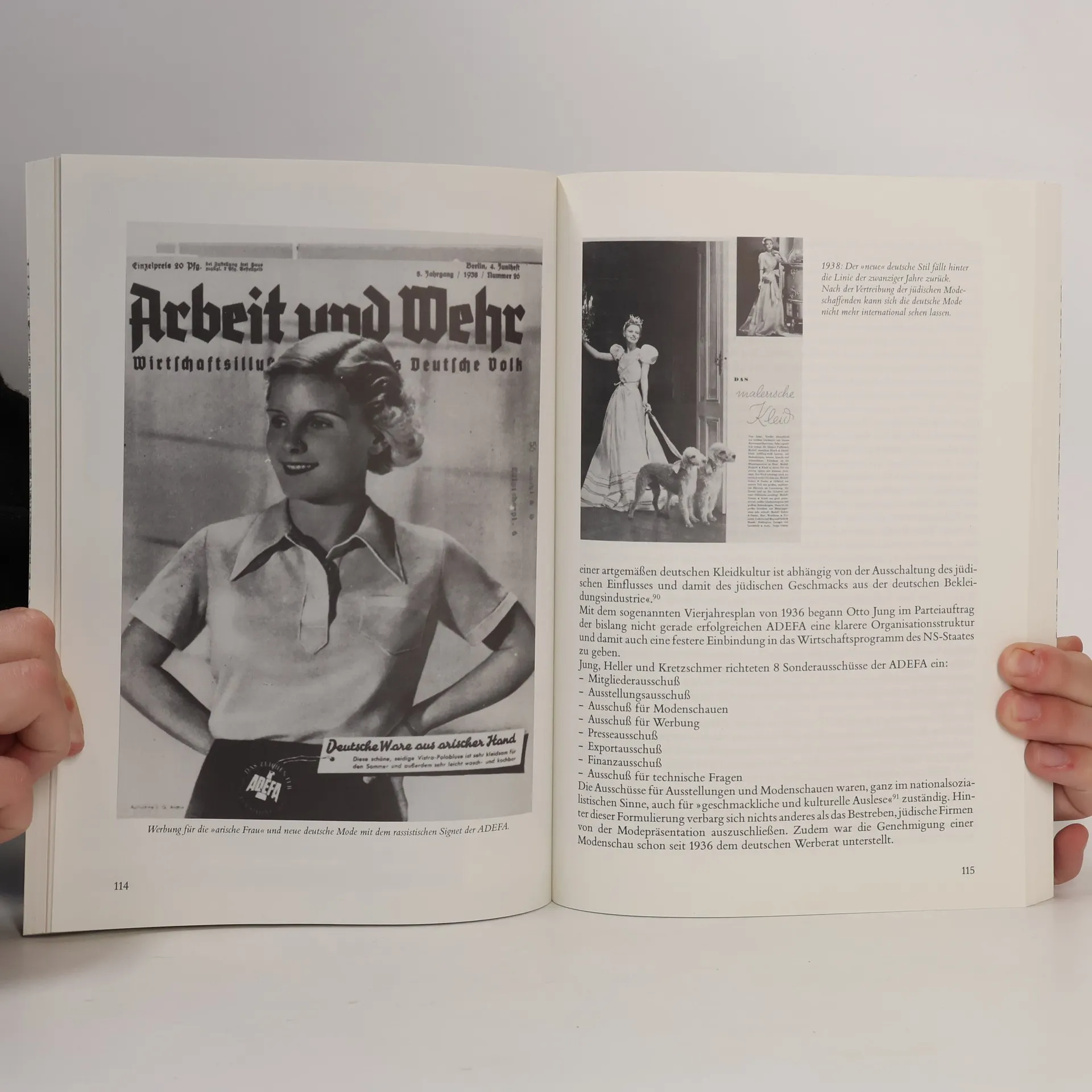 Chronicles the part of the Jews in the rise of the ladies' fashion industry in Berlin. Estimates that before 1933 about 50% of the industry was in Jewish hands, but Nazi propaganda claimed that it was 80% and called on German women to prefer Aryan fashion. Gradually Jews were edged out of the industry by boycotts, by the efforts of the ADEFA (the organization of German-Aryan clothing manufacturers), by prohibitions on Jewish firms to advertise or stage fashion shows, and finally by the destruction of their wares in the "Kristallnacht" pogrom and by the ensuing legislation. The firms were Aryanized and most of the Jewish owners and employees emigrated; those who did not were drafted for forced labor until deported. Contains many accounts of individuals and a list of the Aryanized firms and their new owners.