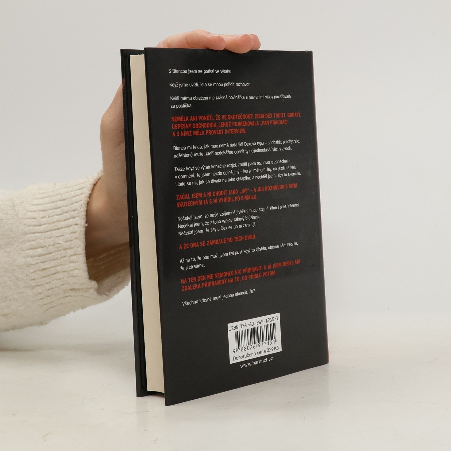 S Biancou jsem se potkal ve výtahu. Když jsme uvízli, jela se mnou pořídit rozhovor. Kvůli mému oblečení mě krásná novinářka s havraními vlasy považovala za poslíčka. Neměla ani ponětí, že ve skutečnosti jsem Dex Truitt, bohatý, úspěšný obchodník, jehož pojmenovala “Pan Pracháč”― jehož jela odpoledne navštívit. Bianca mi řekla, jak moc nemá ráda lidi Dexova typu―snobské, přechytralé, nažehlené muže, kteří nedokáží ocenit ty nejjednodušší věci v životě. Takže když se výtah konečně rozjel, zrušil jsem rozhovor a zanechal ji v domnění, že jsem někdo úplně jiný ― cyklistický kurýr jménem Jay. Líbilo se mi, jak se dívala na toho chlapíka, a nechtěl jsem, aby to skončilo. Začal jsem s ní chodit jako “Jay”― a její rozhovor s mým skutečným já jsem s ní vyřídil po e-mailu. Nečekal jsem, že naše vzájemné jiskření bude stejně silné i přes internet. Nečekal jsem, že z toho vzejde takový blázinec. Nečekal jsem, že Jay a Dex se do ní zamilují. A že ona se zamiluje do těch dvou. Až na to, že oba dva jsem byl já. A když to zjistila, oběma nám hrozilo, že ji ztratíme. Na ten den mě nemohlo nic připravit. A já jsem nebyl ani zdaleka připraven na to, co přišlo potom. Všechno krásné musí jednou skončit, že? Až na to, že blížící se konec mezi námi jsem nezaznamenal.