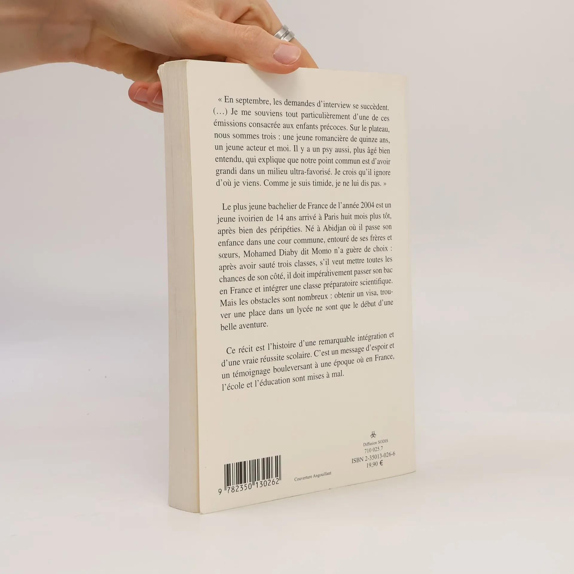 " En septembre, les demandes d'interview se succèdent. [...] Je me souviens tout particulièrement d'une de ces émissions consacrée aux enfants précoces. Sur le plateau, nous sommes trois : une jeune romancière de quinze ans, un jeune acteur et moi. Il y a un psy aussi, plus âgé bien entendu, qui explique que notre point commun est d'avoir grandi dans un milieu ultra-favorisé. Je crois qu'il ignore d'où je viens. Comme je suis timide, je ne lui dis pas. " Le plus jeune bachelier de France de l'année 2004 est un jeune ivoirien de 14 ans arrivé à Paris huit mois plus tôt, après bien des péripéties. Né à Abidjan où il passe son enfance dans une cour commune, entouré de ses frères et sœurs, Mohamed Diaby dit Momo n'a guère de choix après avoir sauté trois classes, s'il veut mettre toutes les chances de son côté, il doit impérativement passer son bac en France et intégrer une classe préparatoire scientifique. Mais les obstacles sont nombreux : obtenir un visa, trouver une place dans un lycée ne sont que le début d'une belle aventure. Ce récit est l'histoire d'une remarquable intégration et d'une vraie réussite scolaire. C'est un message d'espoir et un témoignage bouleversant à une époque où en France, l'école et l'éducation sont mises à mal.