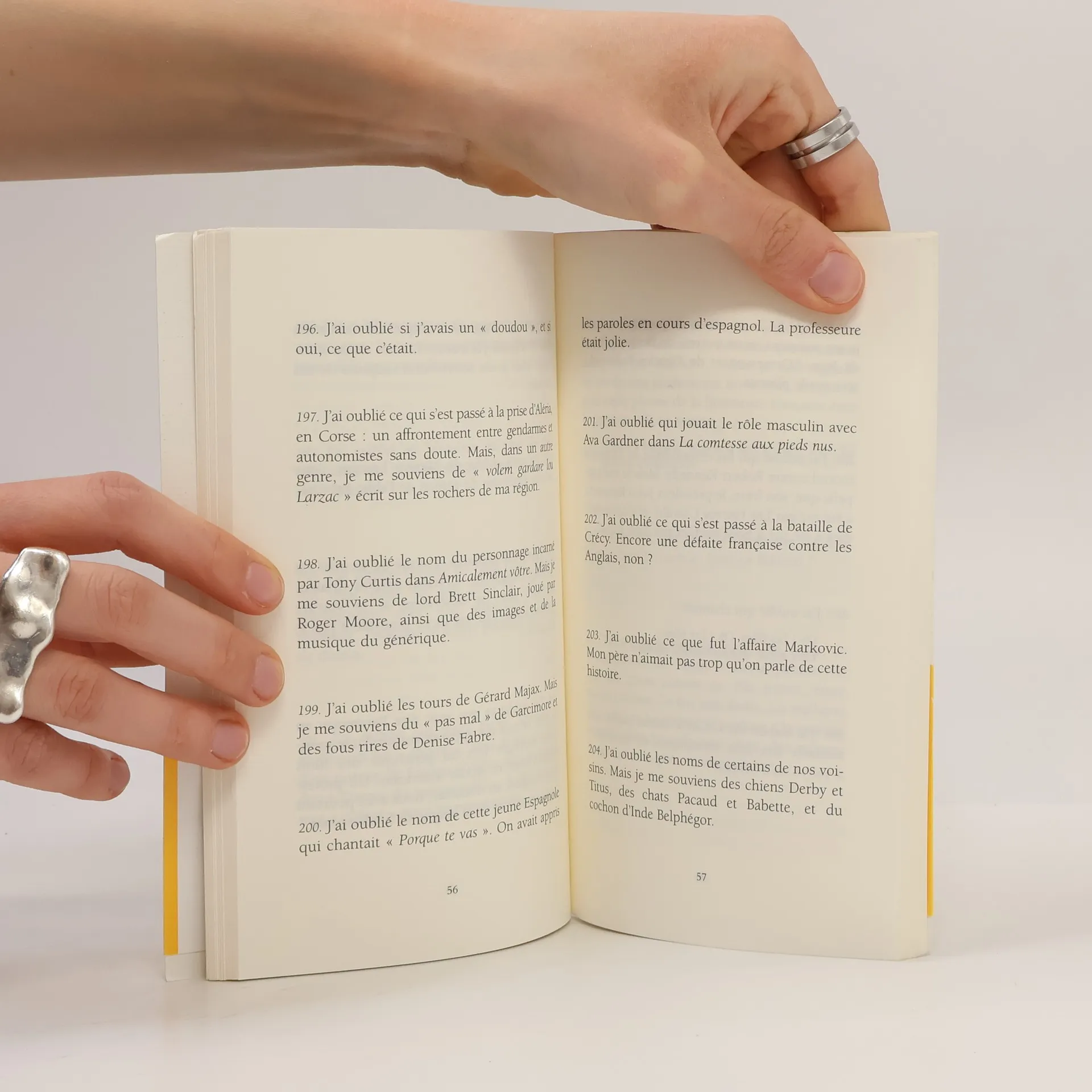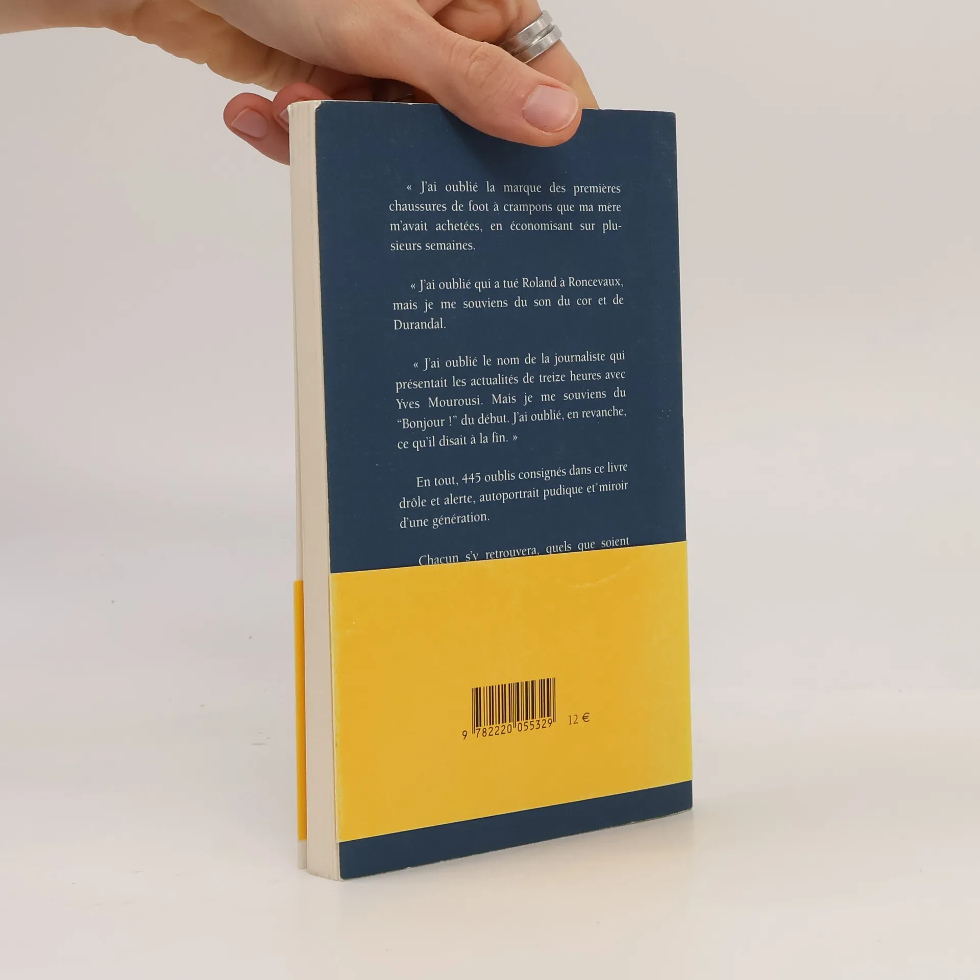 " J'ai oublié la marque des premières chaussures de foot à crampons que ma mère m'avait achetées, en économisant sur plusieurs semaines. " J'ai oublié qui a tué Roland à Roncevaux, mais je me souviens du son du cor et de Durandal. " J'ai oublié le nom de la journaliste qui présentait les actualités de treize heures avec Yves Mourousi. Mais je me souviens du " Bonjour ! " du début. J'ai oublié, en revanche, ce qu'il disait à la fin. " En tout, 445 oublis consignés dans ce livre drôle et alerte, autoportrait pudique et miroir d'une génération. Chacun s'y retrouvera, quels que soient son âge et la fidélité de sa mémoire.