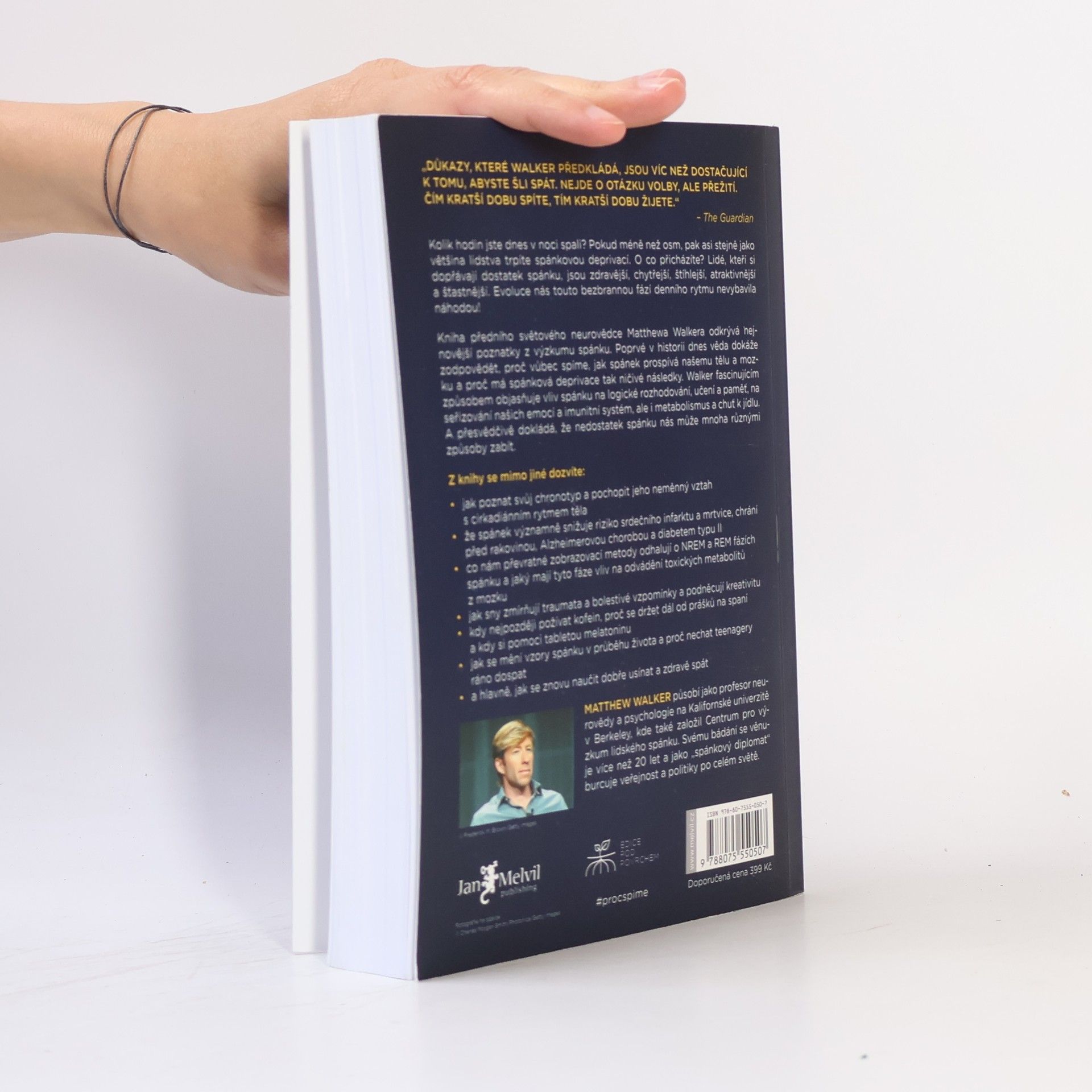 Co kdybyste zjistili, že elixír mládí, krásy, zdraví a dobré nálady spočívá v kvalitním spánku? Profesor neurologie a psychologie Matthew Walker z Berkeley prozkoumal tajemství spánku a jeho klíčový vliv na náš život. Klade otázku, proč příroda nutí všechny živočichy trávit tolik času v bezbranném stavu, a odpověď je jasná: spánek přináší nespočet evolučních výhod, které zajišťují naši existenci. Po přečtení této knihy se neodvážíte svůj spánek zanedbávat. Mnozí považují spánek za ztrátu času, přičemž média často podceňují jeho význam. Walker upozorňuje, že osm hodin spánku je pro většinu lidí minimem, a přibližně osmdesát procent populace žije ve spánkové deprivaci. Důkazy o negativních dopadech nedostatku spánku na jednotlivce i společnost jsou v knize shrnuty. Kvalitní spánek přináší výhody jako efektivní učení, logické myšlení a vyrovnání emocí. Podporuje imunitu, metabolismus a reguluje chuť k jídlu. Důležité jsou i sny, které zpracovávají emocionální zážitky a podporují kreativitu. Walker se také zabývá vlivem alkoholu a kofeinu na spánek, změnami spánkových rytmů v různých životních fázích a radami, jak zlepšit spánek a potlačit nespavost. Kniha apeluje na firmy a vlády, aby začaly spánek vnímat jako klíčový faktor zdraví a pracovního výkonu.