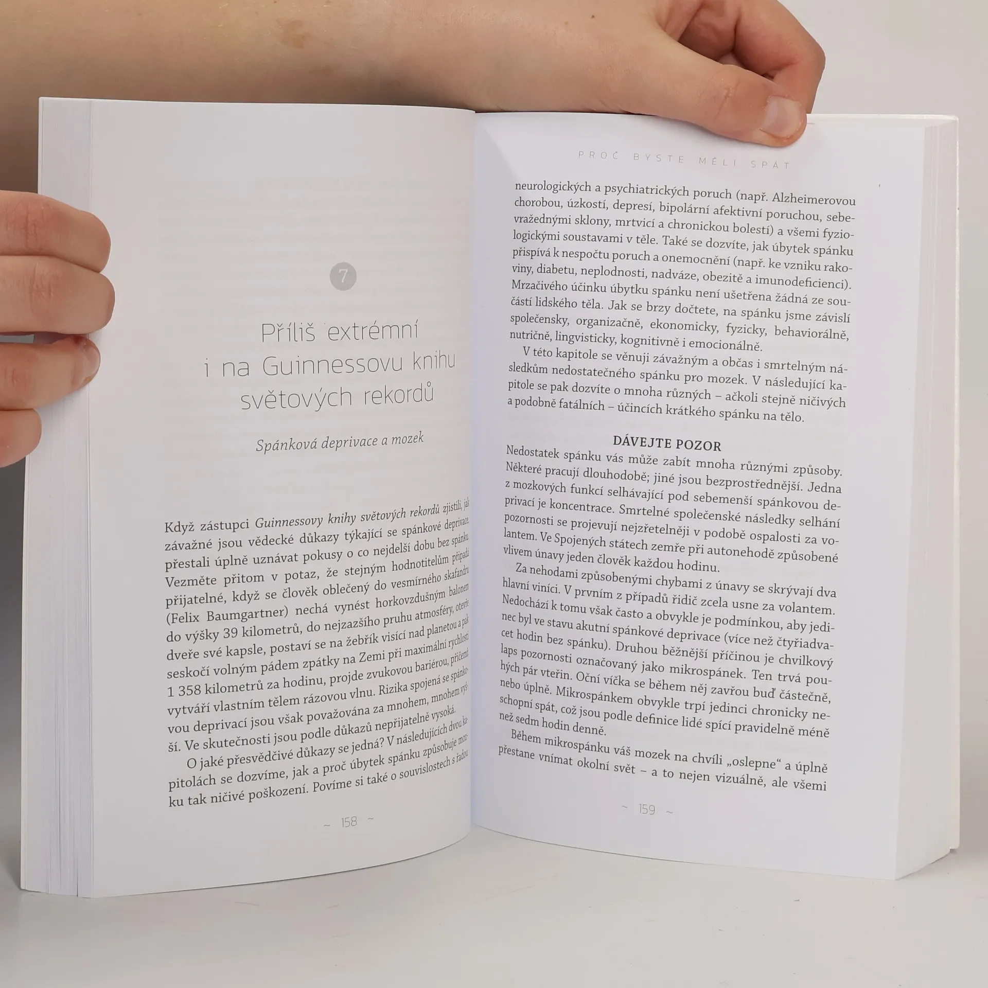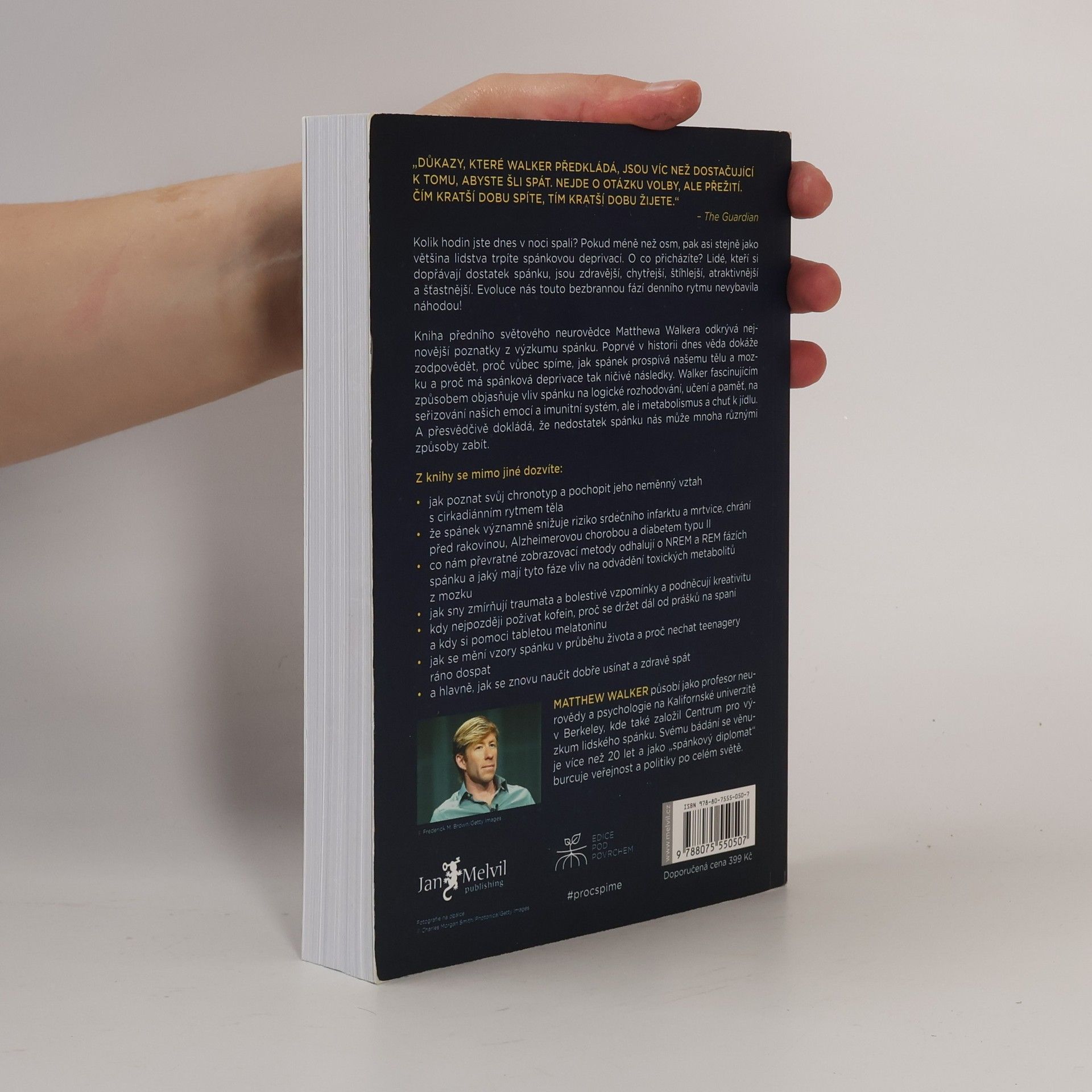 Co kdybyste zjistili, že elixír mládí, krásy, zdraví a dobré nálady spočívá v kvalitním spánku? Profesor neurologie a psychologie Matthew Walker z Berkeley prozkoumal tajemství spánku a jeho klíčový vliv na náš život. Klade otázku, proč příroda nutí všechny živočichy trávit tolik času v bezbranném stavu, a odpověď je jasná: spánek přináší nespočet evolučních výhod, které zajišťují naši existenci. Po přečtení této knihy se neodvážíte svůj spánek zanedbávat. Mnozí považují spánek za ztrátu času, přičemž média často podceňují jeho význam. Walker upozorňuje, že osm hodin spánku je pro většinu lidí minimem, a přibližně osmdesát procent populace žije ve spánkové deprivaci. Důkazy o negativních dopadech nedostatku spánku na jednotlivce i společnost jsou v knize shrnuty. Kvalitní spánek přináší výhody jako efektivní učení, logické myšlení a vyrovnání emocí. Podporuje imunitu, metabolismus a reguluje chuť k jídlu. Důležité jsou i sny, které zpracovávají emocionální zážitky a podporují kreativitu. Walker se také zabývá vlivem alkoholu a kofeinu na spánek, změnami spánkových rytmů v různých životních fázích a radami, jak zlepšit spánek a potlačit nespavost. Kniha apeluje na firmy a vlády, aby začaly spánek vnímat jako klíčový faktor zdraví a pracovního výkonu.
