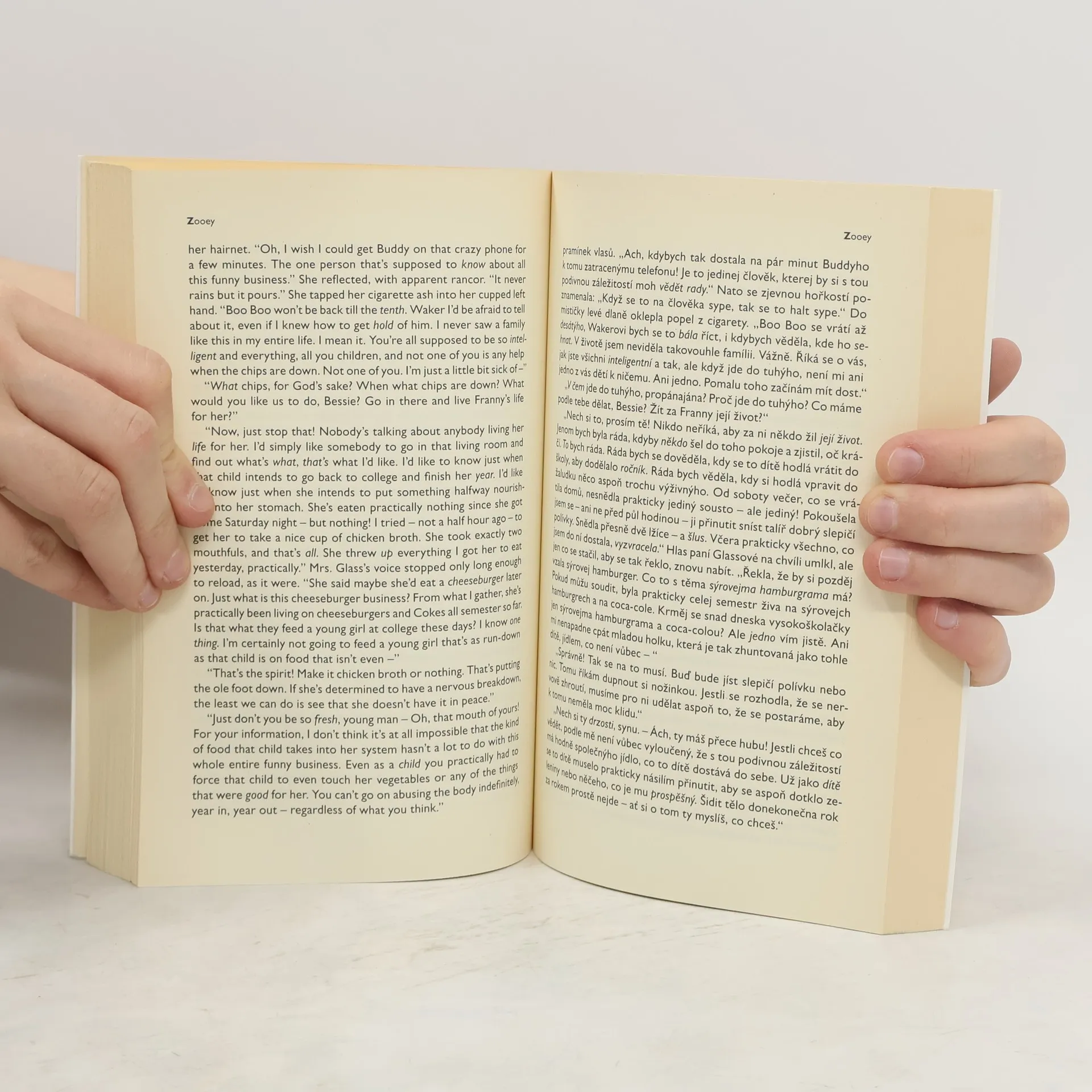 Bilingvní vydání mistrovsky napsaného díla. Přemýšlivý a hluboký vhled do života sourozenců Glassových formou rozhovorů o smyslu života, víře, odvaze a zodpovědnosti budou čtenáři moci ocenit jak v originálním znění, tak ve výborném překladu manželů Pellarových.