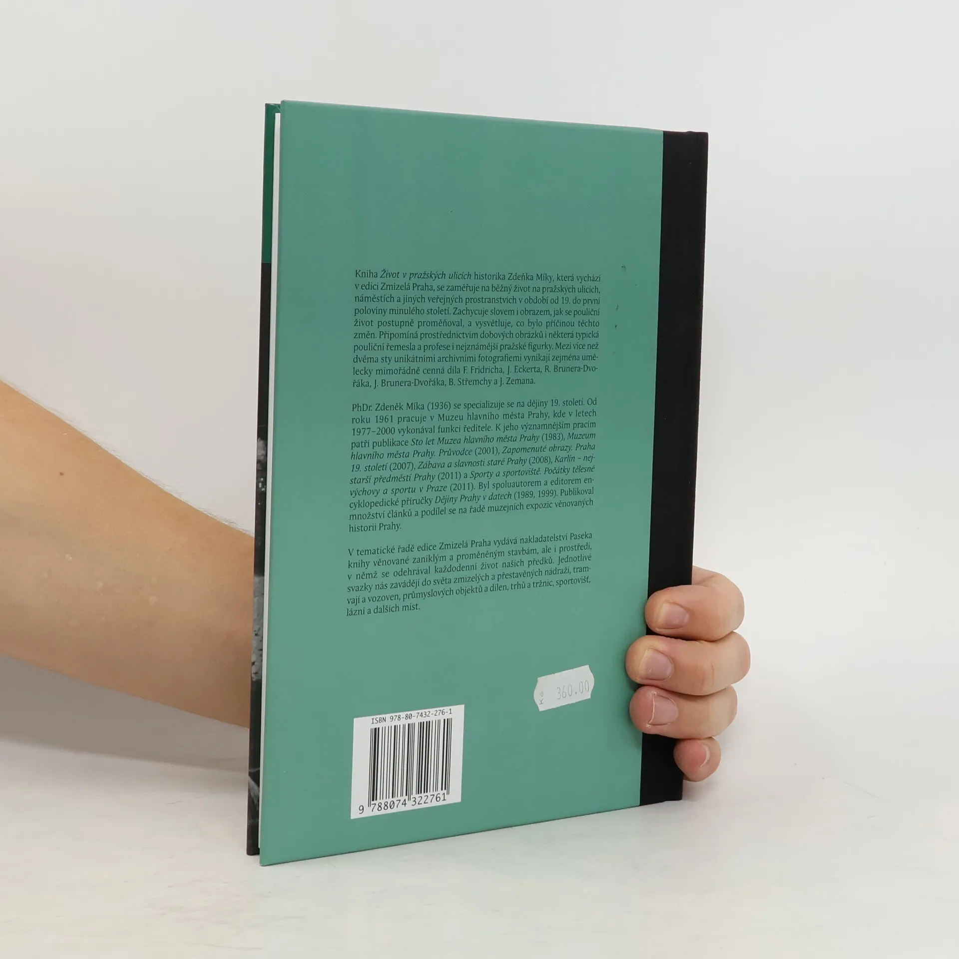 Další titul z edice Zmizelá Praha nazvaný Život v pražských ulicích historika Zdeňka Míky se tentokrát zaměřuje na běžný život na pražských ulicích, náměstích a jiných veřejných prostranstvích v období od konce 19. století až do poloviny století minulého. Zachycuje slovem i obrazem, jak se pouliční život postupně proměňoval, a vysvětluje, co bylo příčinou těchto změn. Připomíná prostřednictvím dobových obrázků i některá typická pouliční řemesla a profese i nejznámější pražské figurky. Mezi více než dvěma sty unikátními archivními fotografiemi vynikají zejména umělecky mimořádně cenná díla Z. Reacha, J. Zemana a J. Brunera-Dvořáka.