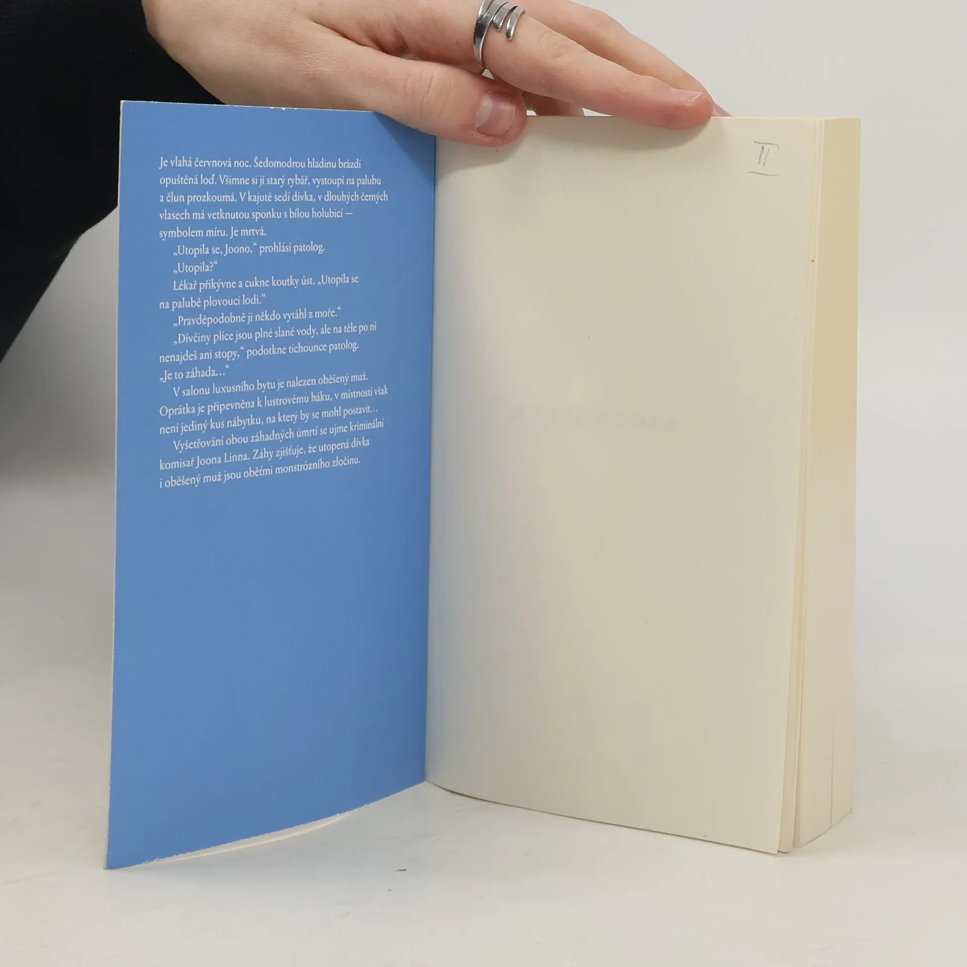 Je vlahá červnová noc. Šedomodrou hladinu brázdí opuštěná loď. Všimne si jí starý rybář, vystoupí na palubu a člun prozkoumá. V kajutě sedí dívka, v dlouhých černých vlasech má vetknutou sponku s bílou holubicí — symbolem míru. Je mrtvá. „Utopila se, Joono,“ prohlásí patolog. „Utopila?“ Lékař přikývne a cukne koutky úst. „Utopila se na palubě plovoucí lodi.“ „Pravděpodobně ji někdo vytáhl z moře.“ „Dívčiny plíce jsou plné slané vody, ale na těle po ní nenajdeš ani stopy,“ podotkne tichounce patolog. „Je to záhada...“ V salonu luxusního bytu je nalezen oběšený muž. Oprátka je připevněna k lustrovému háku, v místnosti však není jediný kus nábytku, na který by se mohl postavit... Vyšetřování obou záhadných úmrtí se ujme kriminální komisař Joona Linna. Záhy zjišťuje, že utopená dívka i oběšený muž jsou oběťmi monstrózního zločinu. Druhý díl série Keplerových detektivních románů je stejně úspěšný jako díl první — Hypnotizér. Práva na knihu byla prodána do čtyřiadvaceti zemí.