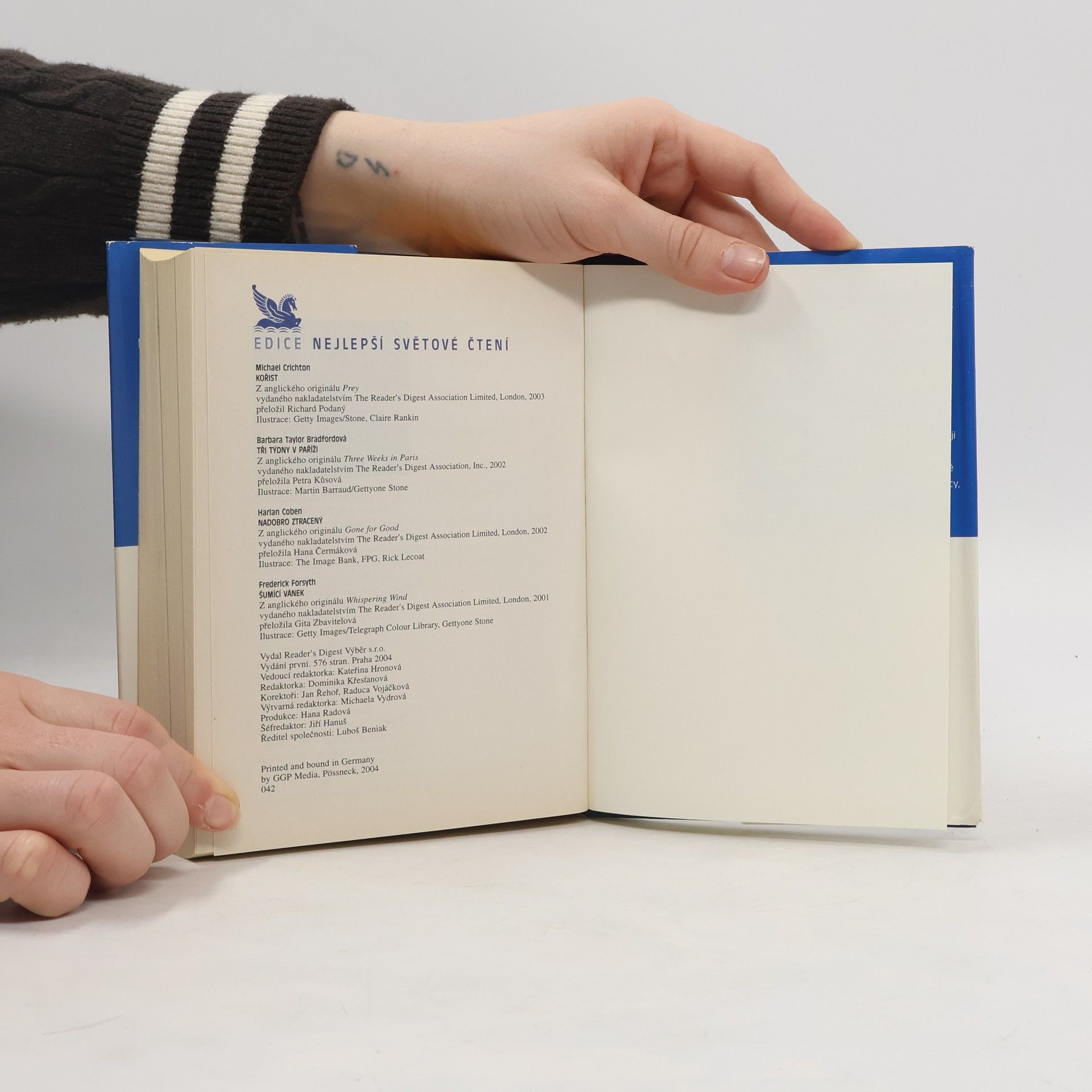 Svazek obsahuje čtyři vybrané romány od současných úspěšných angloamerických autorů ve zkrácené verzi. V knize jsou tyto díla: Frederick Forsyth : Šumící vánek Harlan Coben : Nadobro ztracený Barbara Taylor Bradfordová: Tři týdny v Paříži Michael Crichton : Kořist