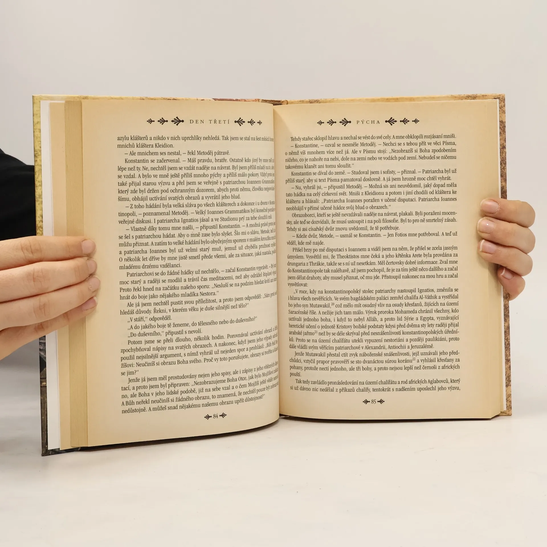 Historický román se odehrává v Římě a líčí poslední dny věrozvěsta Konstantina- Cyrila před jeho smrtí, kdy v rozhovoru s bratrem Metodějem bilancuje svůj život. Formou rozhovoru obou bratří se čtenář může seznámit s celým jejich pohnutým životem. Zatímco starší Metoděj v mládí dělal politickou kariéru, než jej nepřízeň císaře přinutila hledat azyl v klášteře, jeho mladší bratr Konstantin se přímluvou mocného ministerského předsedy císaře Theoktista stal studentem konstantinopolské university a v útlém věku sedmnácti let písařem konstantinopolského patriarchy. Poté, co v tého funkci neuspěl, stal se profesorem na universitě a v doplomatických službách Byzance působil v Bagdádu u chalífy Mutawakila a pak u Chazarů, které se pokoušel obrátit na křesťanskou víru. Až pak jej jeho přítel z mládí patriarcha Fotios poslal na další misi na Velkou Moravu, aby se tam stal věrozvěstem a přinesl slovanskému národu na severu písmo a kázal jim bibli ve srozumitelném jazyce. Poté, co do země vpadla vojska krále Ludvíka, vydali se bratři Konstantin a Metoděj do Říma, aby tu našli pro novou konfesi podporu u papeže. A zde Konstantin onemocněl a vstoupil do kláštera pod jménem Cyril. A zde tedy bilancuje v rozhovoru s bratrem Metodějem celý svůj život. Tak se může čtenář seznámit s osudem, který dokazuje, že člověk se svatým nerodí, ale stává se jím svými činy.