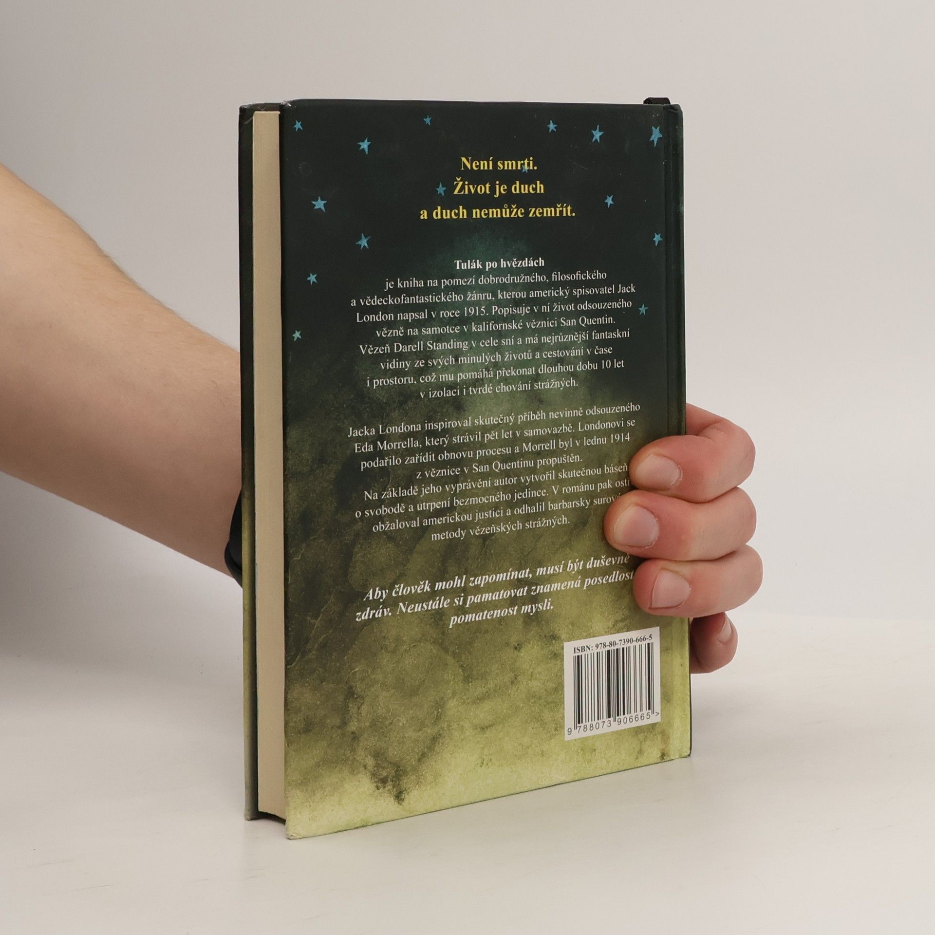 Není smrti. Život je duch a duch nemůže zemřít. Tulák po hvězdách je příběh na pomezí dobrodružného, filosofického a vědeckofantastického žánru, kterou americký spisovatel Jack London napsal v roce 1915. Popisuje v ní život odsouzeného vězně na samotce v kalifornské věznici San Quentin. Vězeň Darell Standing v cele sní a má nejrůznější fantaskní vidiny ze svých minulých životů a cestování v čase i prostoru, což mu pomáhá překonat dlouhou dobu 10 let v izolaci i tvrdé chování strážných Jacka Londona inspiroval skutečný příběh nevinně odsouzeného Eda Morrella, který strávil pět let v samovazbě. Londonovi se podařilo zařídil obnovu procesu a Morrell byl v lednu 1914 z věznice v San Quentinu propuštěn. Na základě jeho vyprávění autor vytvořil skutečnou báseň o svobodě a utrpení bezmocného jedince. V románu pak ostře obžaloval americkou justici a odhalil barbarsky surové metody vězeňských strážných. Aby člověk mohl zapomínat, musí být duševně zdráv. Neustále si pamatovat znamená posedlost, pomatenost mysli. Upravený překlad z roku 1922.